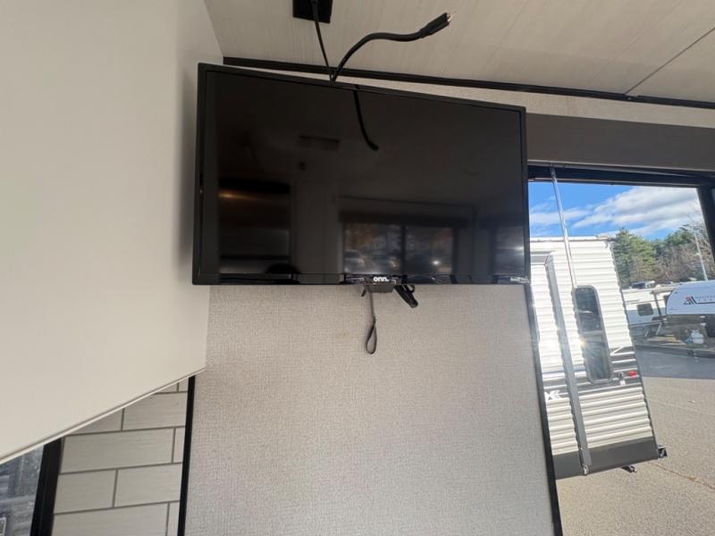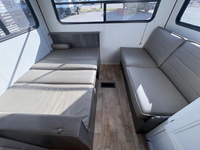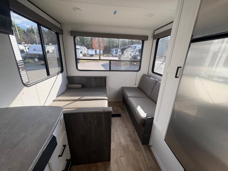 Step inside this smartly designed rear-dinette floorplan and you’ll be greeted with a surprisingly spacious interior that feels open and inviting. The large wraparound dinette at the rear not only offers the perfect place for meals or game nights but also converts into extra sleeping space when needed. Oversized windows surround the living area, filling it with natural light and offering scenic views from every angle of your campsite.