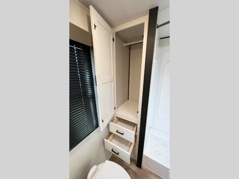 You can hide out for days at a time with this Hideout travel trailer! There is a slide out for extra living space, and the storage below the sofa doubles as seating around the table. Now you'll have three extra seats for dinner time, and they won't even crowd your living space when not in use. The rear bathroom is large and accommodating with its dual-sink vanity, 38" walk-in shower, linen closet, and toilet, and the front private bedroom has a queen-size bed with a laundry chute right next to it for keeping your dirty laundry hidden.