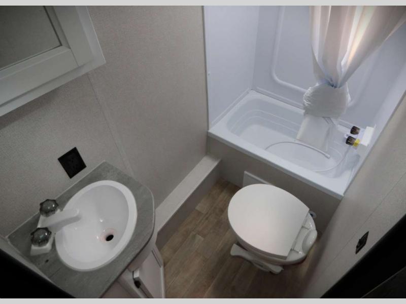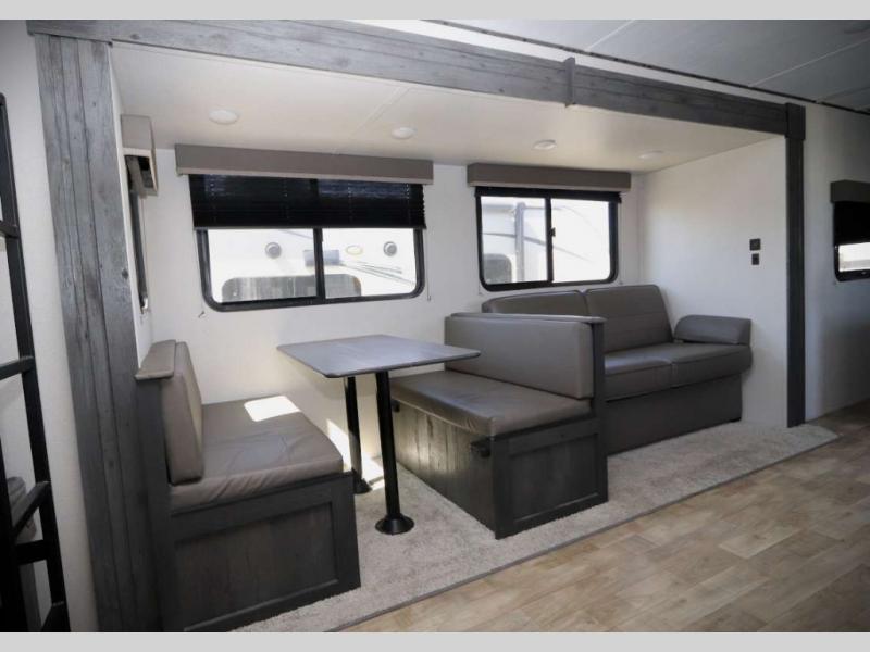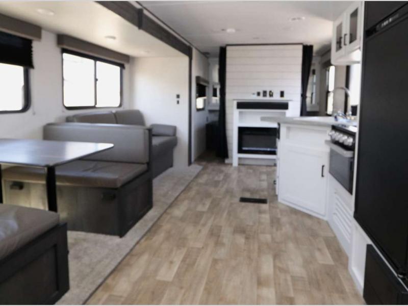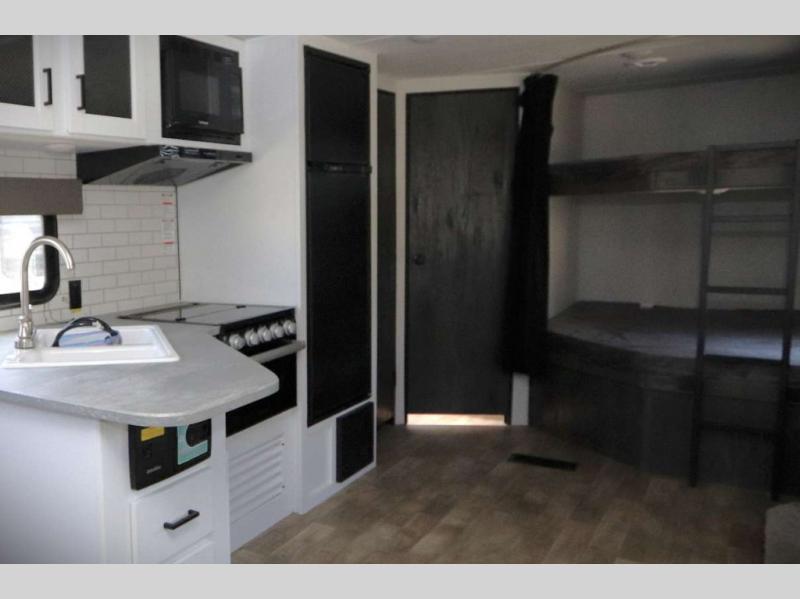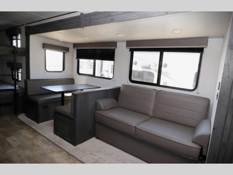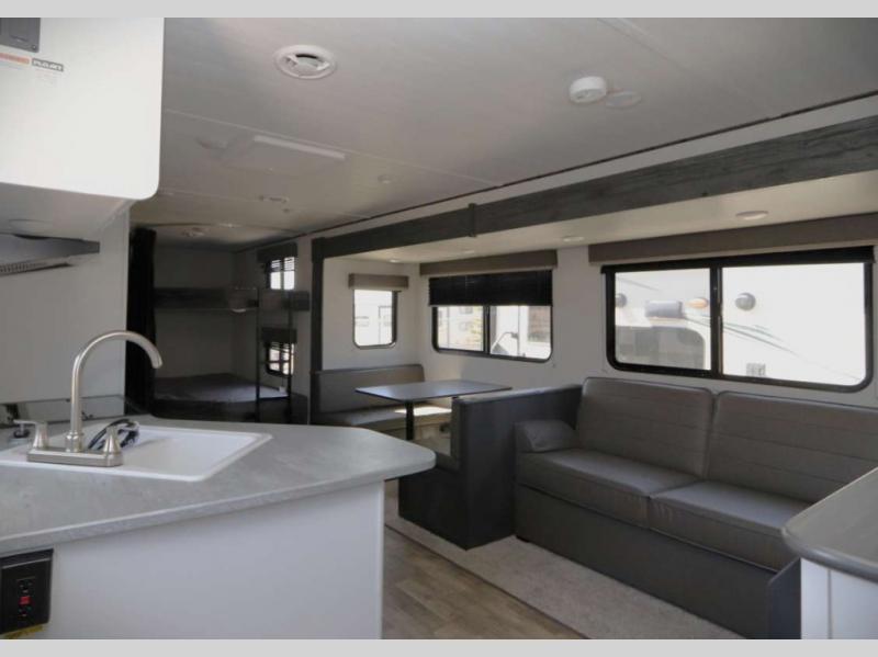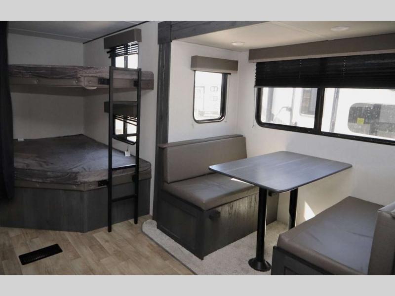 Welcome to your new Hideout travel trailer! It has a great layout ready for a full family or group of friends. The front private bedroom gives you a queen bed that you can rest on each night, and the laundry chute will help you keep your dirty clothes hidden. The large slide in the main living area holds the booth dinette and jackknife sofa, and you'll be able to use these pieces of furniture as beds too. The 52" x 74" bunk beds have a privacy curtain that you can draw when the kids are sleeping, and the 38" walk-in shower is ready to keep all of you clean. You can also add an optional 40" HDTV to the entertainment center so that you can have a movie night whenever you want.