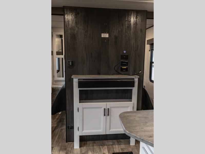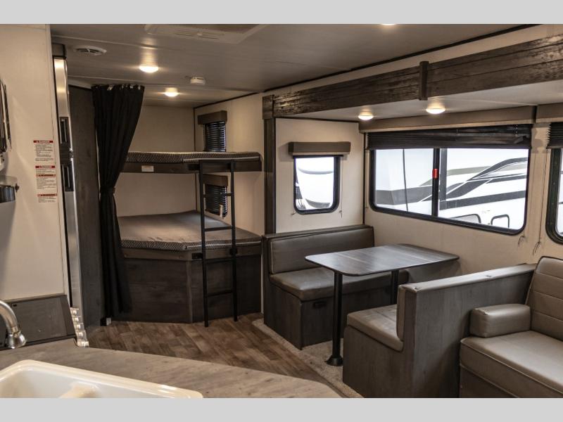Get away with ease in this Hideout travel trailer! You will have your own private place to sleep in each night with the private bedroom up front. This bedroom has a queen-size bed, closets and nightstands on either side of the bed, overhead cabinets, and a laundry chute. Just outside the bedroom is where the entertainment center is located. The entertainment center has been prepped for a fireplace, and you can add an optional 40" HDTV too. The large slide holds the booth dinette and jackknife sofa, and the central vacuum will help you clean up any messes that are made throughout the trip.