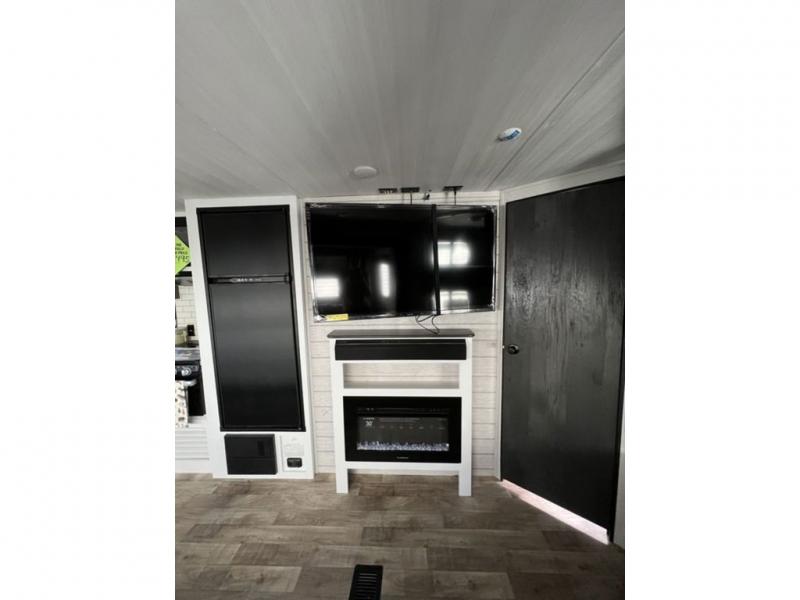 Grab this Hideout travel trailer and head out on your next adventure! There is a large slide to provide you with a spacious living area on the inside. It also gives you more room as you work in the kitchen. Everyone will enjoy having a fireplace when the fall nights hit, and the 50" HDTV will be entertaining once it's dark. There are two entrances into this trailer, and this is what allows you to have one entry leading directly into the full bathroom. So while you're outside working at the outdoor kitchen, you can come inside for a quick restroom break. The central vacuum is a helpful feature that eliminates messes, and the laundry chute in the bedroom will help you keep your dirty clothes off of the floor.