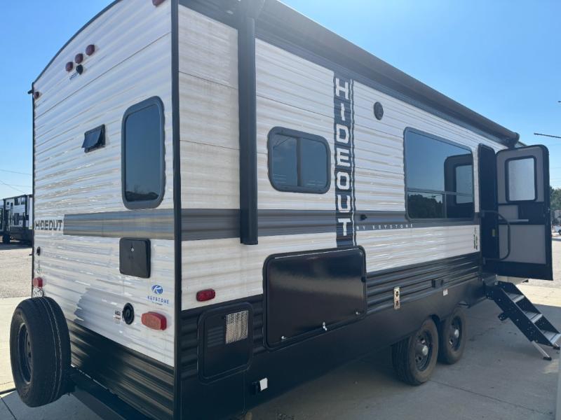 The Keystone Hideout travel trailer, fifth wheel, and destination trailer will be just what the doctor ordered for a stress-free holiday at your favorite campsite! There are a few exclusive features that you'll only find on a Keystone product, like the color-coded unified wiring, the preparations for 4G LTE and Wi-Fi, the Tuf-Lok™ thermoplastic duct joiners, the in-floor heating ducts, and the Tru-fit™ slide construction. Each model has a power awning for some shade in the afternoon, and the tinted safety glass windows will prevent the harmful UV rays from getting inside. You'll also have blackout night shades that you can close when you want privacy, and the SolarFlex 200 is a solar power system that will refill your battery to operate onboard 12V systems with just one day of peak sun exposure.
