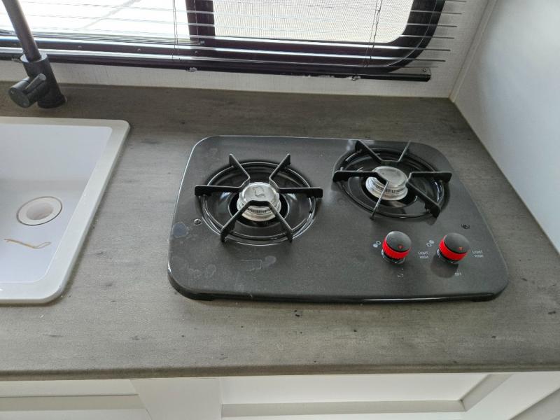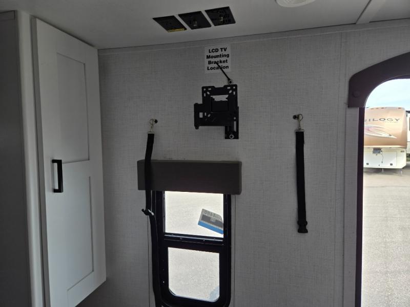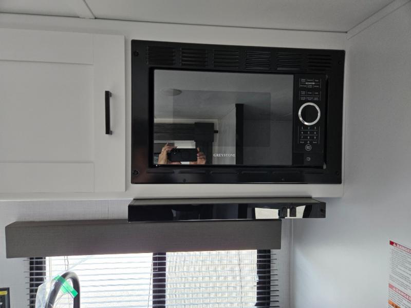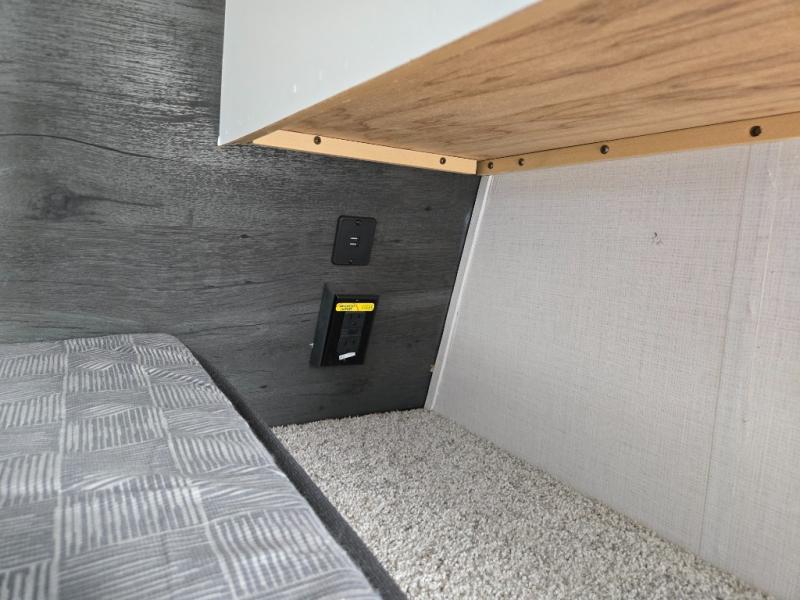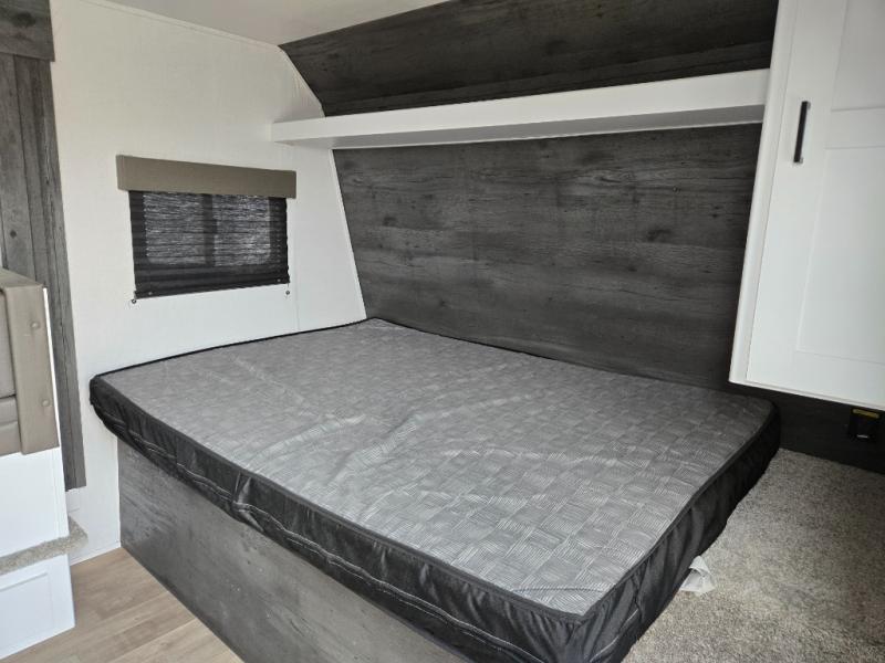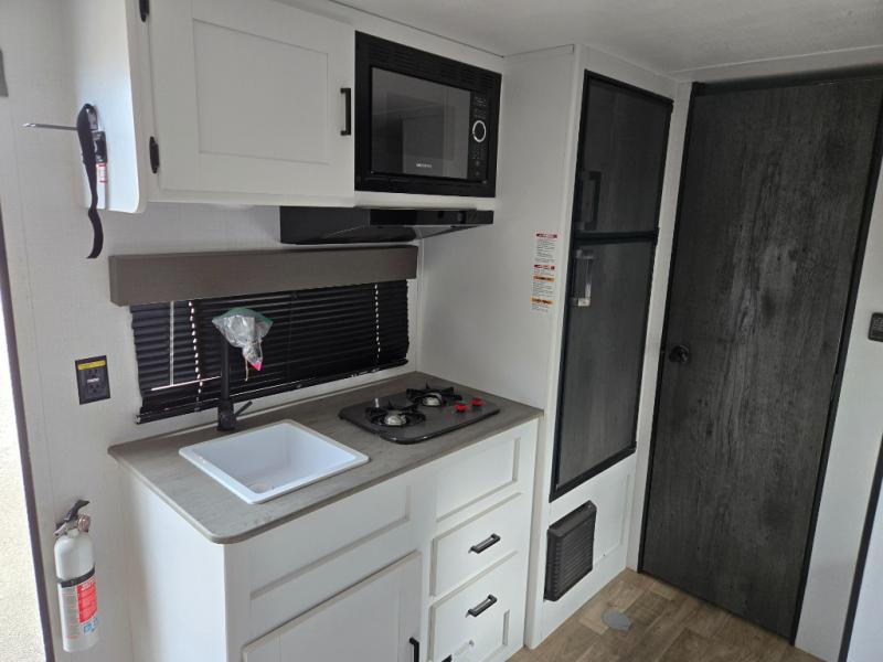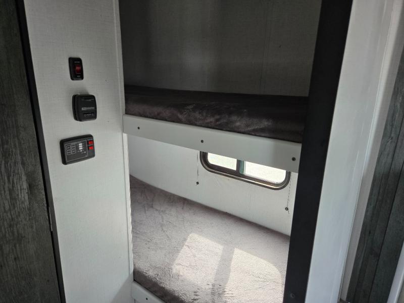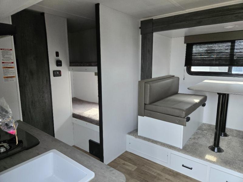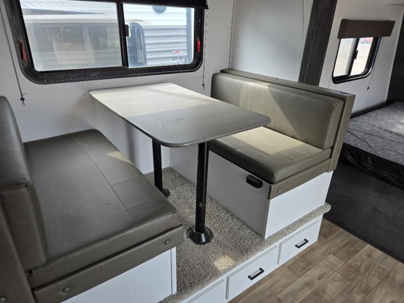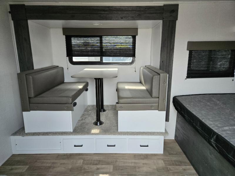 With a roof mount air conditioner, and a furnace, you can camp anytime of year that works for you! Inside, you can dine and relax on the slide out booth dinette which offers storage drawers below, after making a warm meal using the two burner gas range or the microwave. And the 6 cu. ft. refrigerator gives you space for cold food and drinks. Everyone can take turns getting cleaned up in the full bathroom before falling asleep on the bunks, the queen-size bed or the booth dinette. And the 10' power awning offers an outdoor living area protected from the elements once you add your camping chairs taken from the pass-through compartment.