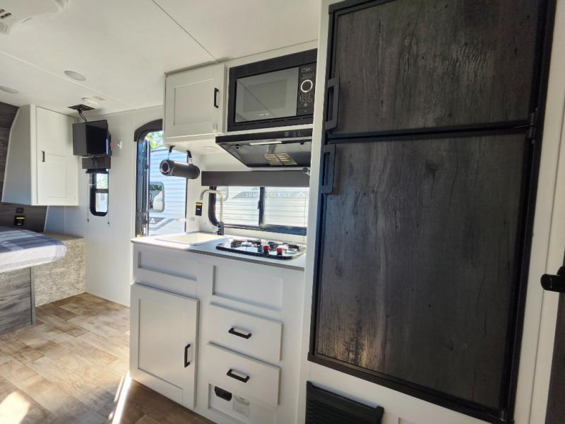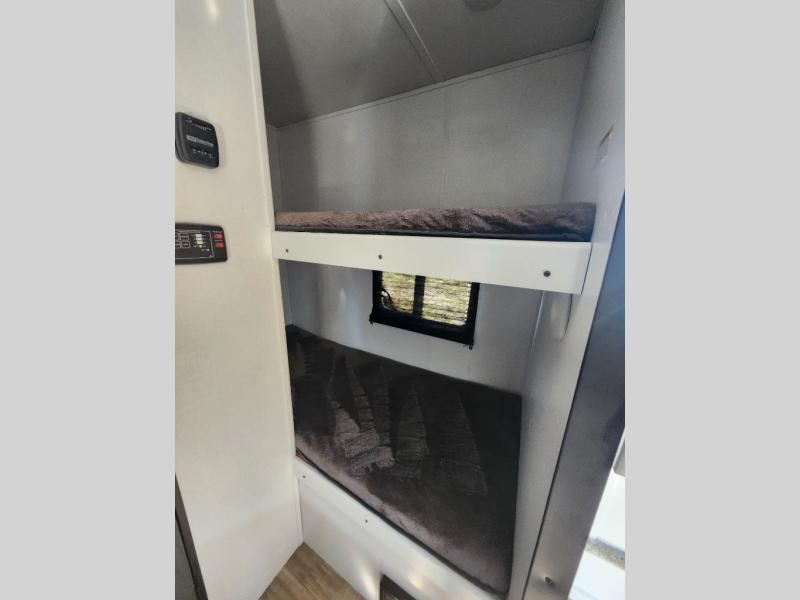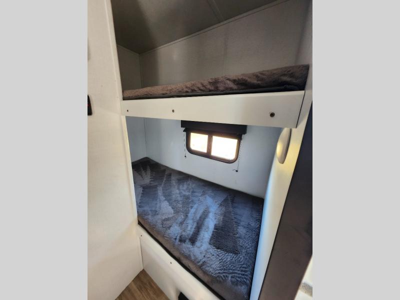 With a roof mount air conditioner, and a furnace, you can camp anytime of year that works for you! Inside, you can dine and relax on the slide out booth dinette which offers storage drawers below, after making a warm meal using the two burner gas range or the microwave. And the 6 cu. ft. refrigerator gives you space for cold food and drinks. Everyone can take turns getting cleaned up in the full bathroom before falling asleep on the bunks, the queen-size bed or the booth dinette. And the 10' power awning offers an outdoor living area protected from the elements once you add your camping chairs taken from the pass-through compartment.