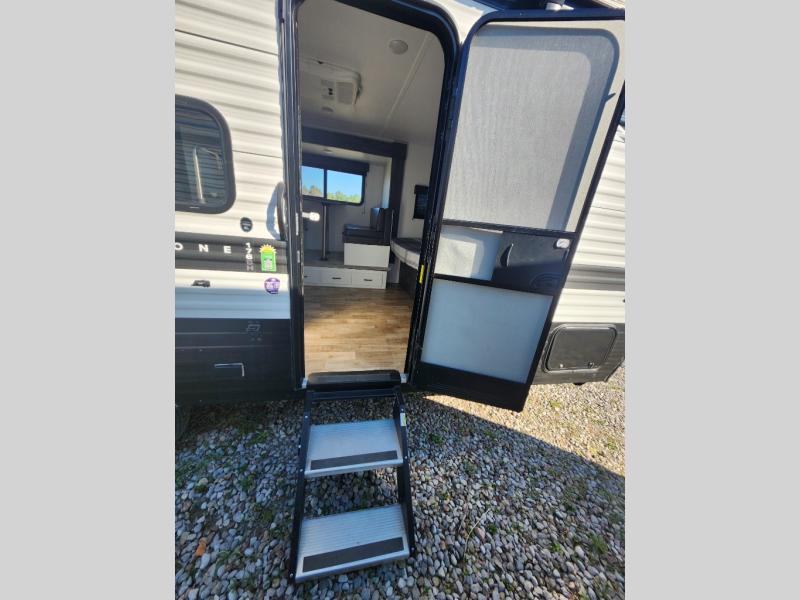 With any Keystone Hideout Single Axle travel trailer, there is an aluminum exterior allowing each to be lightweight for easy towing, the SolarFlex 200 so you can camp off-grid, tinted safety glass windows, and LCI SolidStep entry steps for stability when entering and exiting. The interior is light and airy, and includes a furnace, bedside outlets, blackout night shades, and more. You will also appreciate the Keystone exclusives such as the color-coded unified wiring, the 4G LTE and Wi-Fi prep, the Tuf-Lok thermoplastic duct joiners, the in-floor heating ducts, and the Tru-Fit slide construction.