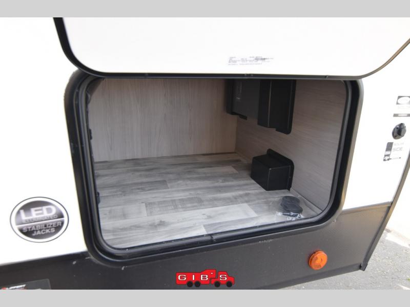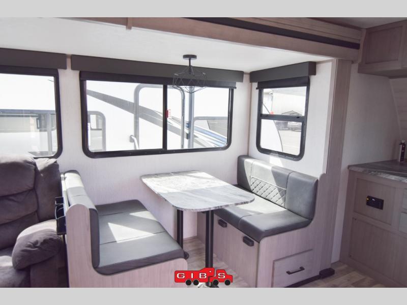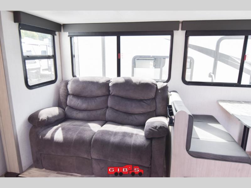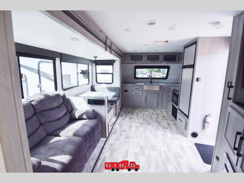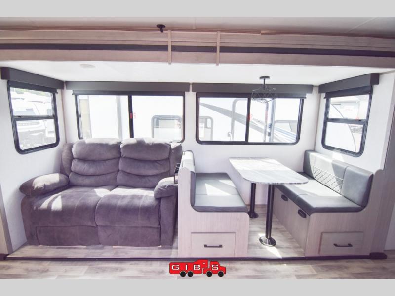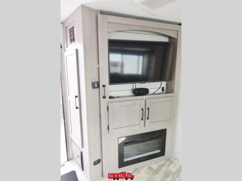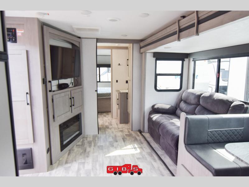 You will love every minute spent in this spacious travel trailer that includes dual slide outs! The walk through bath will create a rear master bedroom you are sure to love. You can sleep soundly on the king bed and relax in front of the bedroom fireplace. The chef of your group will have ample counter space in the kitchen to prep meals, plus there is a 10 cu. ft. refrigerator to store perishables. After dinner, get comfortable on the theater seats or play a game at the booth dinette. Or you may just want to relax outdoors under the 20' power awning with LED lights!