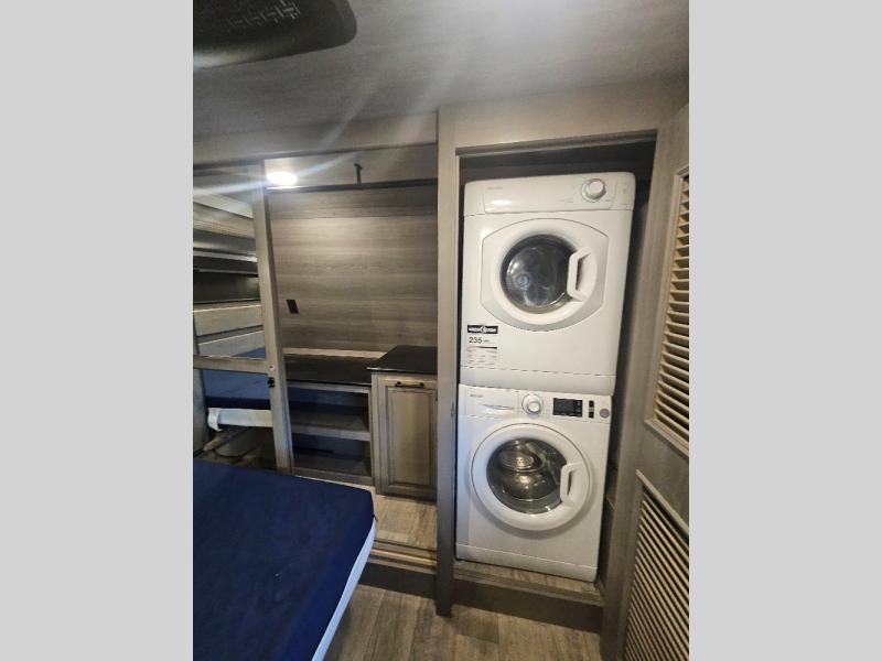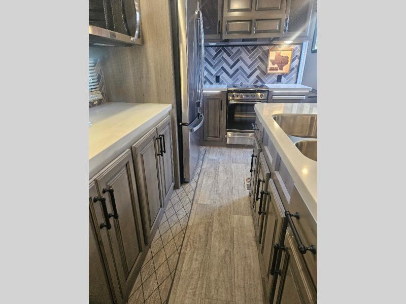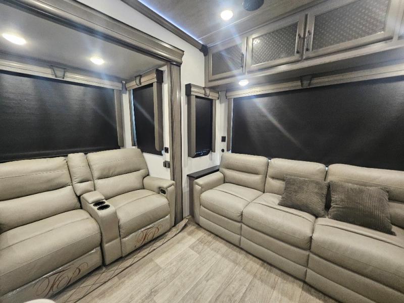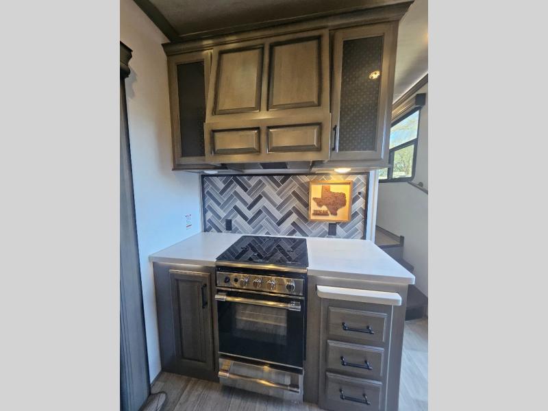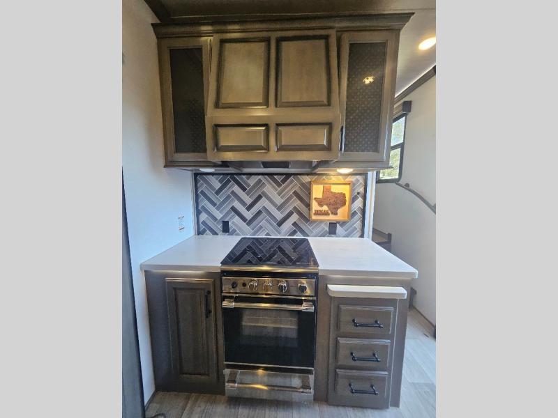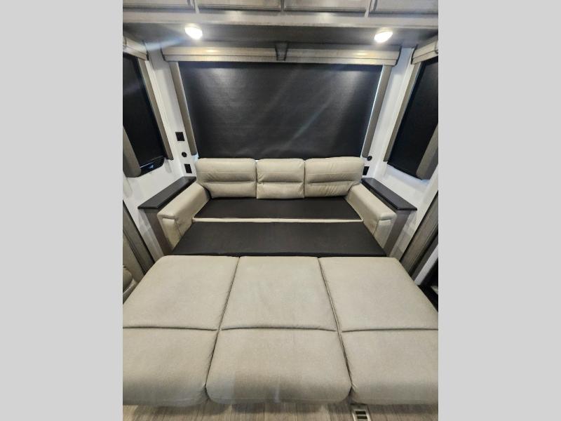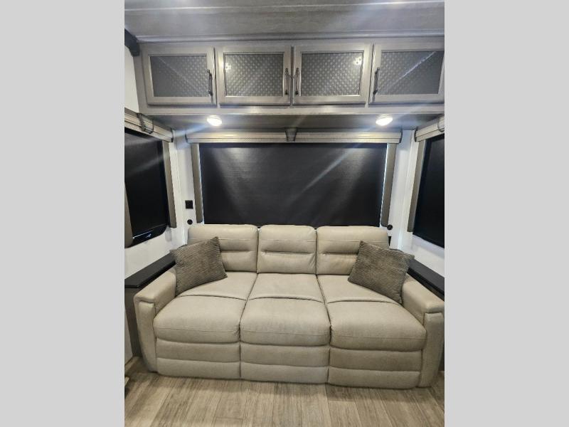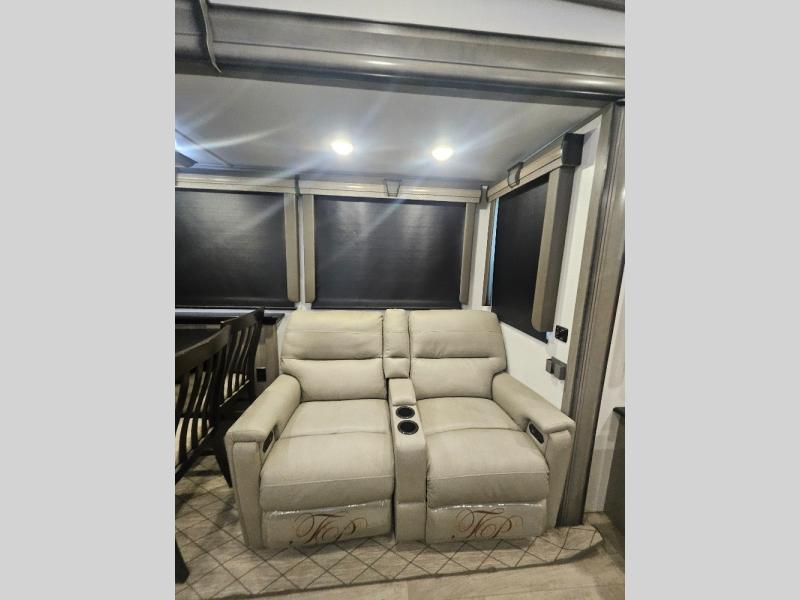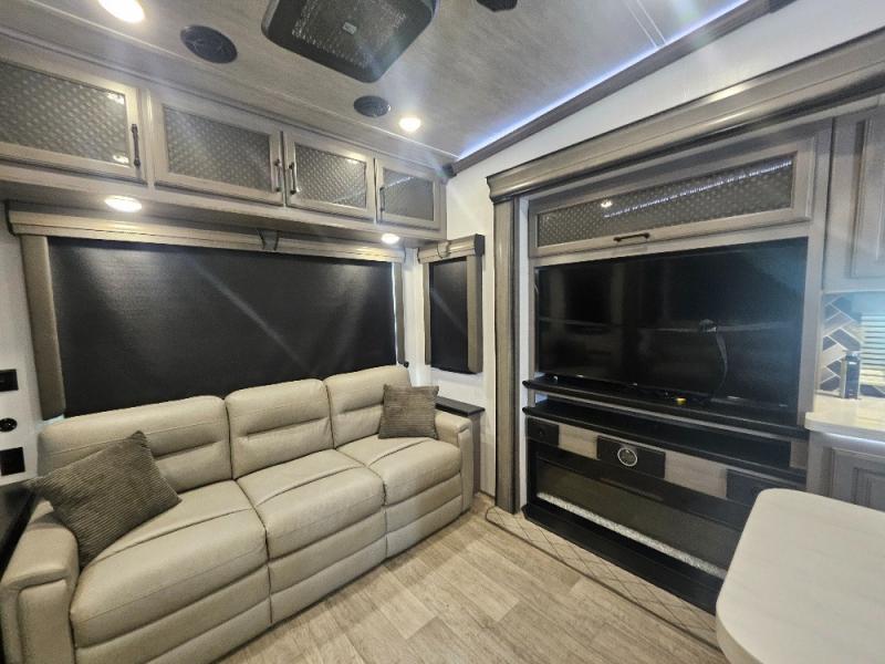 Luxury abounds throughout this fifth wheel! Starting in the kitchen with the island, two pull out pantries with extra countertop space above it, a glass top range with a pull-down spice rack in the range hood, and a pull out countertop for more prepping space. The full bathroom has a 48" x 30" fiberglass shower with a seat, decorative glass enclosure, and skylight above it for more natural lighting as two get ready at once with the dual sink vanity. Sleep like a baby in the front private bedroom on the king bed slide with storage underneath and keep your clothes looking their best with the front closet that has a clothing hamper and an area prepped to add the optional stackable washer and dryer. The rear living area offers true relaxation with a hide-a-bed sofa and power Thomas Payne theater seating across from the entertainment center with a 5,000 BTU decorative fireplace heater and 50" LCD HDTV to watch your favorite movies!