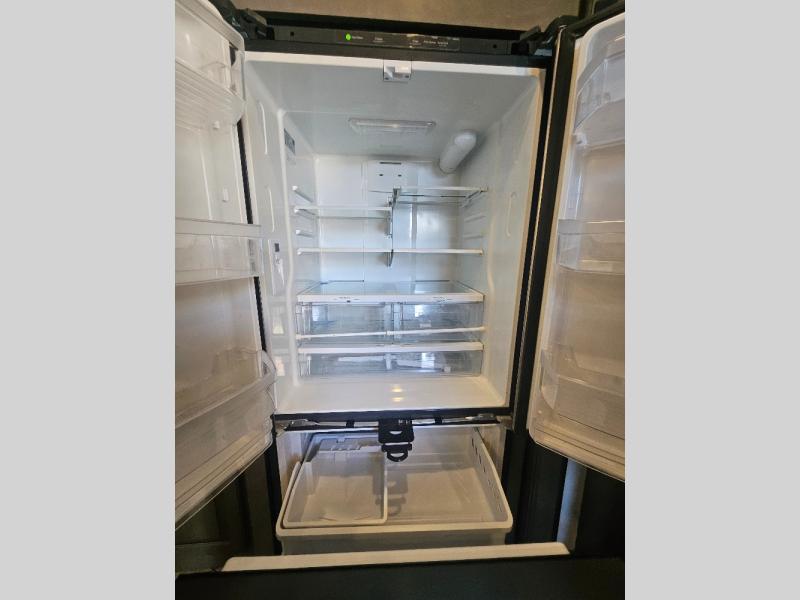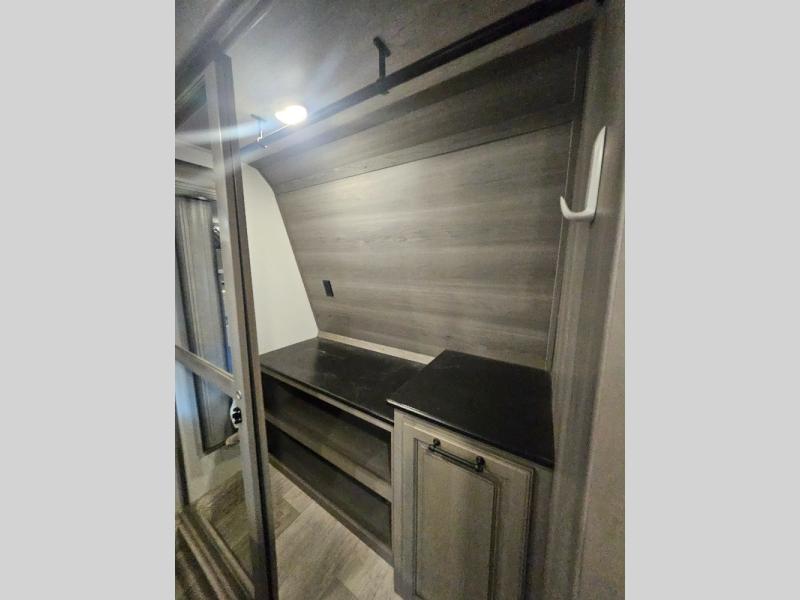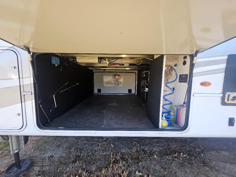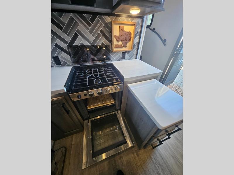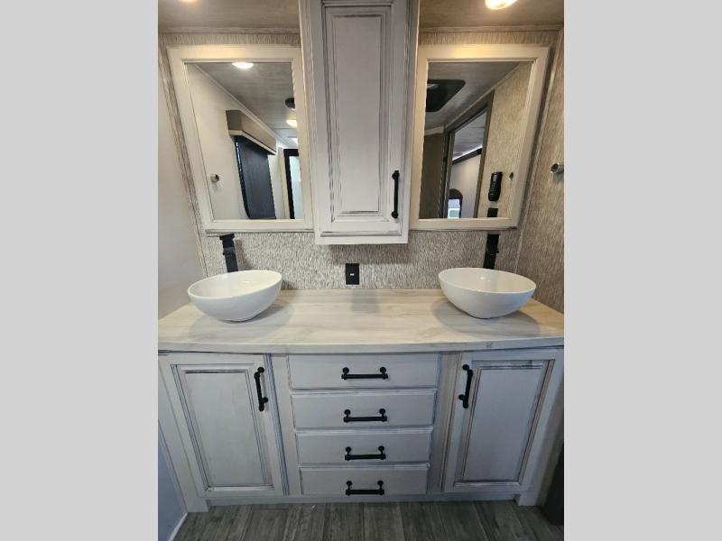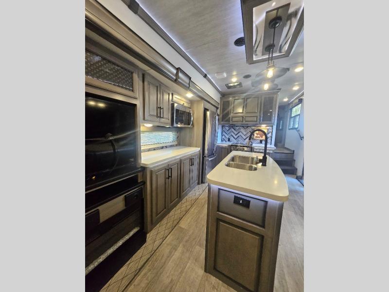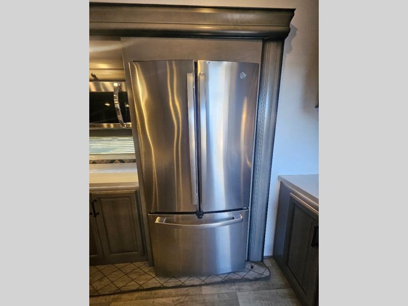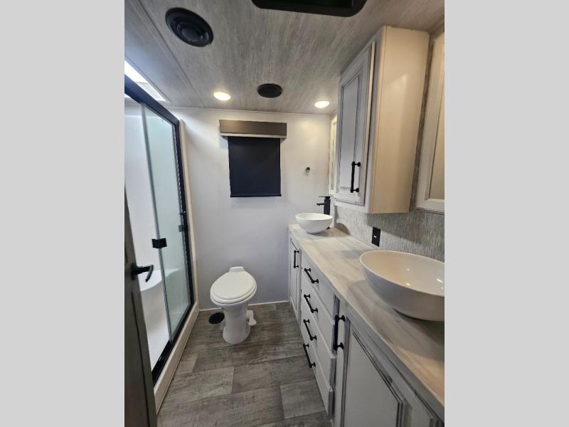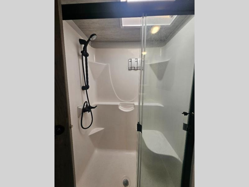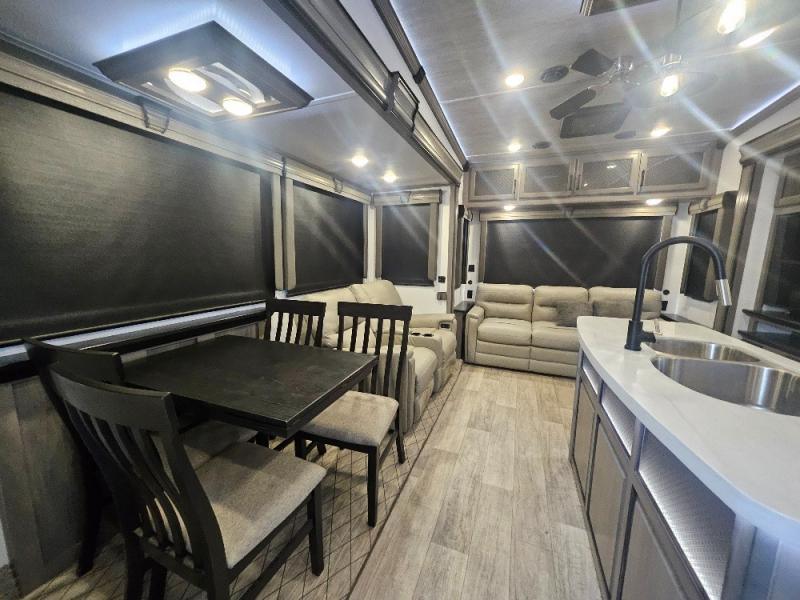 Luxury abounds throughout this fifth wheel! Starting in the kitchen with the island, two pull out pantries with extra countertop space above it, a glass top range with a pull-down spice rack in the range hood, and a pull out countertop for more prepping space. The full bathroom has a 48" x 30" fiberglass shower with a seat, decorative glass enclosure, and skylight above it for more natural lighting as two get ready at once with the dual sink vanity. Sleep like a baby in the front private bedroom on the king bed slide with storage underneath and keep your clothes looking their best with the front closet that has a clothing hamper and an area prepped to add the optional stackable washer and dryer. The rear living area offers true relaxation with a hide-a-bed sofa and power Thomas Payne theater seating across from the entertainment center with a 5,000 BTU decorative fireplace heater and 50" LCD HDTV to watch your favorite movies!
