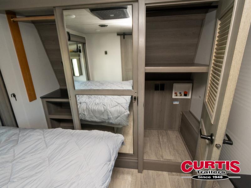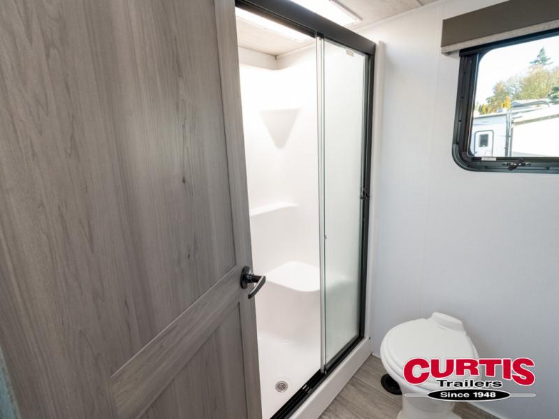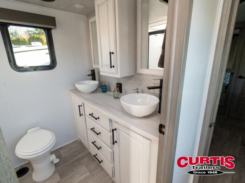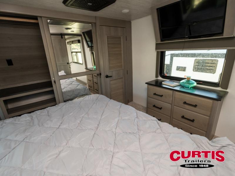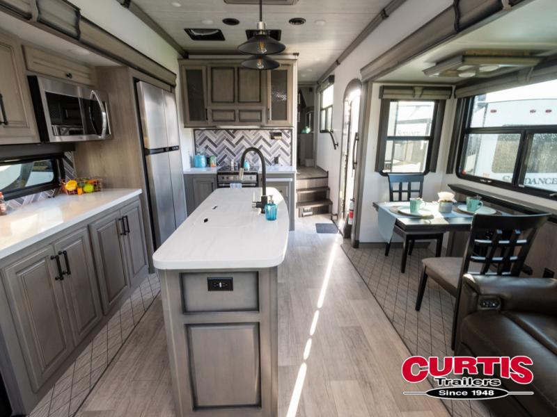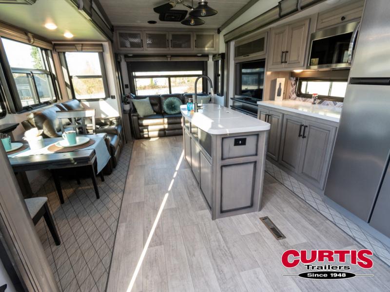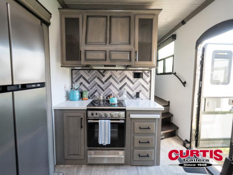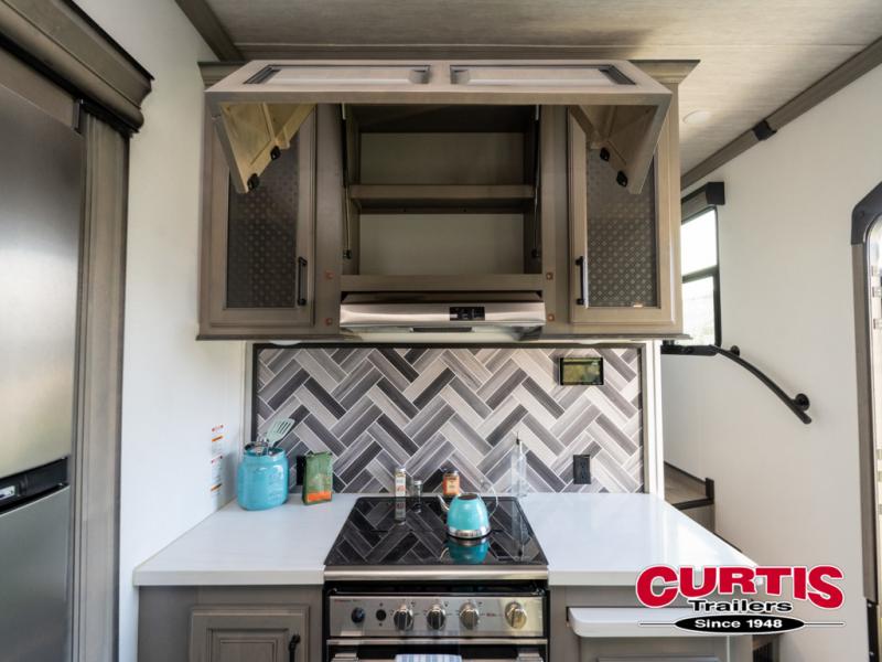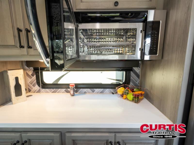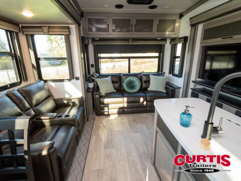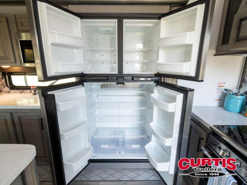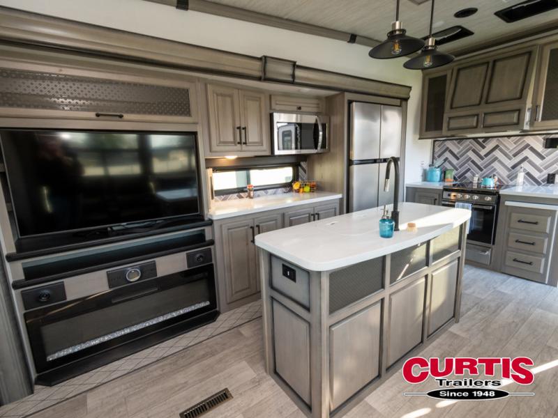 Luxury abounds throughout this fifth wheel! Starting in the kitchen with the island, two pull out pantries with extra countertop space above it, a glass top range with a pull-down spice rack in the range hood, and a pull out countertop for more prepping space. The full bathroom has a 48" x 30" fiberglass shower with a seat, decorative glass enclosure, and skylight above it for more natural lighting as two get ready at once with the dual sink vanity. Sleep like a baby in the front private bedroom on the king bed slide with storage underneath and keep your clothes looking their best with the front closet that has a clothing hamper and an area prepped to add the optional stackable washer and dryer. The rear living area offers true relaxation with a hide-a-bed sofa and power Thomas Payne theater seating across from the entertainment center with a 5,000 BTU decorative fireplace heater and 50" LCD HDTV to watch your favorite movies!