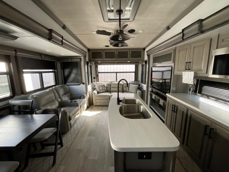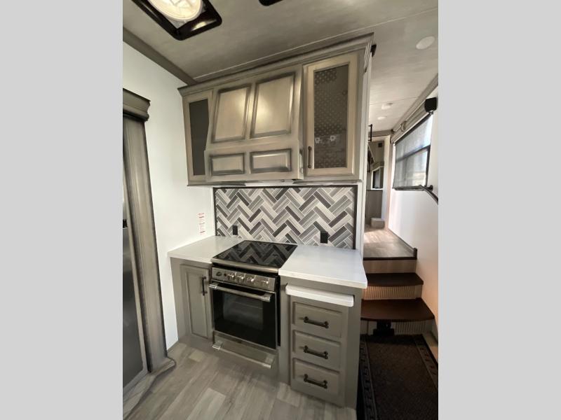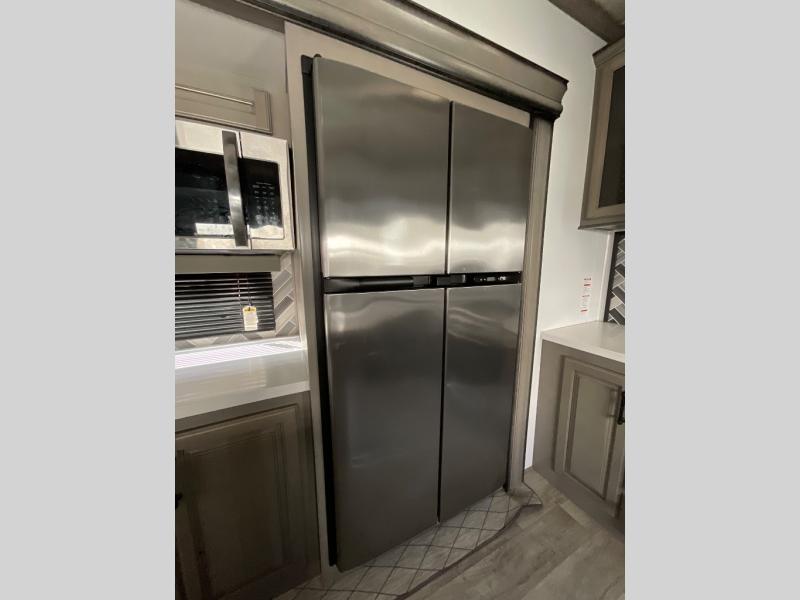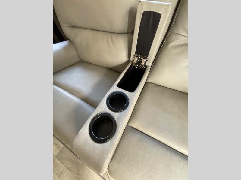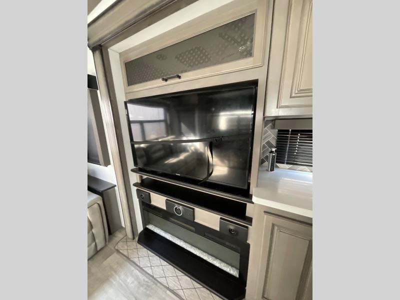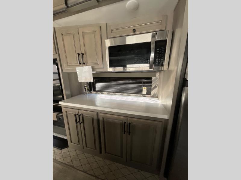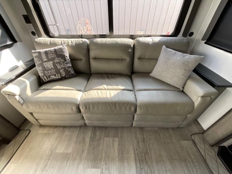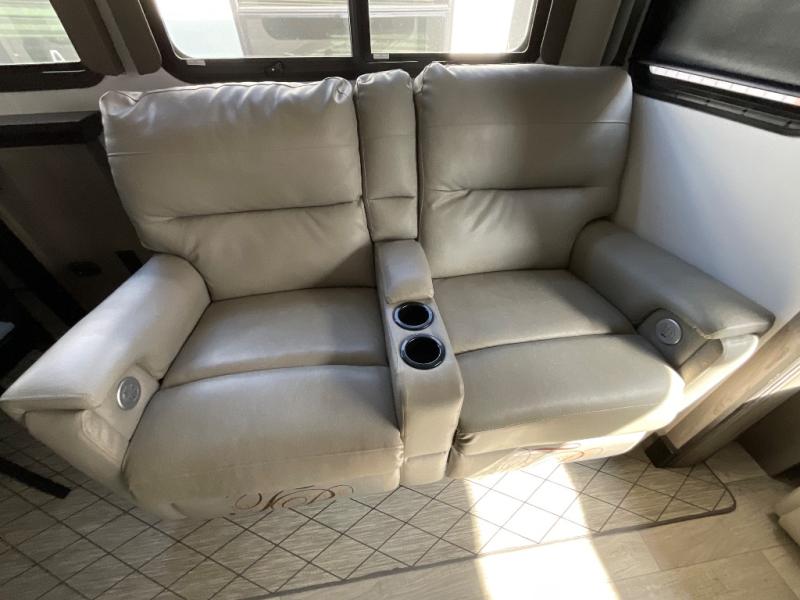 Luxury abounds throughout this fifth wheel! Starting in the kitchen with the island, two pull out pantries with extra countertop space above it, a glass top range with a pull-down spice rack in the range hood, and a pull out countertop for more prepping space. The full bathroom has a 48" x 30" fiberglass shower with a seat, decorative glass enclosure, and skylight above it for more natural lighting as two get ready at once with the dual sink vanity. Sleep like a baby in the front private bedroom on the king bed slide with storage underneath and keep your clothes looking their best with the front closet that has a clothing hamper and an area prepped to add the optional stackable washer and dryer. The rear living area offers true relaxation with a hide-a-bed sofa and power Thomas Payne theater seating across from the entertainment center with a 5,000 BTU decorative fireplace heater and 50" LCD HDTV to watch your favorite movies!