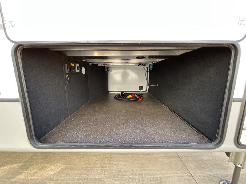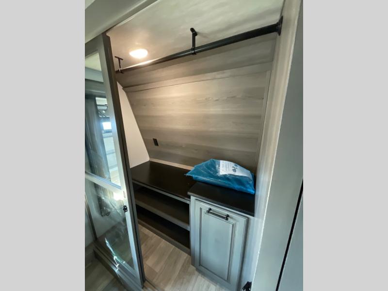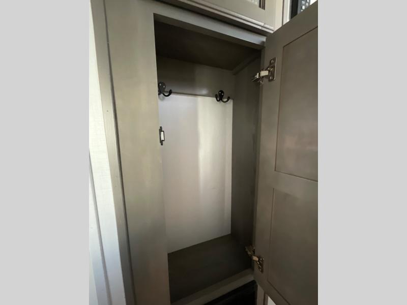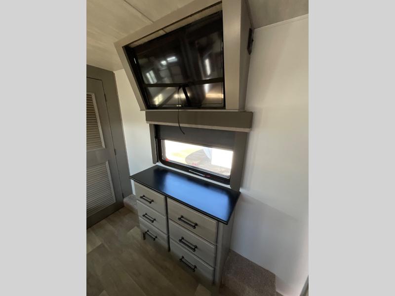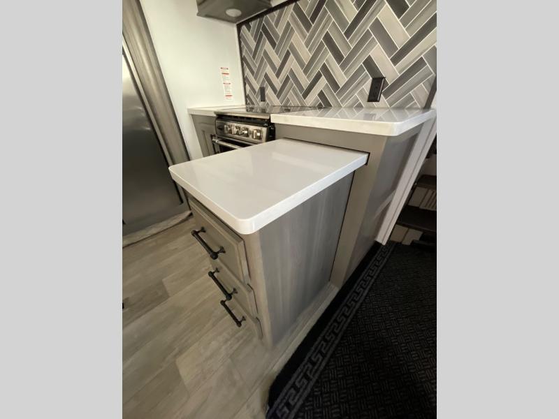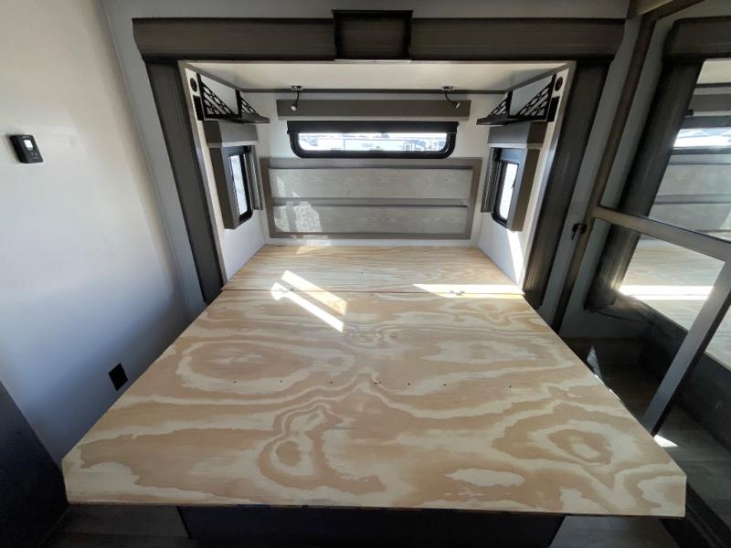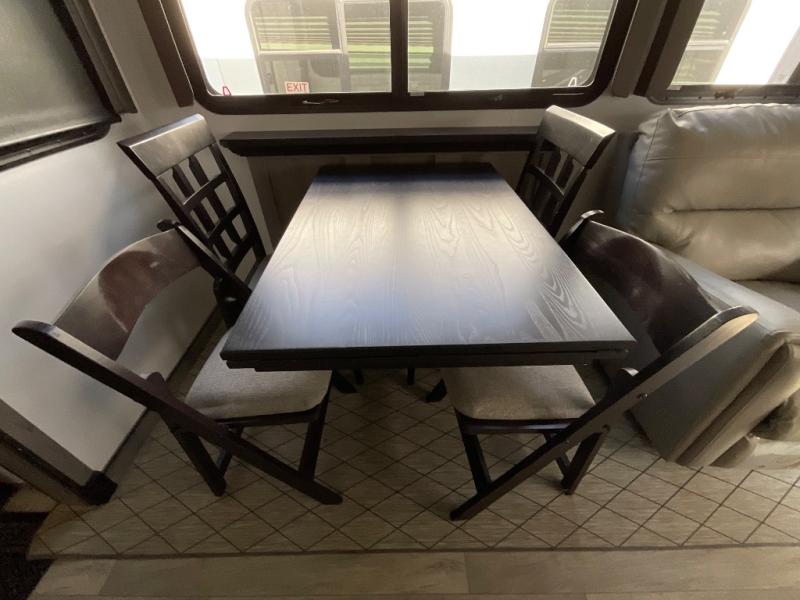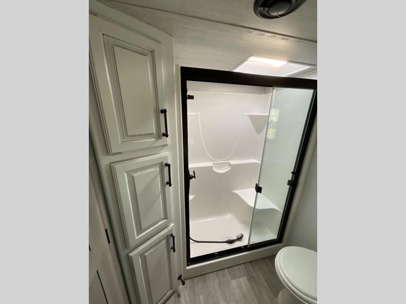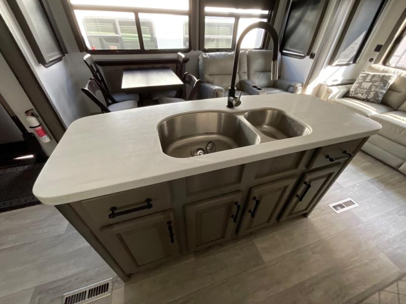 Luxury abounds throughout this fifth wheel! Starting in the kitchen with the island, two pull out pantries with extra countertop space above it, a glass top range with a pull-down spice rack in the range hood, and a pull out countertop for more prepping space. The full bathroom has a 48" x 30" fiberglass shower with a seat, decorative glass enclosure, and skylight above it for more natural lighting as two get ready at once with the dual sink vanity. Sleep like a baby in the front private bedroom on the king bed slide with storage underneath and keep your clothes looking their best with the front closet that has a clothing hamper and an area prepped to add the optional stackable washer and dryer. The rear living area offers true relaxation with a hide-a-bed sofa and power Thomas Payne theater seating across from the entertainment center with a 5,000 BTU decorative fireplace heater and 50" LCD HDTV to watch your favorite movies!