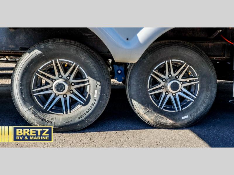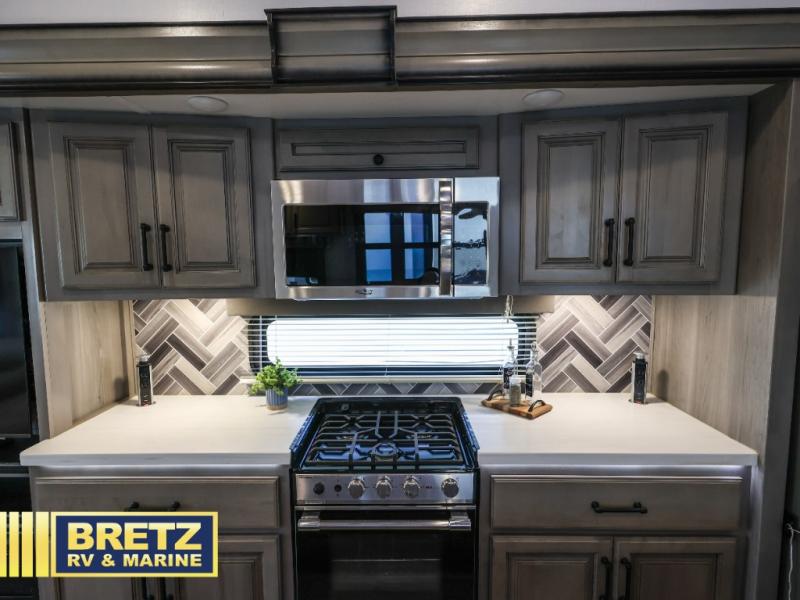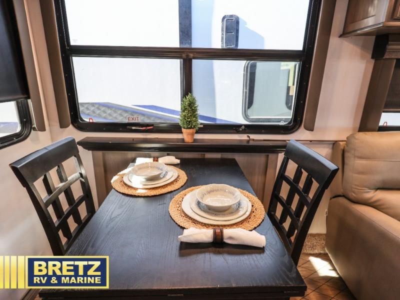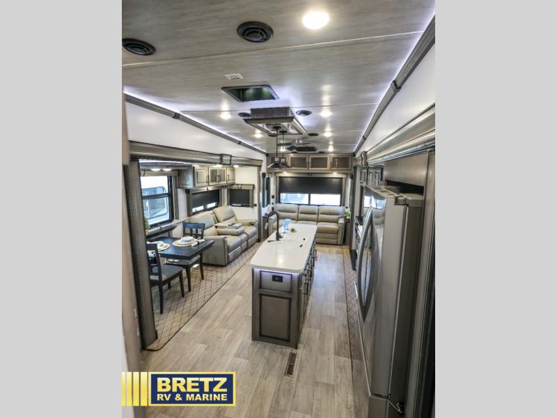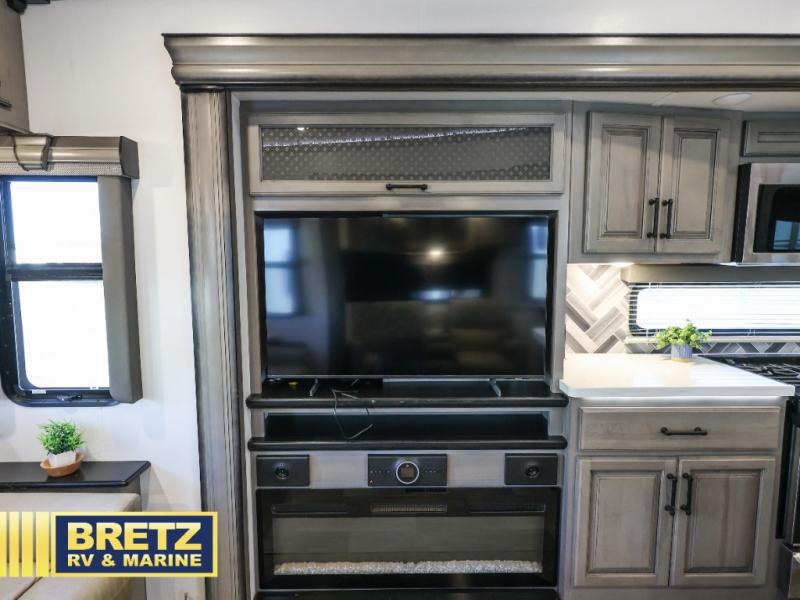 Enjoy a home away from home with this fifth wheel! The front private bedroom has a king bed slide with storage underneath and CPAP shelves across from a 32" HDTV with drawers below it, a large front closet, and a barn door to close it all off. Freshen up each morning in the full bathroom with the 48" x 30" fiberglass shower with a seat and skylight above for more natural lighting as you get ready at the dual sink vanity. The kitchen has everything you need to prepare your best meals including extra countertop space on the kitchen island and even a closet that is prepped to add the optional washer and dryer so you can quickly grab a clean dish towel. Enjoy your meals at the free standing legless dinette and then relax on the rear hide-a-bed sofa or the power Thomas Payne theater seating across from the entertainment center with a 5,000 BTU decorative fireplace heater and 50" LCD HDTV to watch your favorite movies!