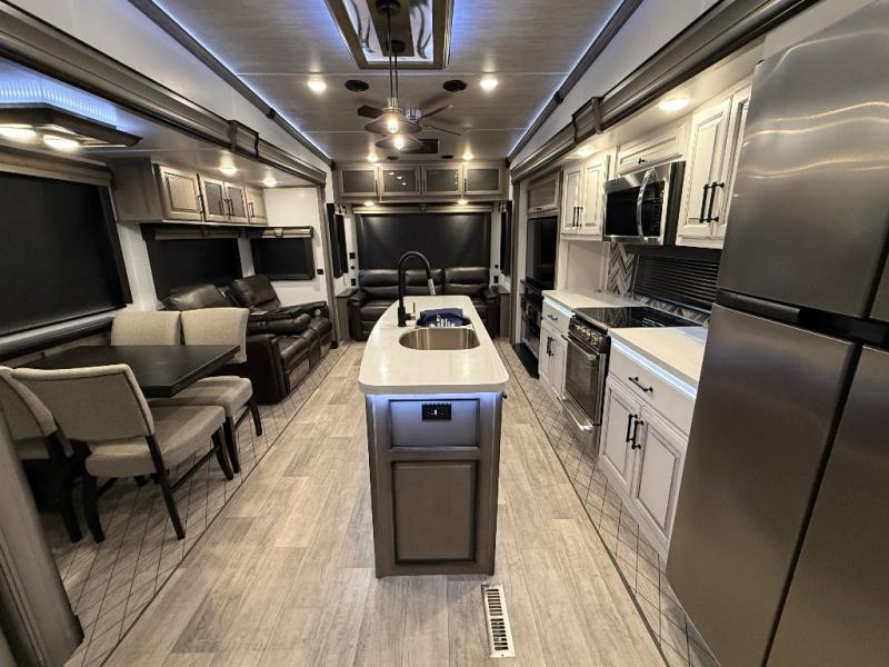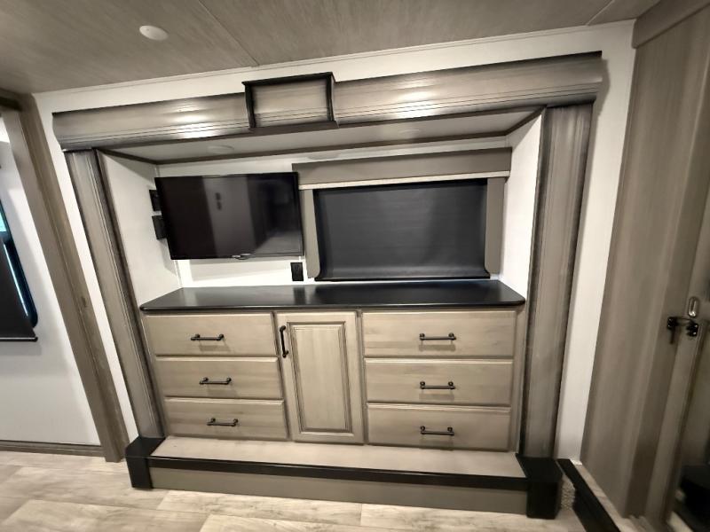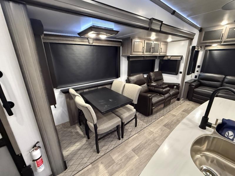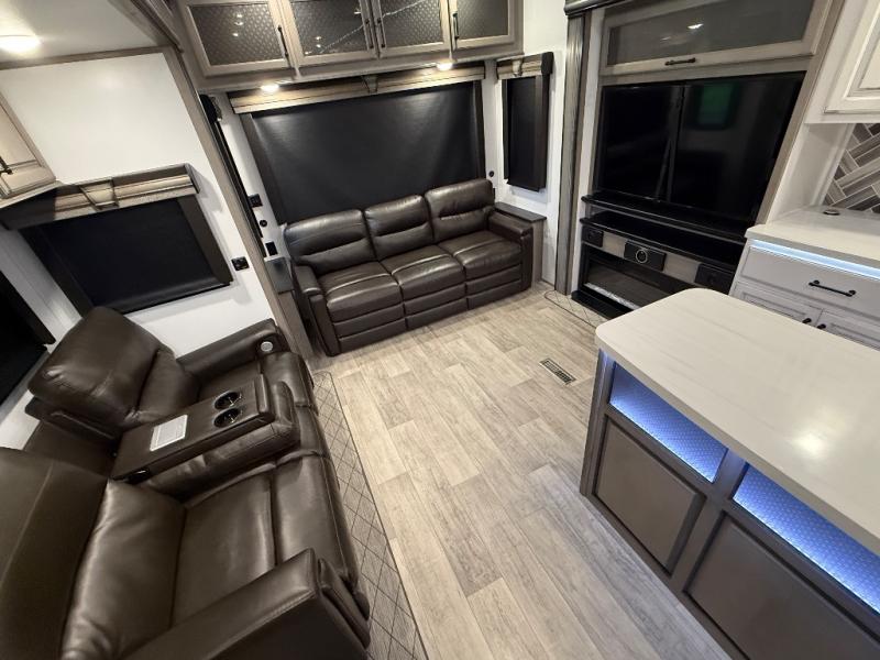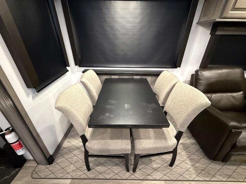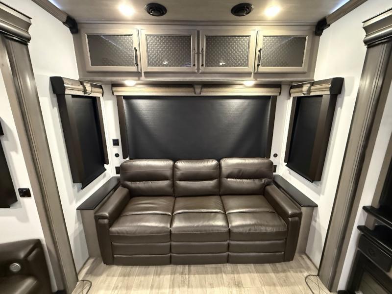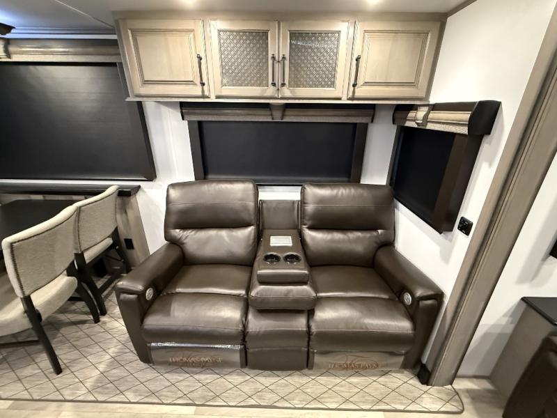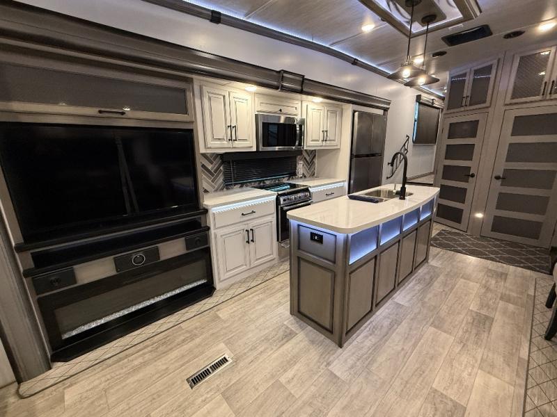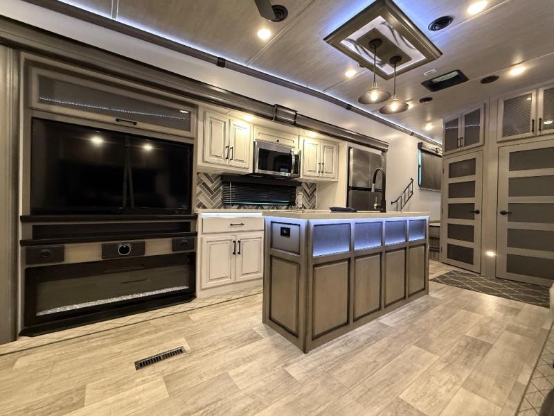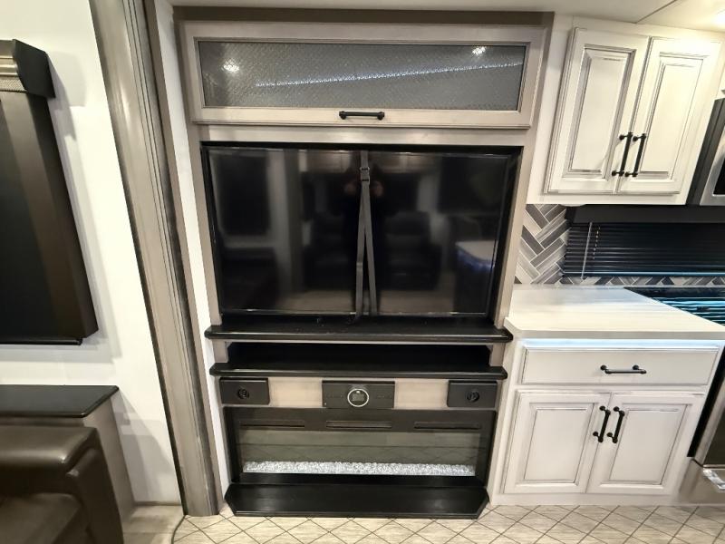 Enjoy a home away from home with this fifth wheel! The front private bedroom has a king bed slide with storage underneath and CPAP shelves across from a 32" HDTV with drawers below it, a large front closet, and a barn door to close it all off. Freshen up each morning in the full bathroom with the 48" x 30" fiberglass shower with a seat and skylight above for more natural lighting as you get ready at the dual sink vanity. The kitchen has everything you need to prepare your best meals including extra countertop space on the kitchen island and even a closet that is prepped to add the optional washer and dryer so you can quickly grab a clean dish towel. Enjoy your meals at the free standing legless dinette and then relax on the rear hide-a-bed sofa or the power Thomas Payne theater seating across from the entertainment center with a 5,000 BTU decorative fireplace heater and 50" LCD HDTV to watch your favorite movies!