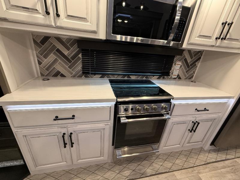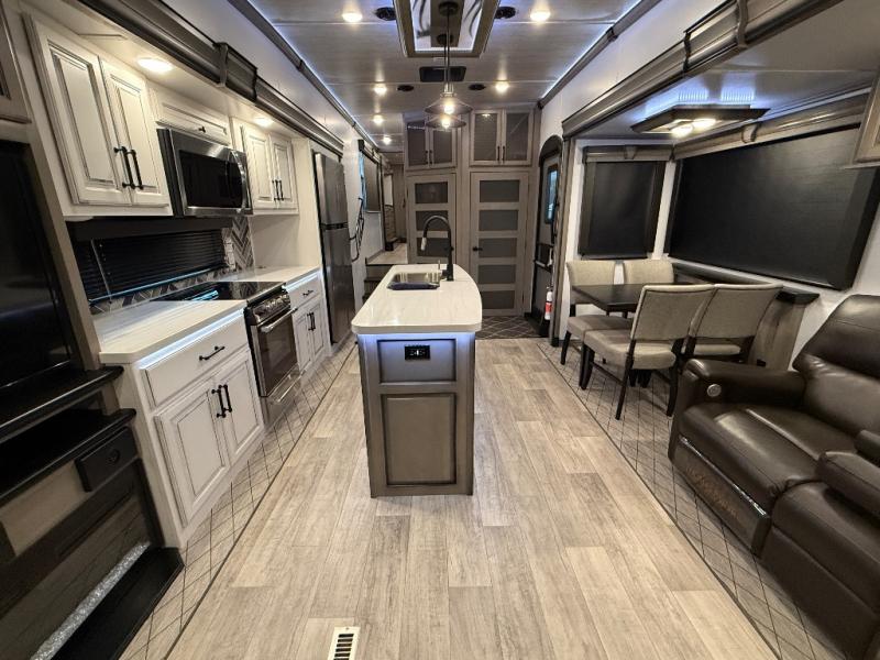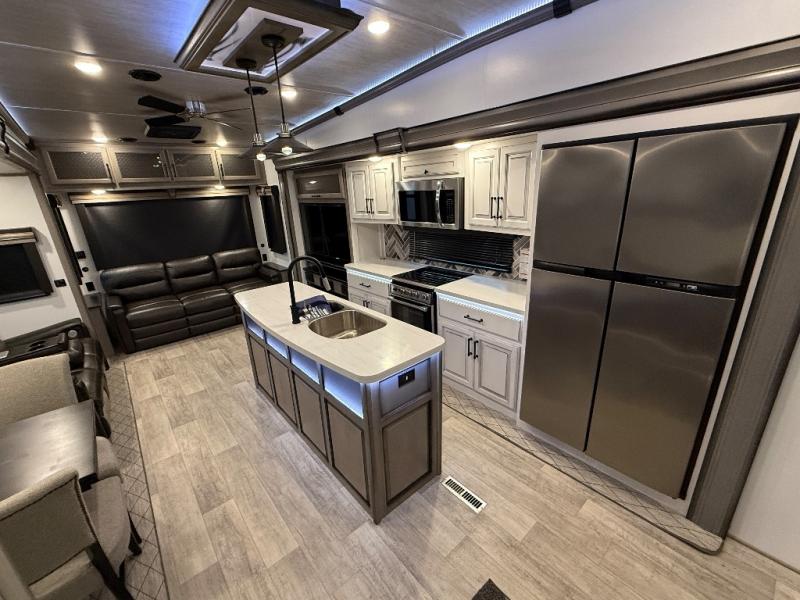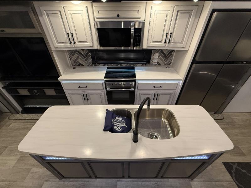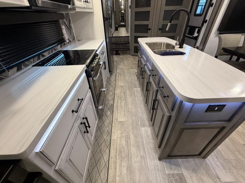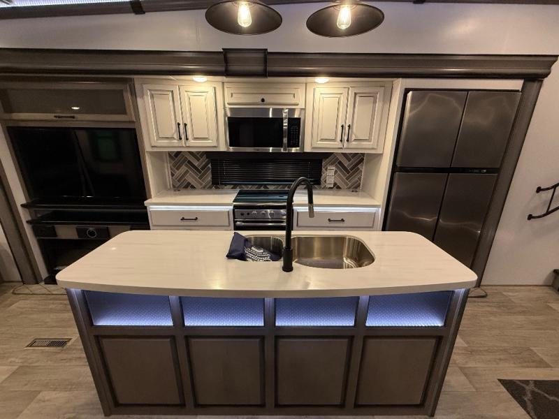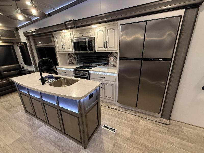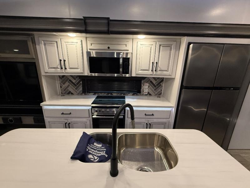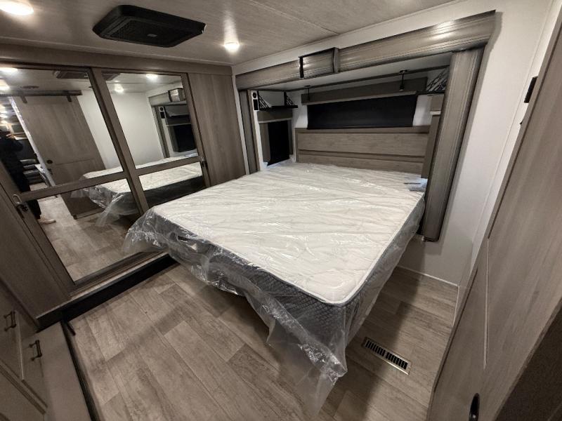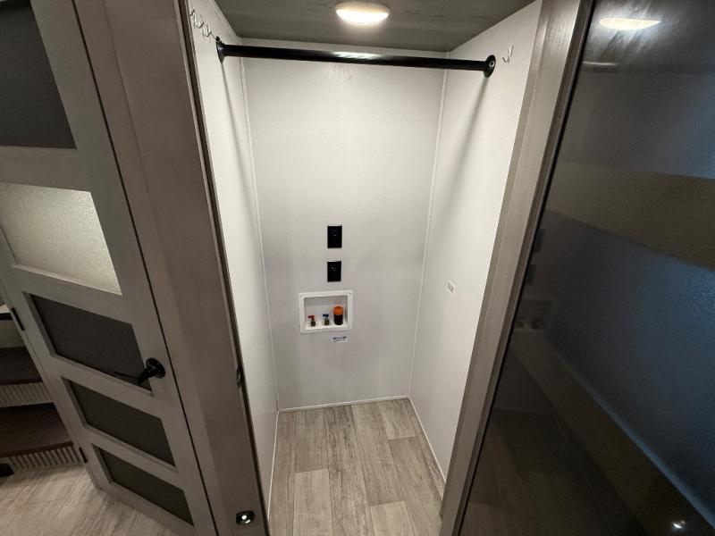 Enjoy a home away from home with this fifth wheel! The front private bedroom has a king bed slide with storage underneath and CPAP shelves across from a 32" HDTV with drawers below it, a large front closet, and a barn door to close it all off. Freshen up each morning in the full bathroom with the 48" x 30" fiberglass shower with a seat and skylight above for more natural lighting as you get ready at the dual sink vanity. The kitchen has everything you need to prepare your best meals including extra countertop space on the kitchen island and even a closet that is prepped to add the optional washer and dryer so you can quickly grab a clean dish towel. Enjoy your meals at the free standing legless dinette and then relax on the rear hide-a-bed sofa or the power Thomas Payne theater seating across from the entertainment center with a 5,000 BTU decorative fireplace heater and 50" LCD HDTV to watch your favorite movies!