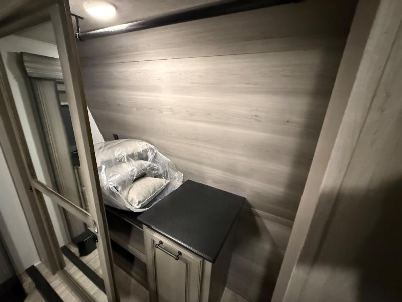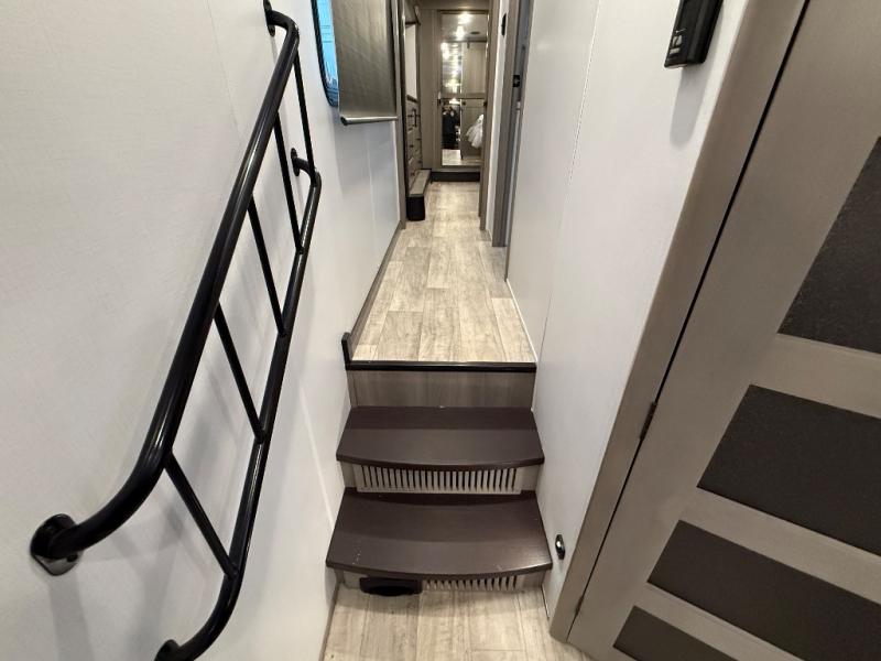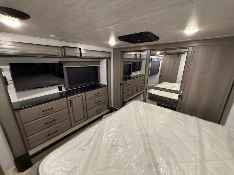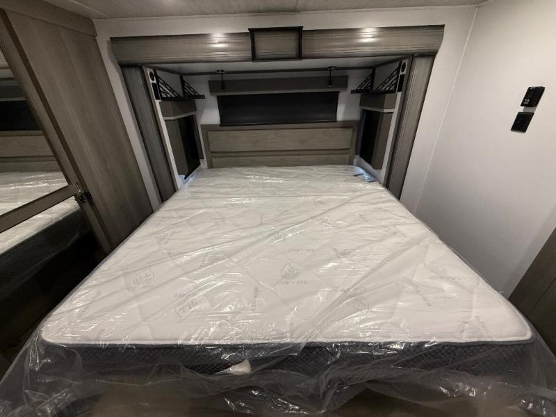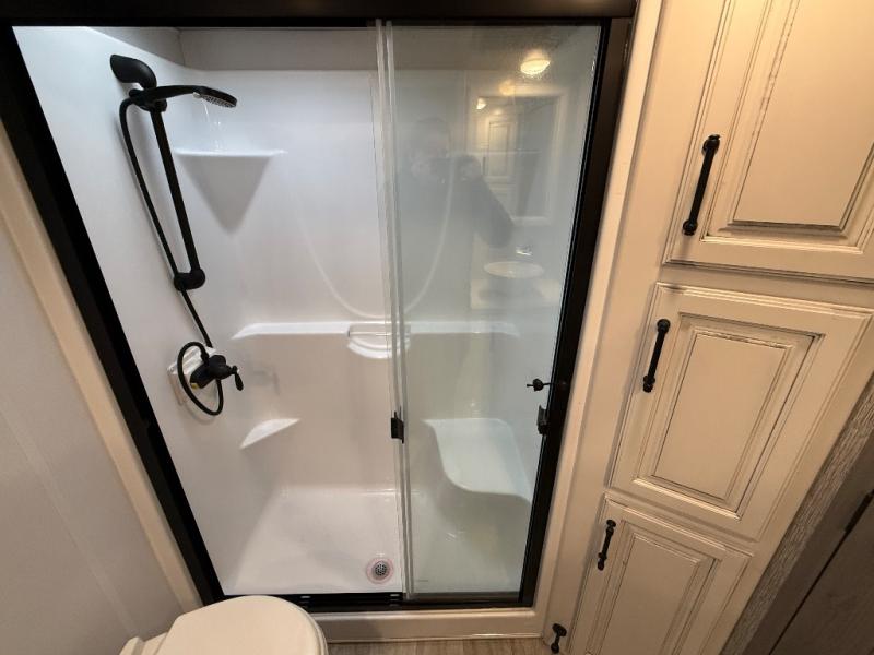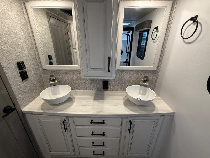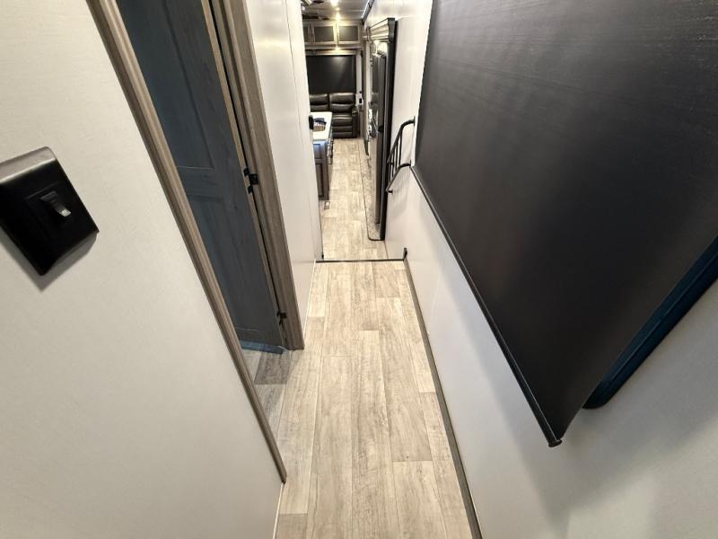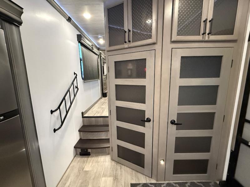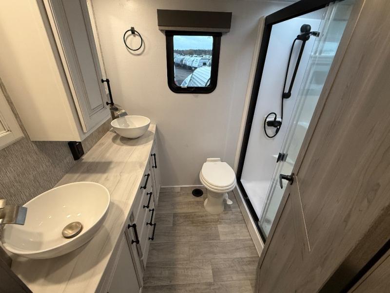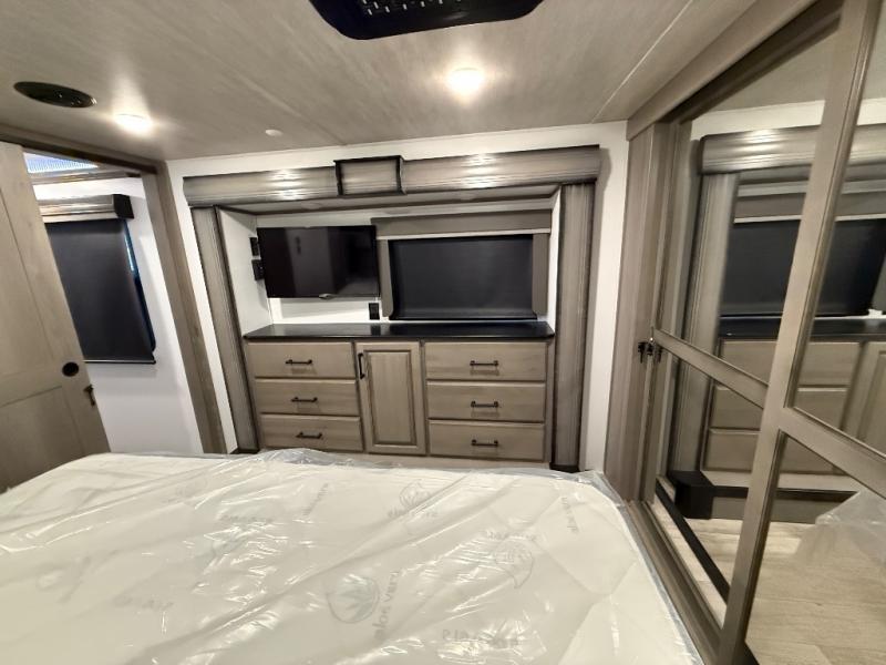 Enjoy a home away from home with this fifth wheel! The front private bedroom has a king bed slide with storage underneath and CPAP shelves across from a 32" HDTV with drawers below it, a large front closet, and a barn door to close it all off. Freshen up each morning in the full bathroom with the 48" x 30" fiberglass shower with a seat and skylight above for more natural lighting as you get ready at the dual sink vanity. The kitchen has everything you need to prepare your best meals including extra countertop space on the kitchen island and even a closet that is prepped to add the optional washer and dryer so you can quickly grab a clean dish towel. Enjoy your meals at the free standing legless dinette and then relax on the rear hide-a-bed sofa or the power Thomas Payne theater seating across from the entertainment center with a 5,000 BTU decorative fireplace heater and 50" LCD HDTV to watch your favorite movies!