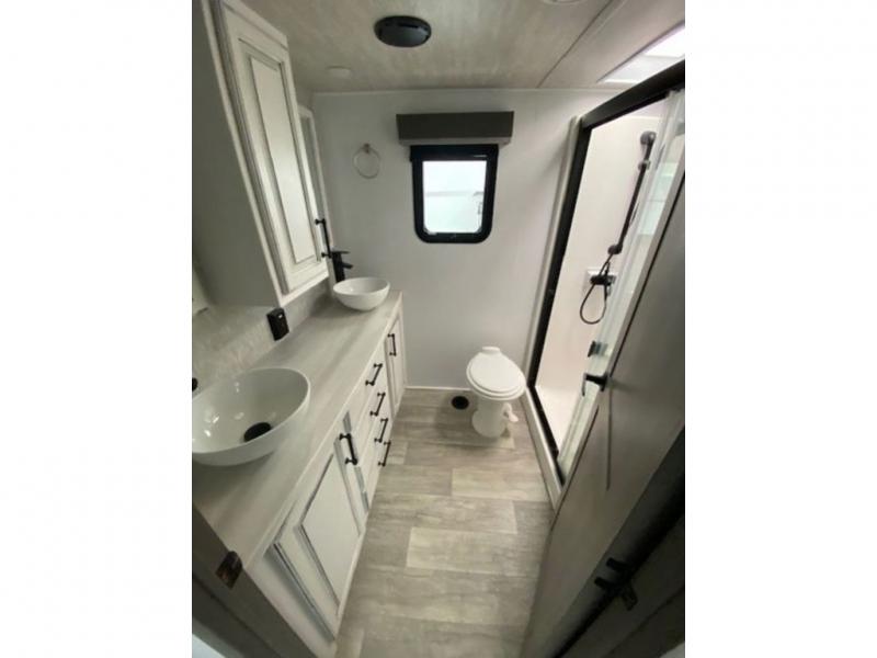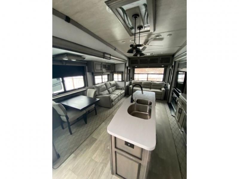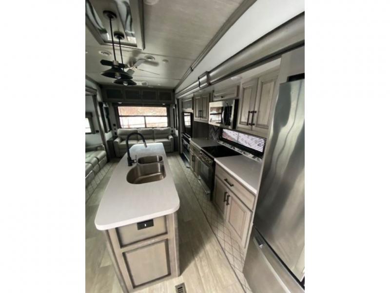 Enjoy a home away from home with this fifth wheel! The front private bedroom has a king bed slide with storage underneath and CPAP shelves across from a 32" HDTV with drawers below it, a large front closet, and a barn door to close it all off. Freshen up each morning in the full bathroom with the 48" x 30" fiberglass shower with a seat and skylight above for more natural lighting as you get ready at the dual sink vanity. The kitchen has everything you need to prepare your best meals including extra countertop space on the kitchen island and even a closet that is prepped to add the optional washer and dryer so you can quickly grab a clean dish towel. Enjoy your meals at the free standing legless dinette and then relax on the rear hide-a-bed sofa or the power Thomas Payne theater seating across from the entertainment center with a 5,000 BTU decorative fireplace heater and 50" LCD HDTV to watch your favorite movies!