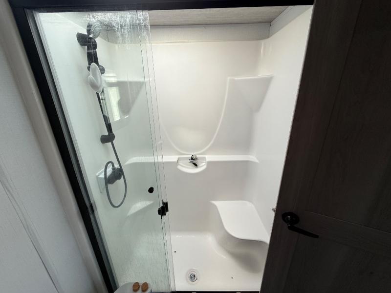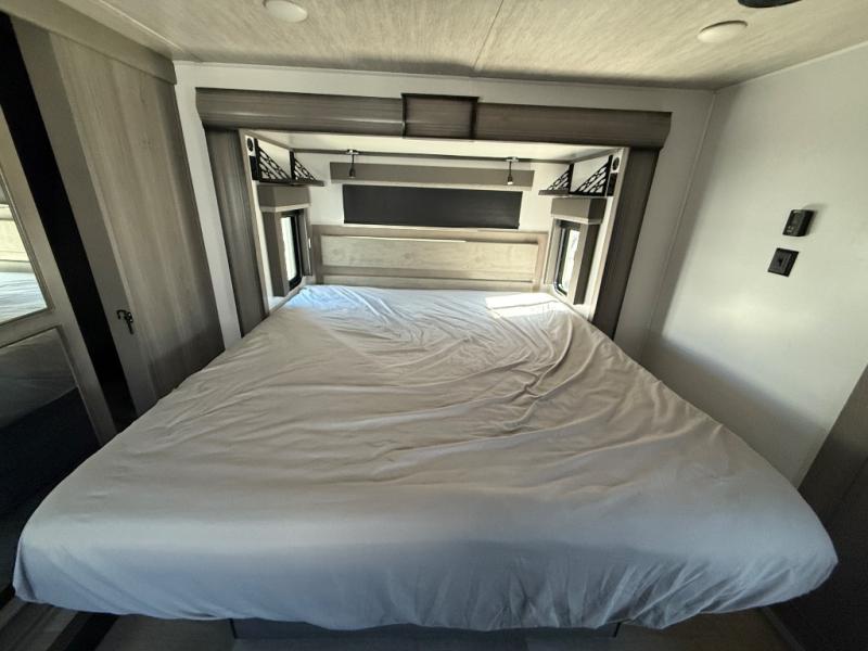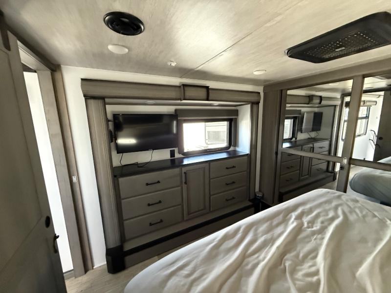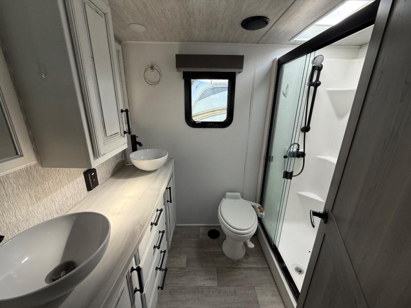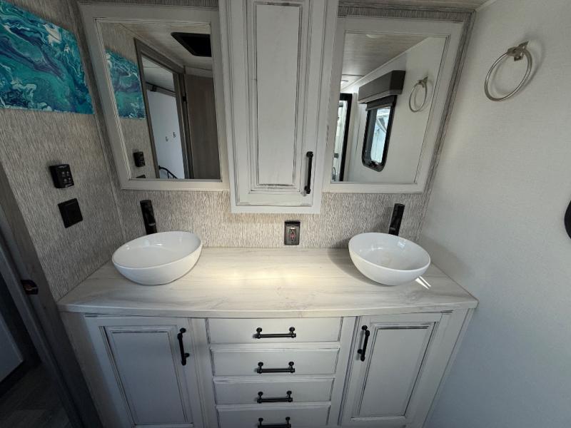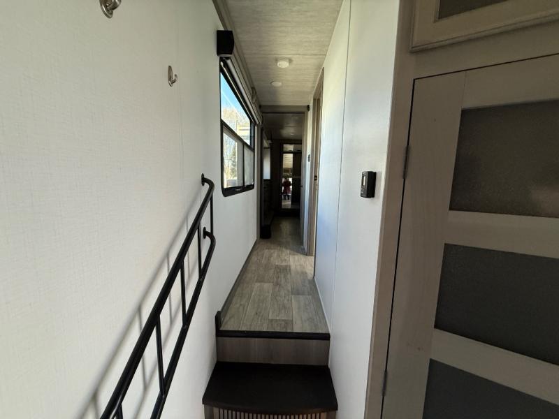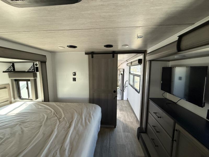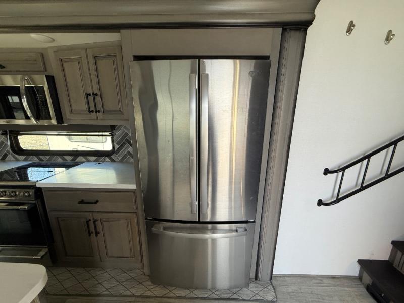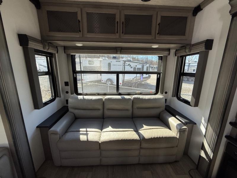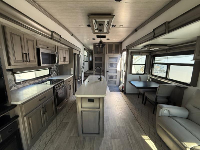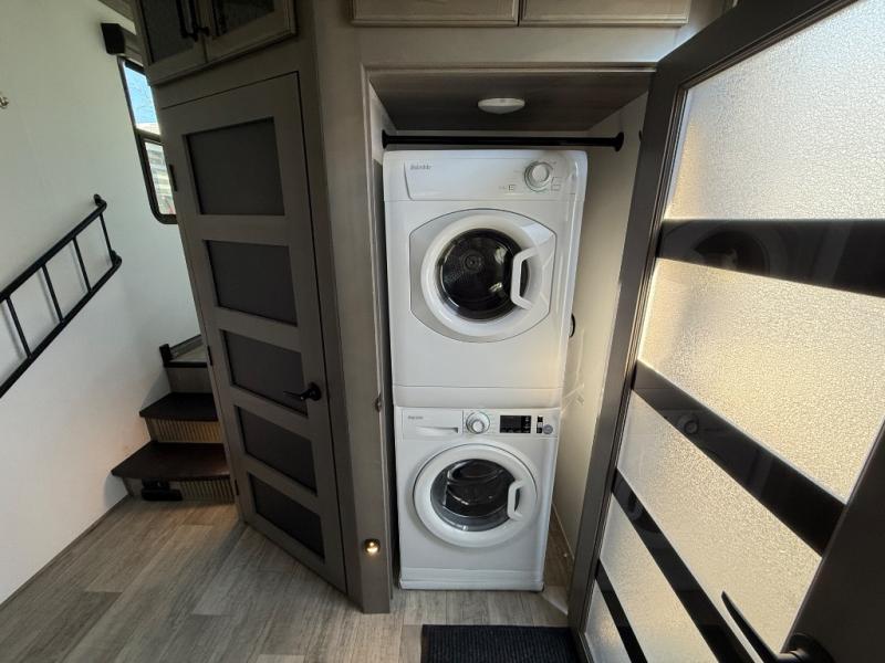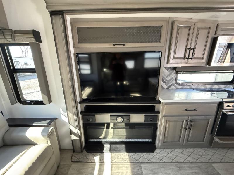 Enjoy a home away from home with this fifth wheel! The front private bedroom has a king bed slide with storage underneath and CPAP shelves across from a 32" HDTV with drawers below it, a large front closet, and a barn door to close it all off. Freshen up each morning in the full bathroom with the 48" x 30" fiberglass shower with a seat and skylight above for more natural lighting as you get ready at the dual sink vanity. The kitchen has everything you need to prepare your best meals including extra countertop space on the kitchen island and even a closet that is prepped to add the optional washer and dryer so you can quickly grab a clean dish towel. Enjoy your meals at the free standing legless dinette and then relax on the rear hide-a-bed sofa or the power Thomas Payne theater seating across from the entertainment center with a 5,000 BTU decorative fireplace heater and 50" LCD HDTV to watch your favorite movies!