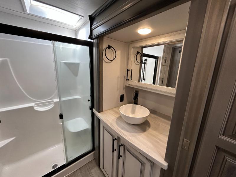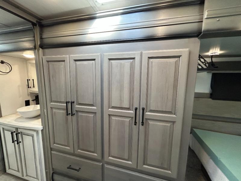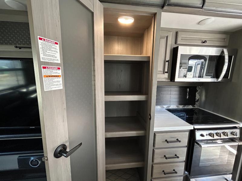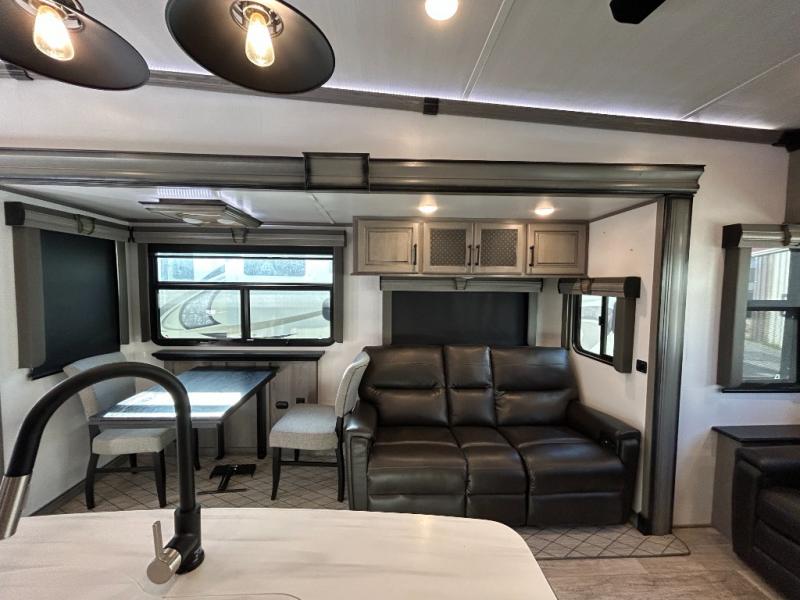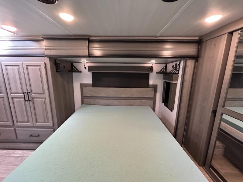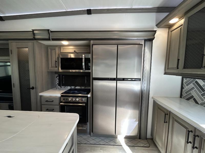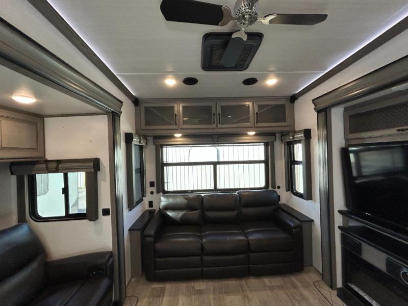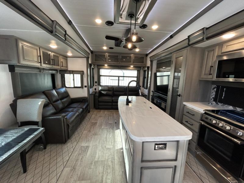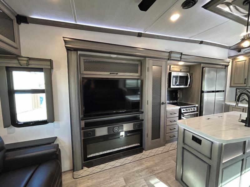 Sleep like royalty in the front master suite of this fifth wheel! It features a king bed slide with storage underneath, a front large closet, an area prepped to add an optional washer and dryer, a walk-in closet with a wardrobe, and an entrance into the dual entry bathroom. The chef can prepare their best meals with the glass top range, the pull-down spice rack, the kitchen island, and the hutch with countertop space below it. Enjoy your meals at the free standing legless dinette and then head to the rear living area for a relaxing evening watching your favorite movie on the 50" LCD HDTV while a fire goes in the 5,000 BTU decorative fireplace heater across from the power Thomas Payne theater seating and rear hide-a-bed sofa which can also transform into an extra sleeping space!