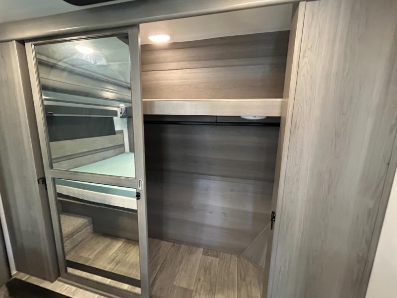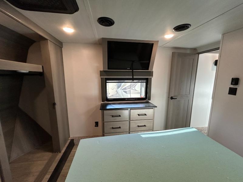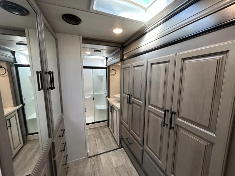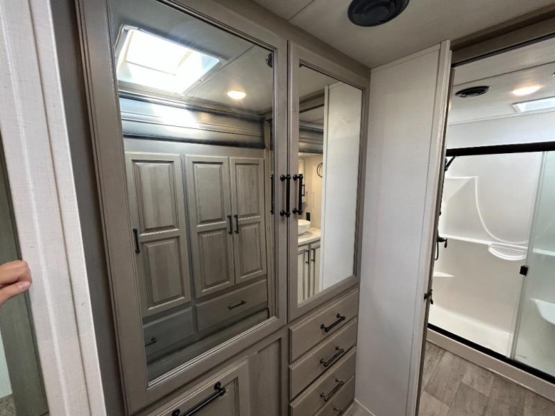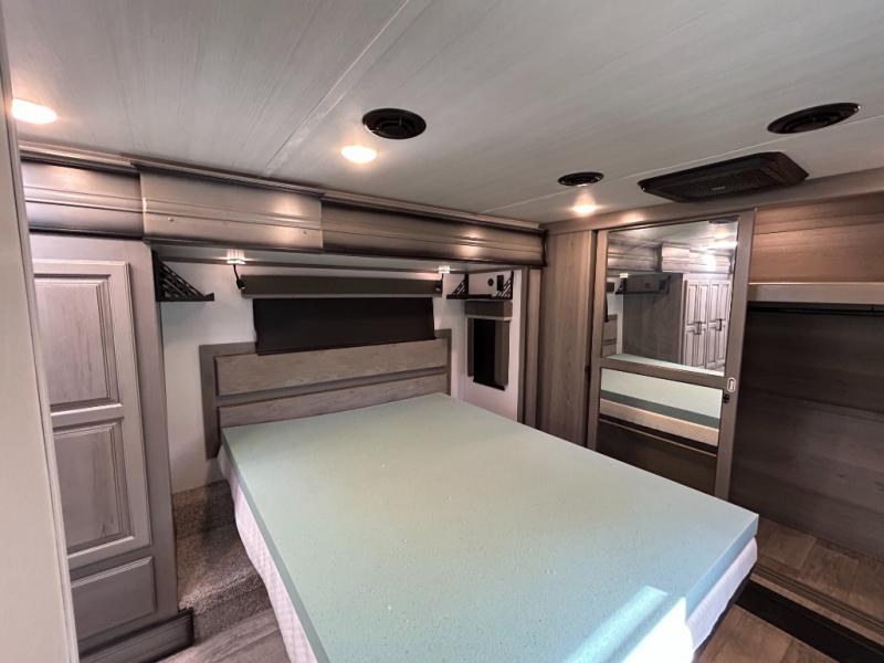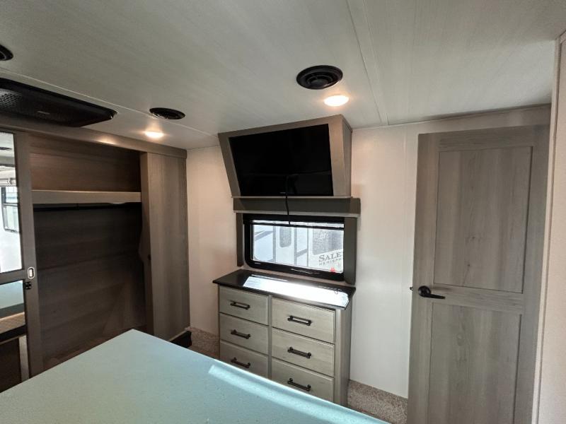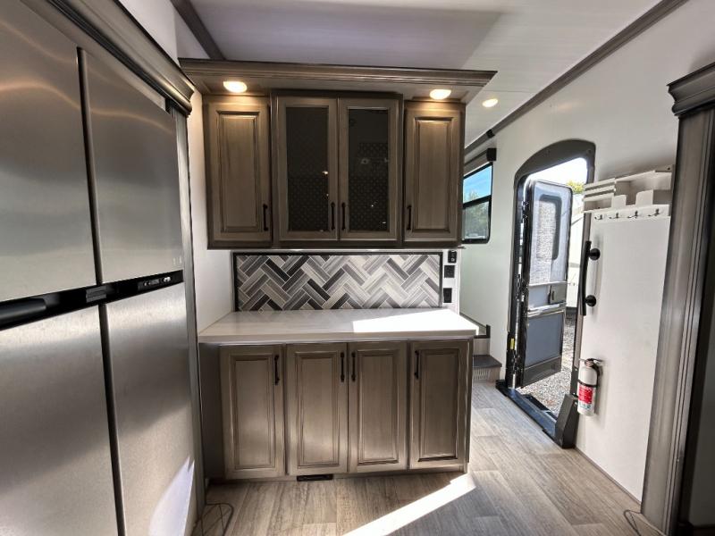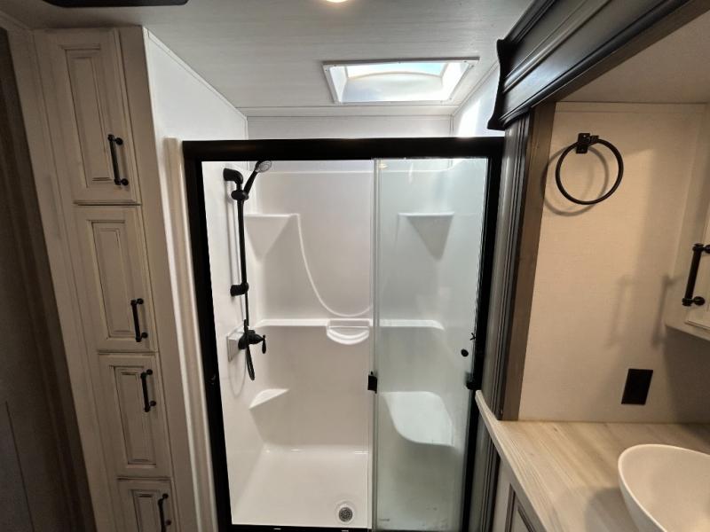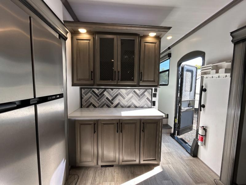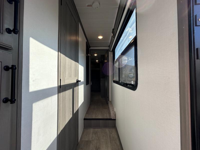 Sleep like royalty in the front master suite of this fifth wheel! It features a king bed slide with storage underneath, a front large closet, an area prepped to add an optional washer and dryer, a walk-in closet with a wardrobe, and an entrance into the dual entry bathroom. The chef can prepare their best meals with the glass top range, the pull-down spice rack, the kitchen island, and the hutch with countertop space below it. Enjoy your meals at the free standing legless dinette and then head to the rear living area for a relaxing evening watching your favorite movie on the 50" LCD HDTV while a fire goes in the 5,000 BTU decorative fireplace heater across from the power Thomas Payne theater seating and rear hide-a-bed sofa which can also transform into an extra sleeping space!