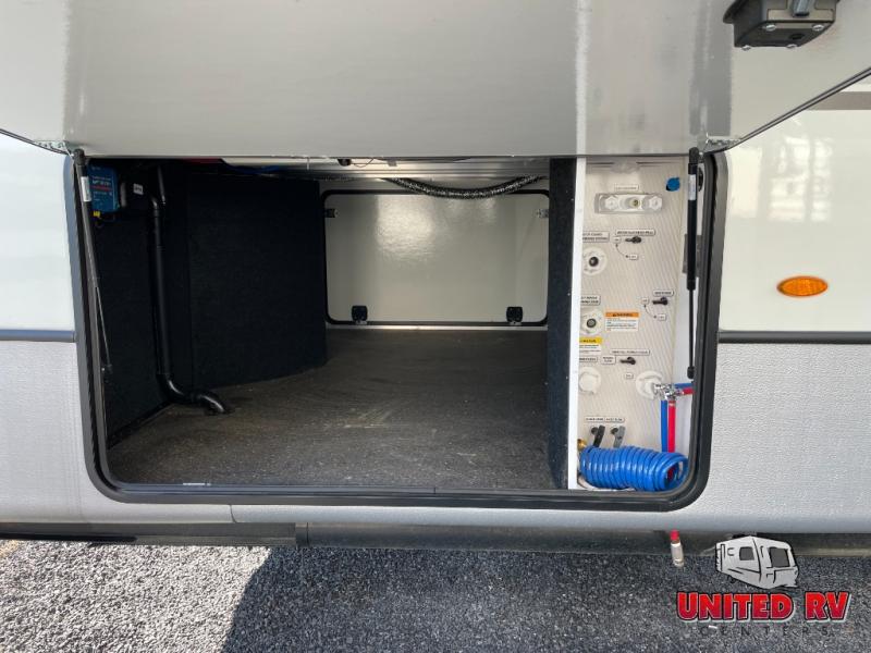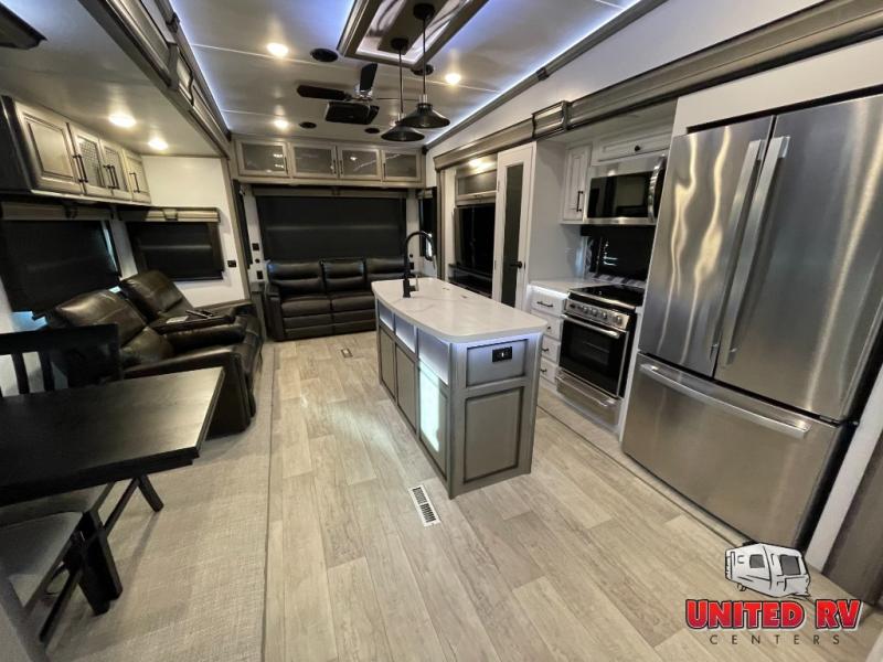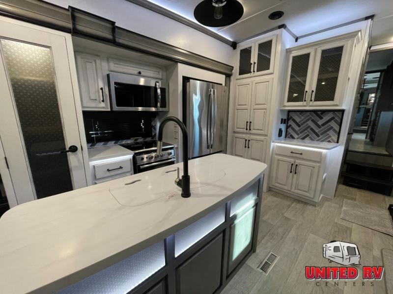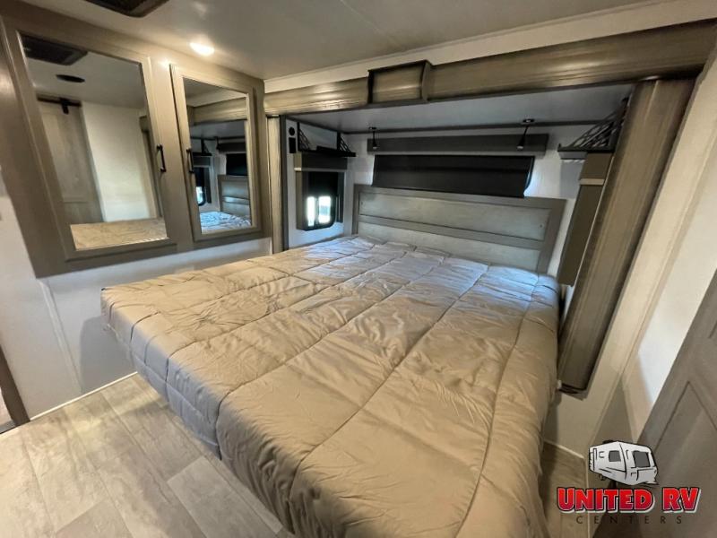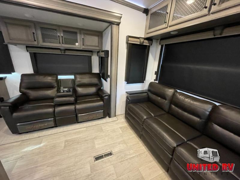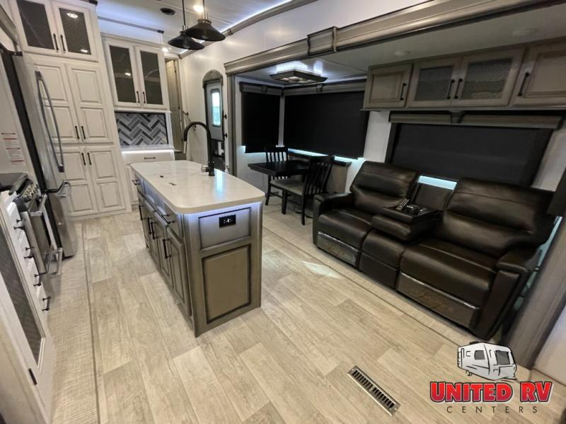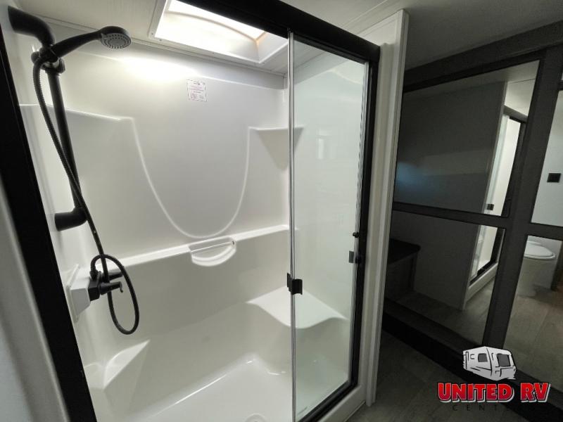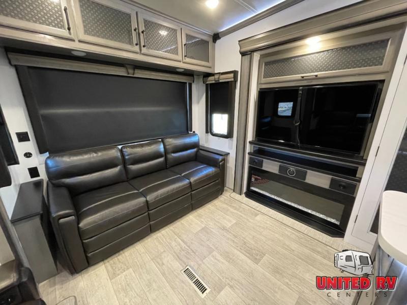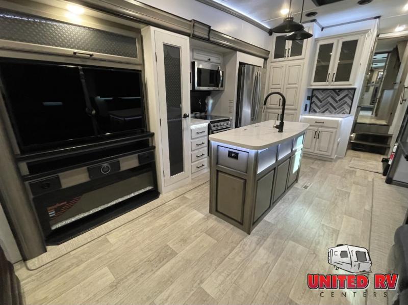 Pack your bags and hitch up this fifth wheel for a fun weekend getaway! The front full bathroom will have you feeling right at home with a large front closet with shelves on either side, a second closet, a bench seat, a 48" x 30" fiberglass shower with a seat and skylight above, and a dual sink vanity for two to get ready at once. It even leads into the master suite where you will find a king bed slide with CPAP shelves above it and storage underneath. There is much to love about the kitchen from the coffee station next to the area prepped for an optional washer and dryer to the kitchen island, the glass top range with a pull-down spice rack above it, and the half bathroom. Enjoy your meals at the free standing legless dinette with storage and 110V outlets then relax on either the rear hide-a-bed sofa or power Thomas Payne theater seating across from the entertainment center with a 5,000 BTU decorative fireplace heater and 50" LCD HDTV to watch your favorite movies!