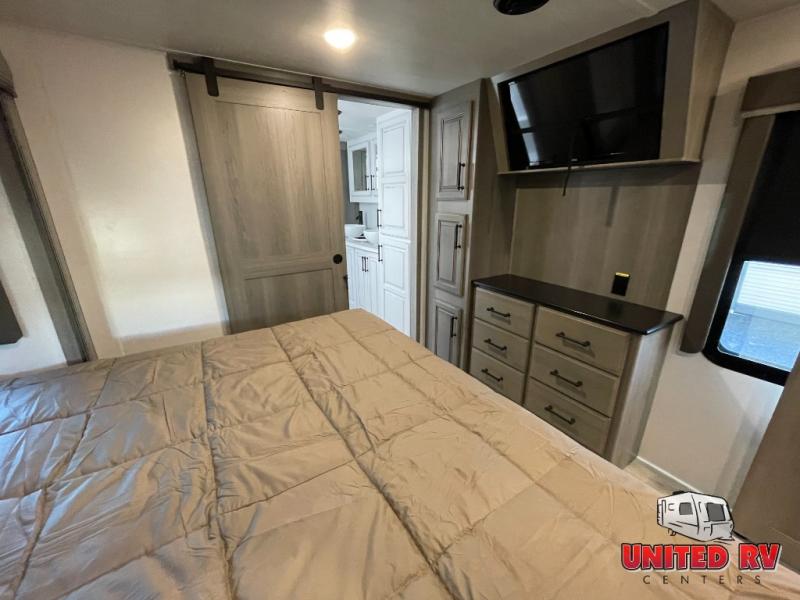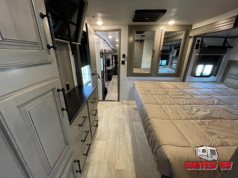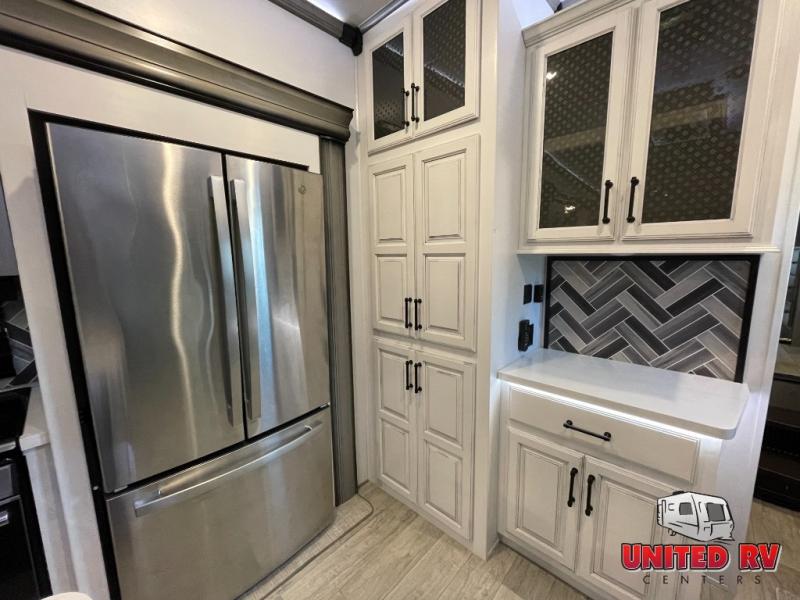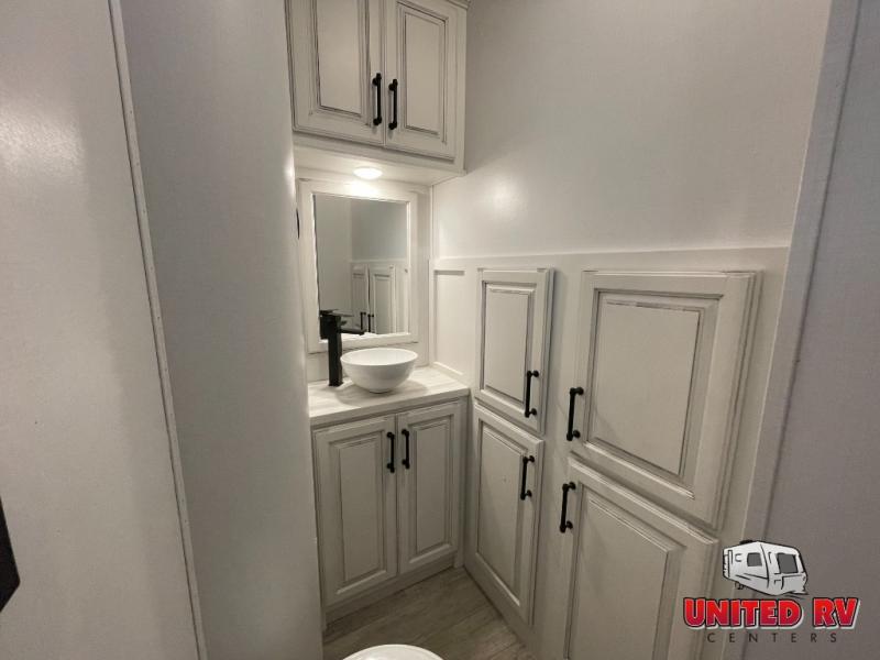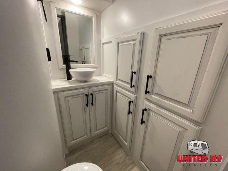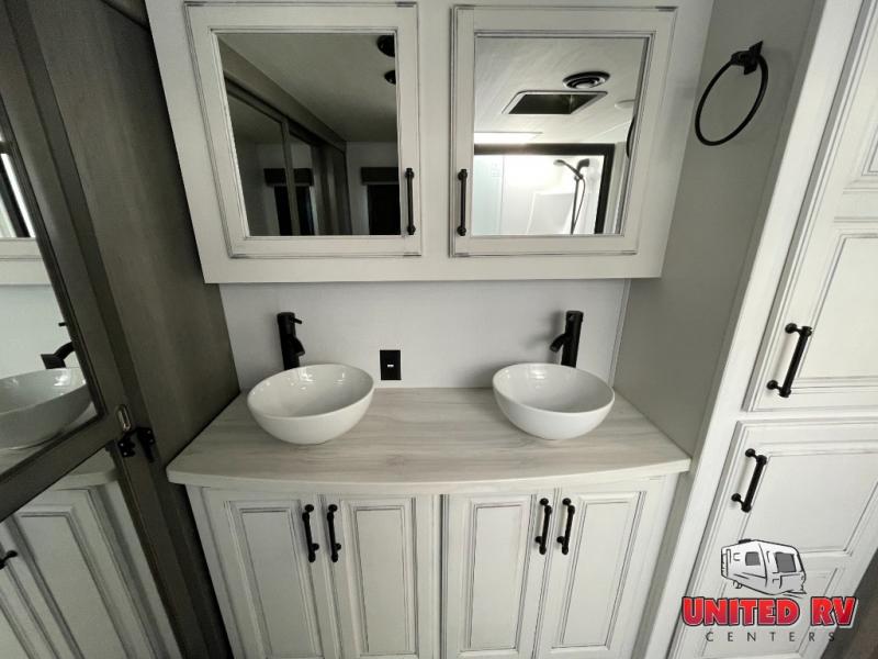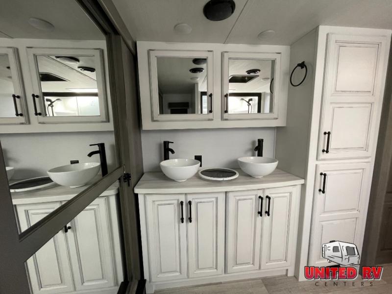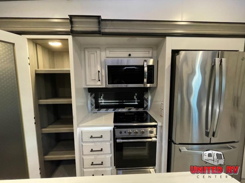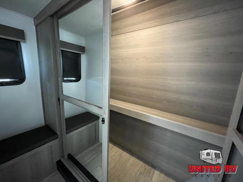 Pack your bags and hitch up this fifth wheel for a fun weekend getaway! The front full bathroom will have you feeling right at home with a large front closet with shelves on either side, a second closet, a bench seat, a 48" x 30" fiberglass shower with a seat and skylight above, and a dual sink vanity for two to get ready at once. It even leads into the master suite where you will find a king bed slide with CPAP shelves above it and storage underneath. There is much to love about the kitchen from the coffee station next to the area prepped for an optional washer and dryer to the kitchen island, the glass top range with a pull-down spice rack above it, and the half bathroom. Enjoy your meals at the free standing legless dinette with storage and 110V outlets then relax on either the rear hide-a-bed sofa or power Thomas Payne theater seating across from the entertainment center with a 5,000 BTU decorative fireplace heater and 50" LCD HDTV to watch your favorite movies!