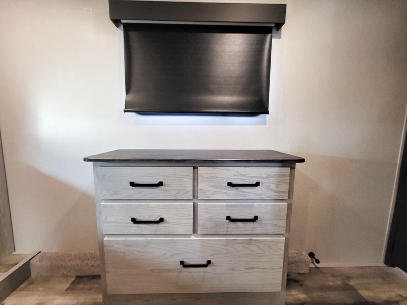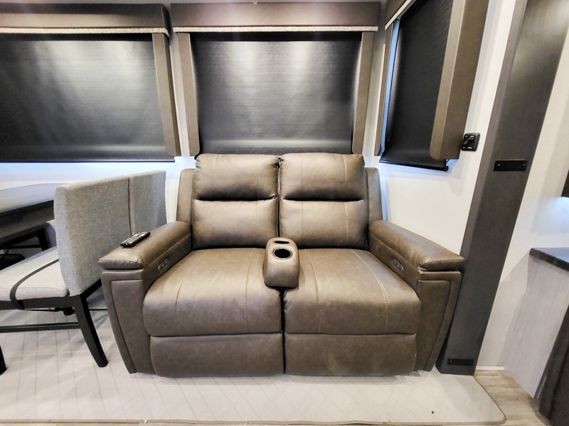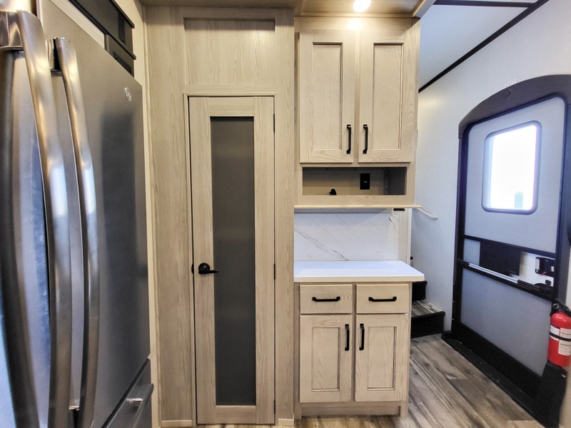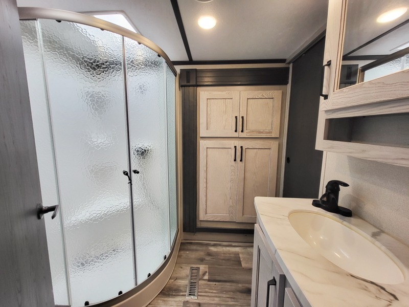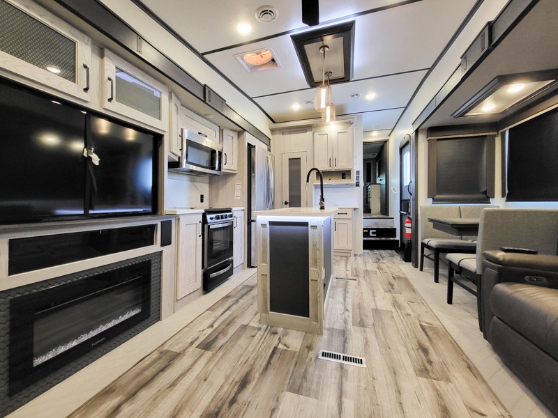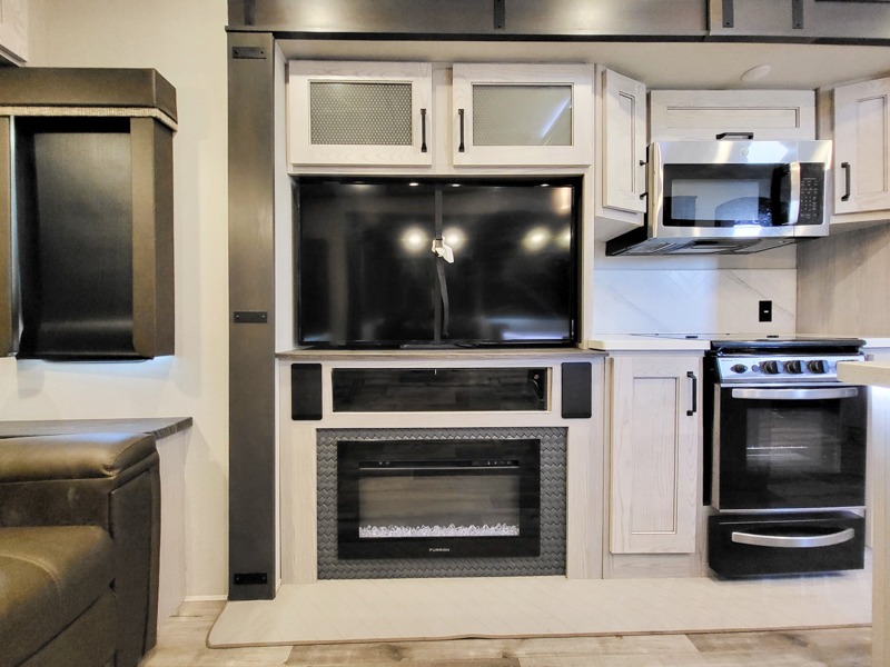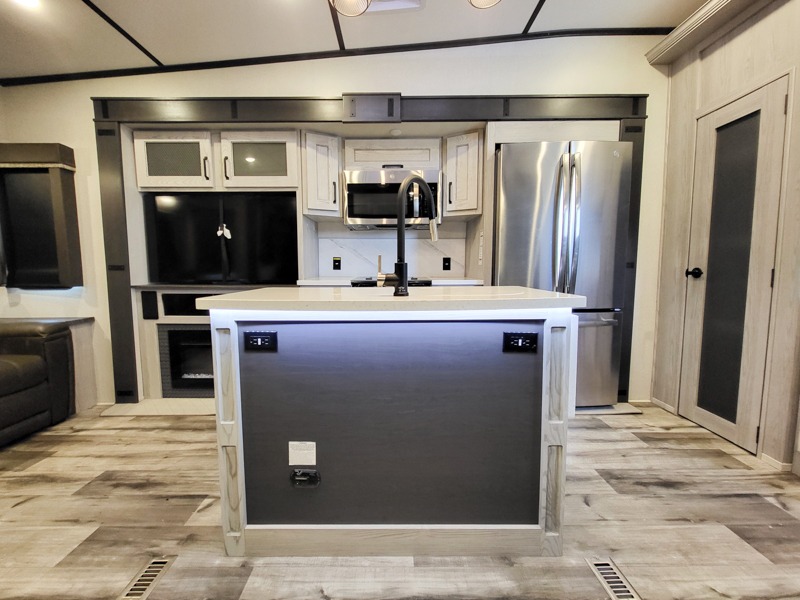You can take this Montana High Country fifth wheel to the campsite of your choice! You'll have plenty of comfort with the king-size bed in the front master suite, and you can also let some friends or kids sleep on the hide-a-bed sofa in the rear living area. While you watch the 50" LCD TV, you can sit back in the power theater seating, and you can switch on the fireplace for some added heat if it's cool outside. The opposing slides in the main living area are what give you extra space to work freely around the kitchen island, and the coffee station allows you to prepare your afternoon pick-me-up with all of your coffee essentials sitting in one place just like at home.