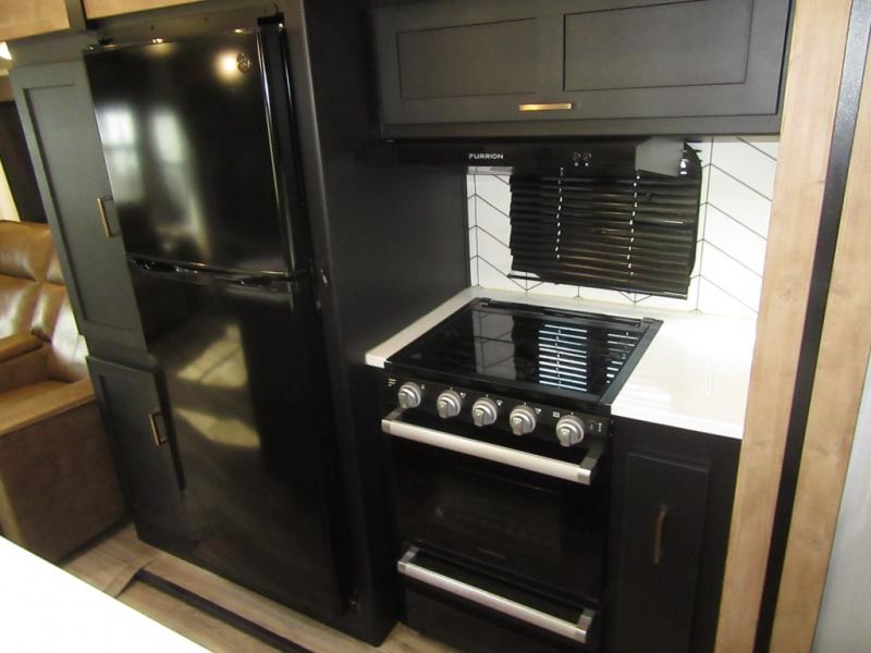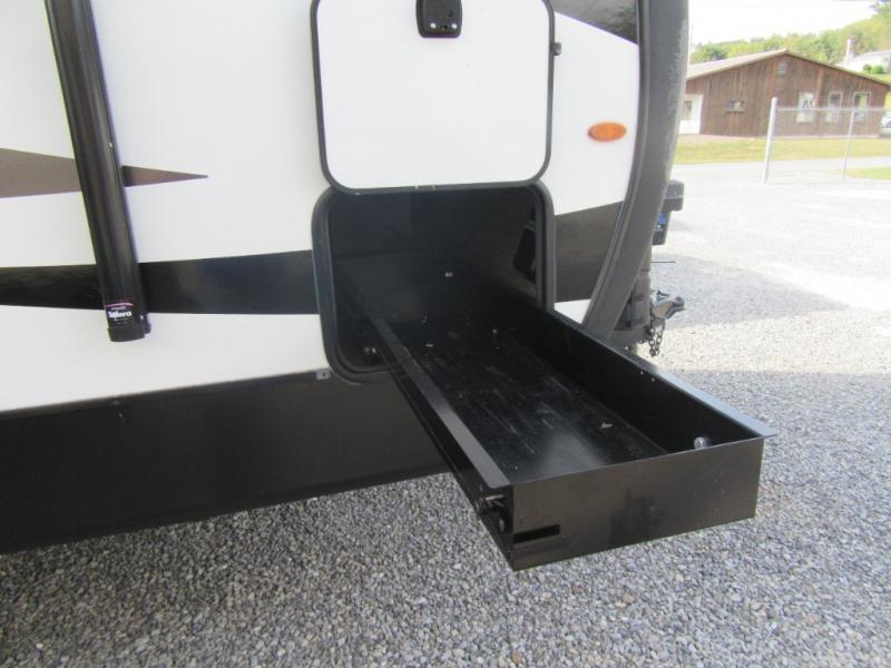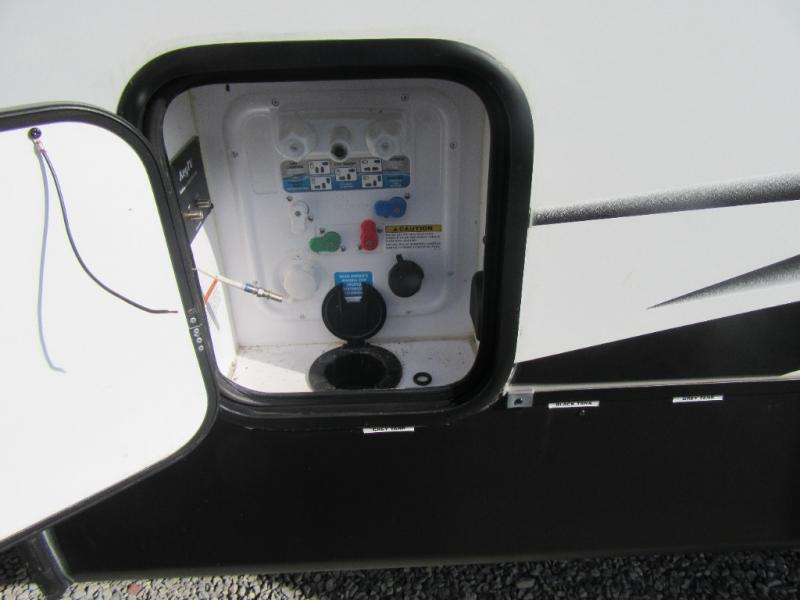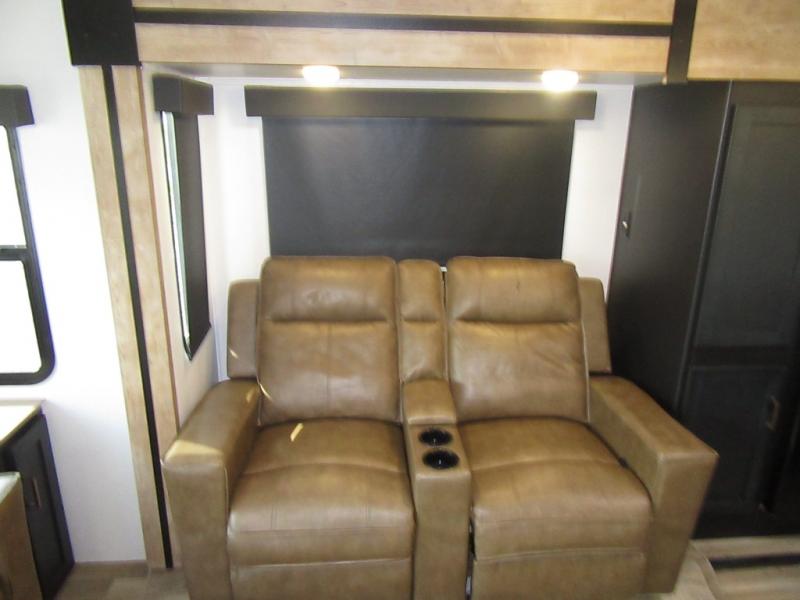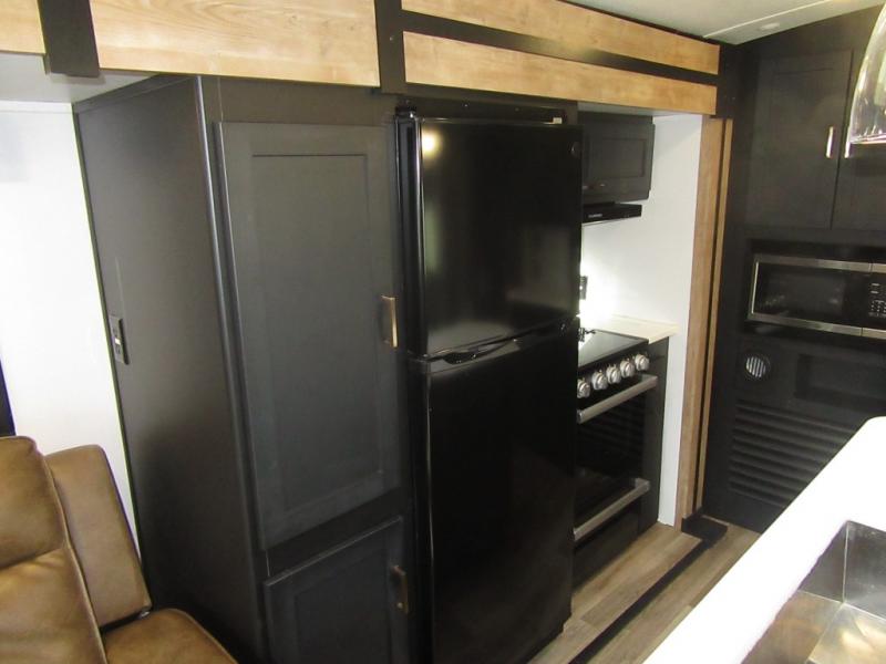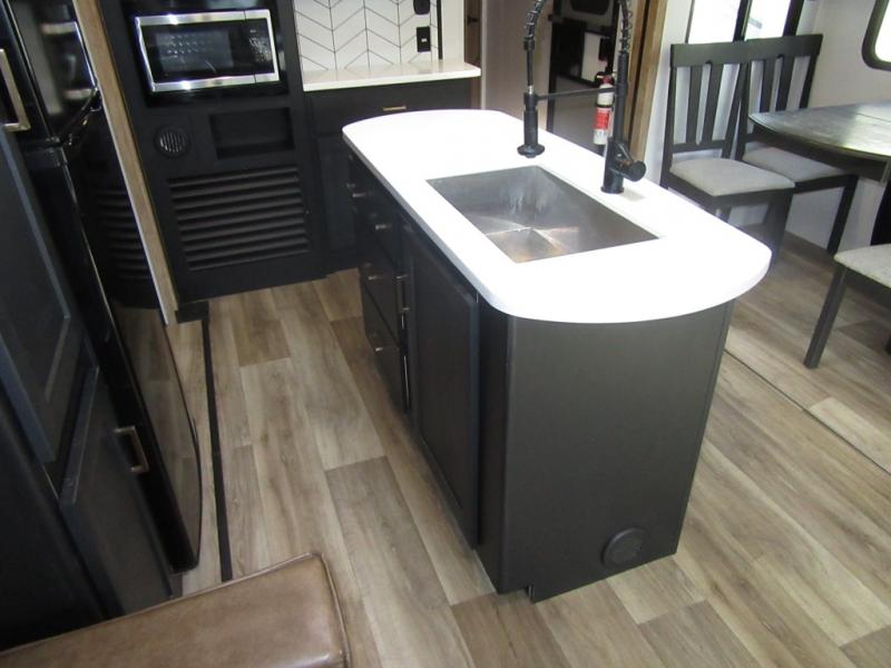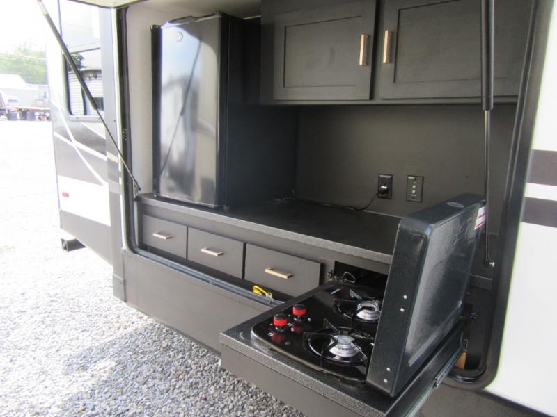 A spacious rear living area is created by two opposing slide outs giving everyone plenty of floor space to move from the sofa sleeper to the double entry bathroom and front private bedroom. You can relax on the theater seats while watching the 50" HDTV with fireplace below, and dine at the booth dinette. The kitchen island is a great place to wash the veggies and fruit, and prepare meals. The cook will have full amenities including more counter space near the microwave. And there is an outside kitchen with a flip-out stove and more. The slide out king bed gives you more space in the front bedroom, and you will find plenty of storage and a place for your best friend in the built-in pet kennel. You may choose to change the 10 cu. ft. refrigerator to an 8 cu. ft. option and/or replace the dinette that comes standard with a table and chairs option.