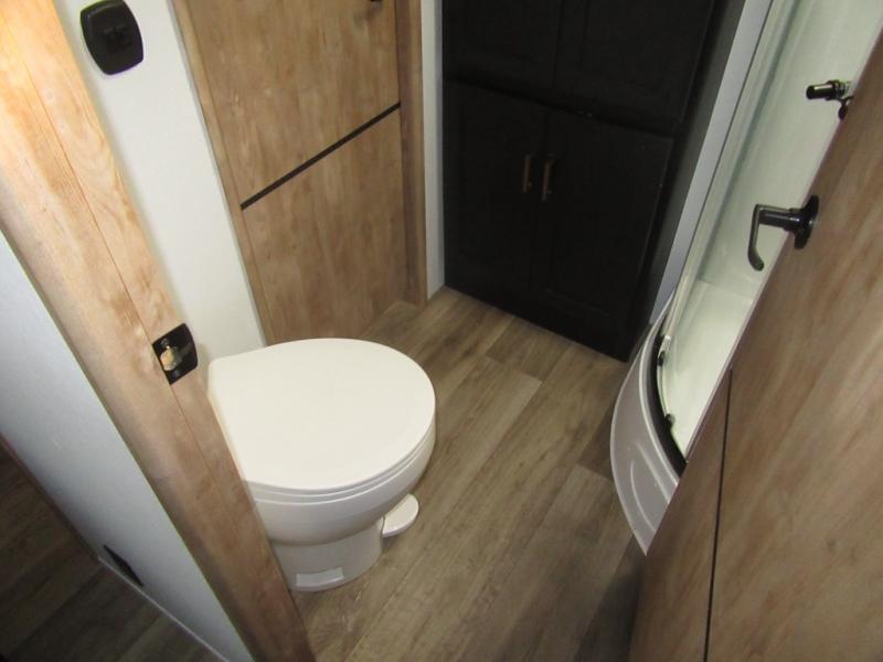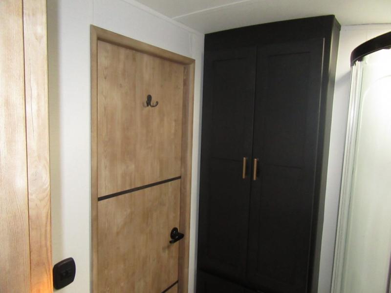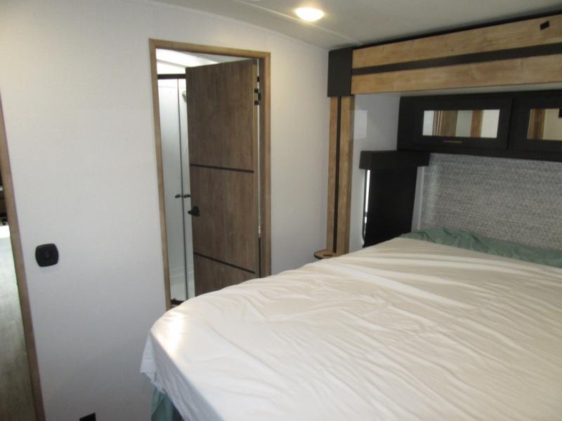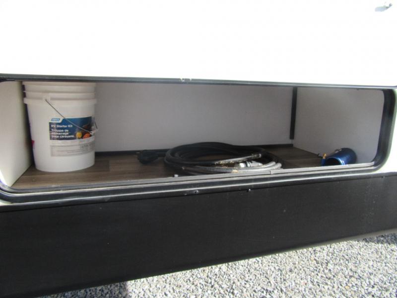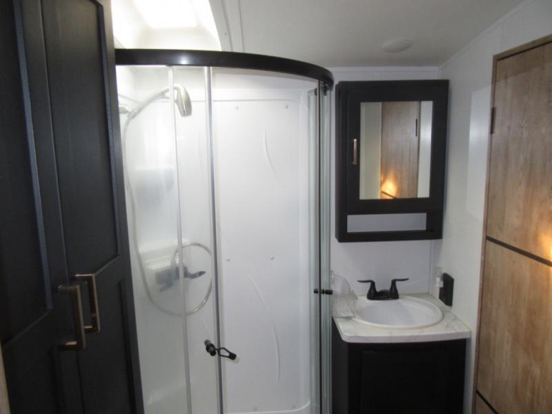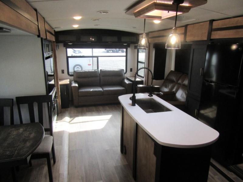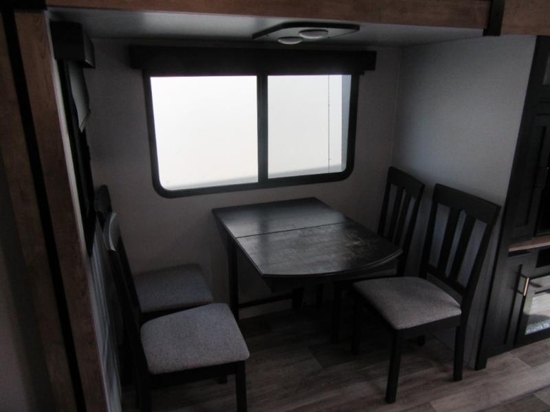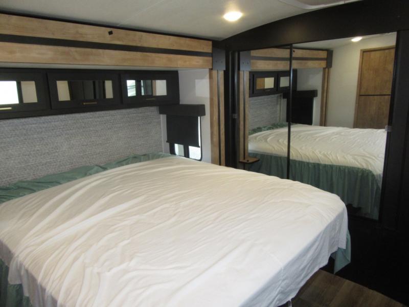 A spacious rear living area is created by two opposing slide outs giving everyone plenty of floor space to move from the sofa sleeper to the double entry bathroom and front private bedroom. You can relax on the theater seats while watching the 50" HDTV with fireplace below, and dine at the booth dinette. The kitchen island is a great place to wash the veggies and fruit, and prepare meals. The cook will have full amenities including more counter space near the microwave. And there is an outside kitchen with a flip-out stove and more. The slide out king bed gives you more space in the front bedroom, and you will find plenty of storage and a place for your best friend in the built-in pet kennel. You may choose to change the 10 cu. ft. refrigerator to an 8 cu. ft. option and/or replace the dinette that comes standard with a table and chairs option.
