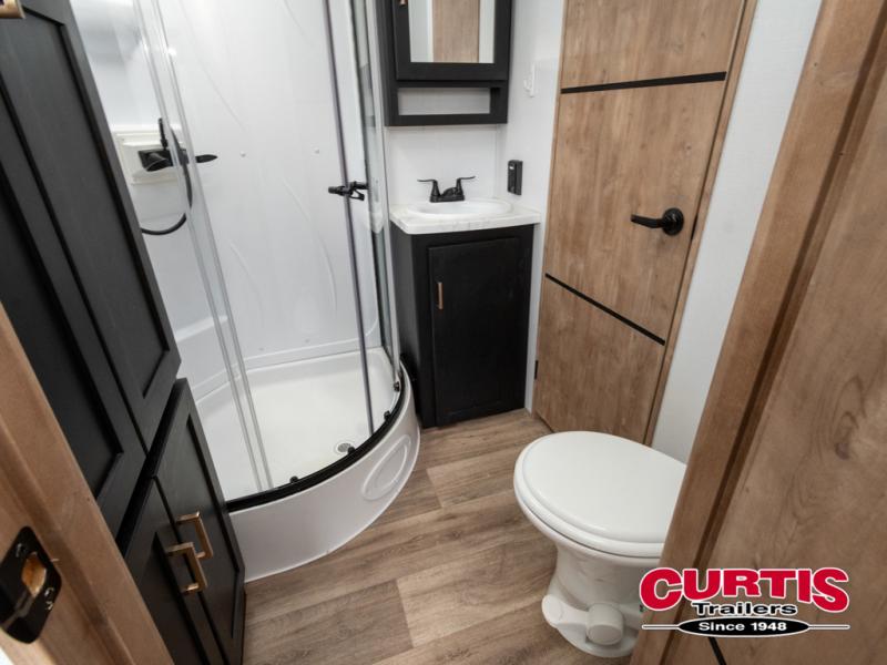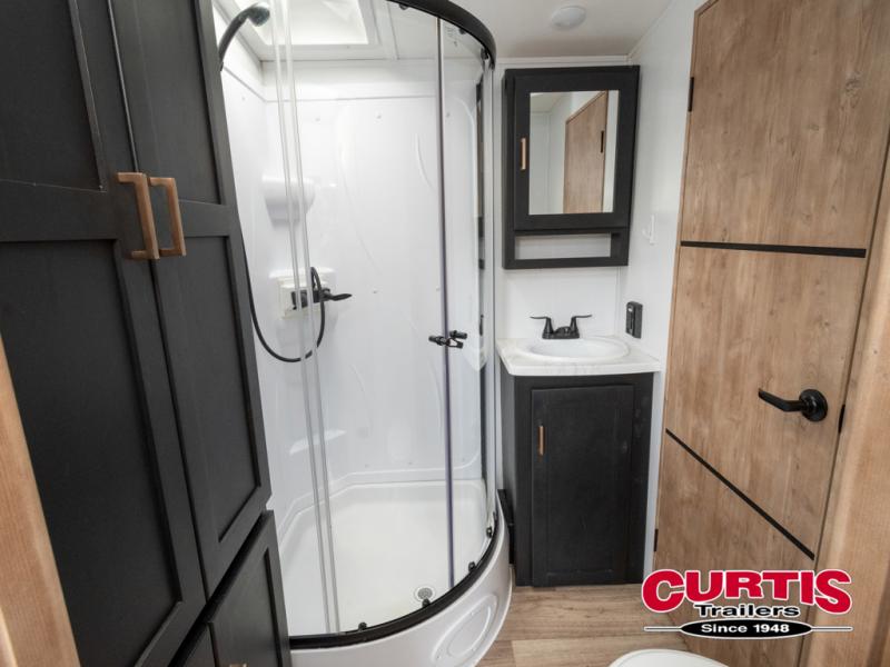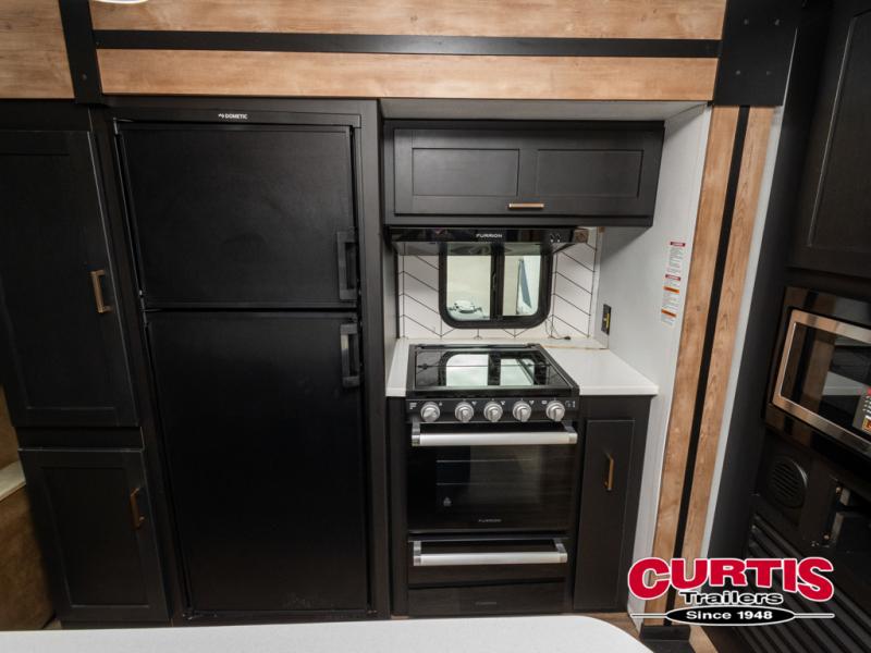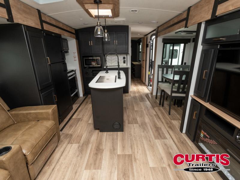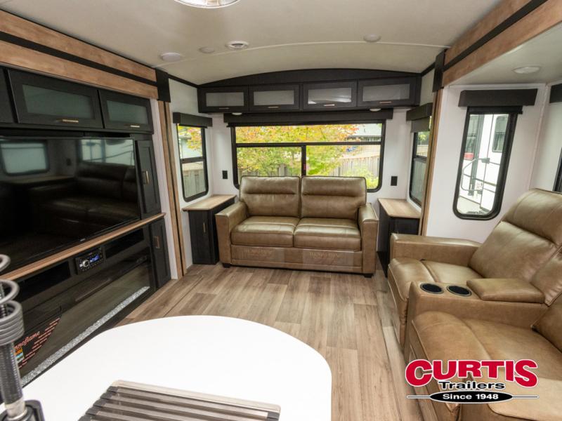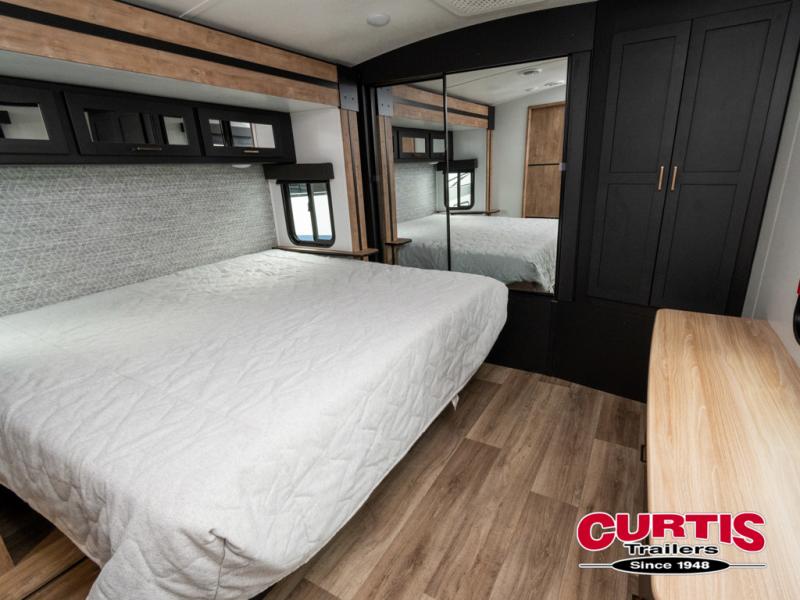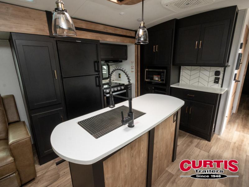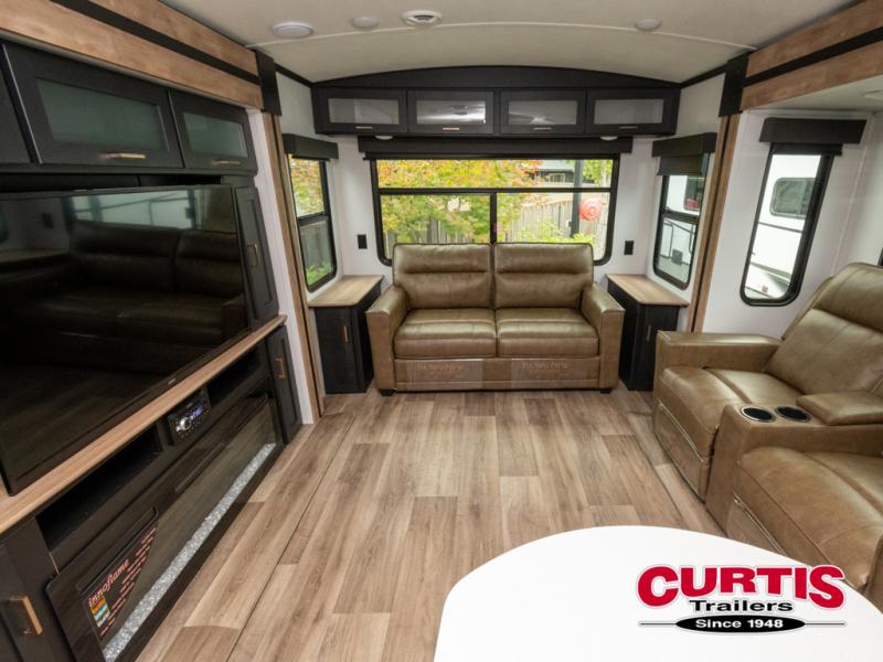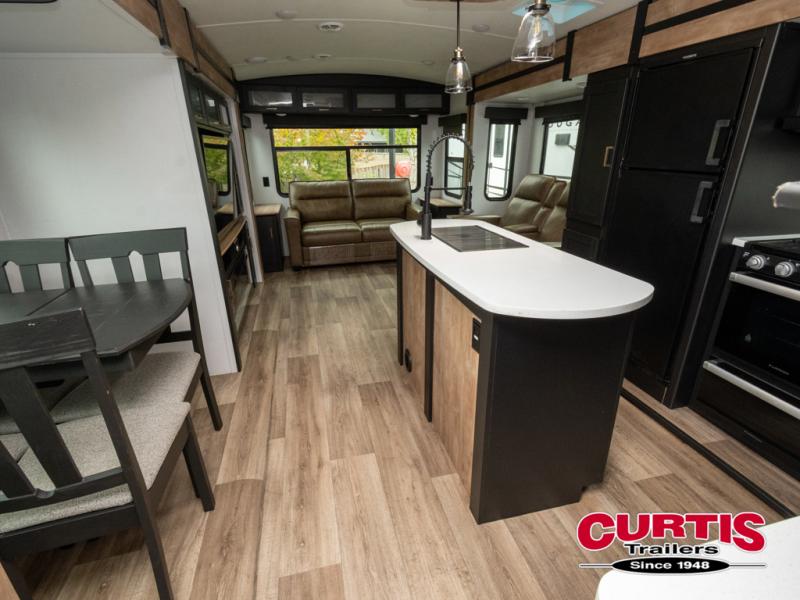 A spacious rear living area is created by two opposing slide outs giving everyone plenty of floor space to move from the sofa sleeper to the double entry bathroom and front private bedroom. You can relax on the theater seats while watching the 50" HDTV with fireplace below, and dine at the booth dinette. The kitchen island is a great place to wash the veggies and fruit, and prepare meals. The cook will have full amenities including more counter space near the microwave. And there is an outside kitchen with a flip-out stove and more. The slide out king bed gives you more space in the front bedroom, and you will find plenty of storage and a place for your best friend in the built-in pet kennel. You may choose to change the 10 cu. ft. refrigerator to an 8 cu. ft. option and/or replace the dinette that comes standard with a table and chairs option.
