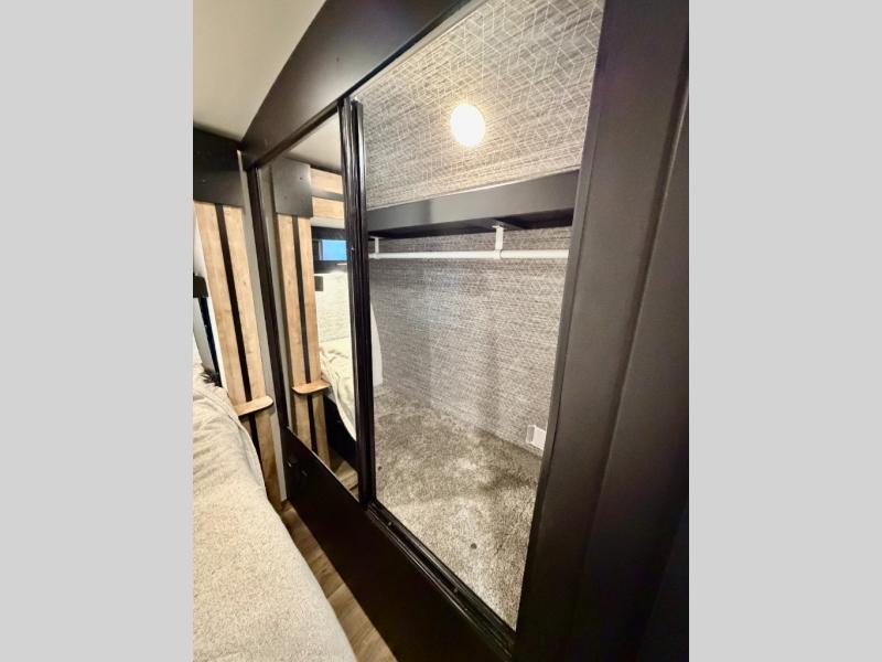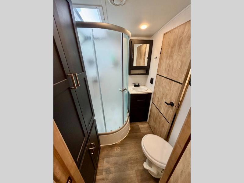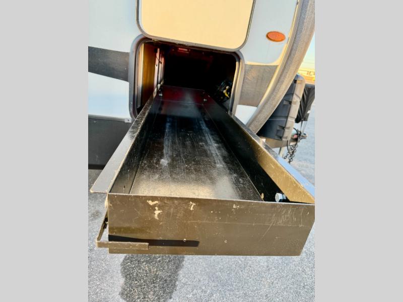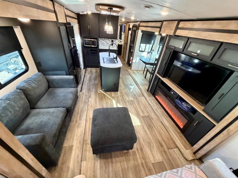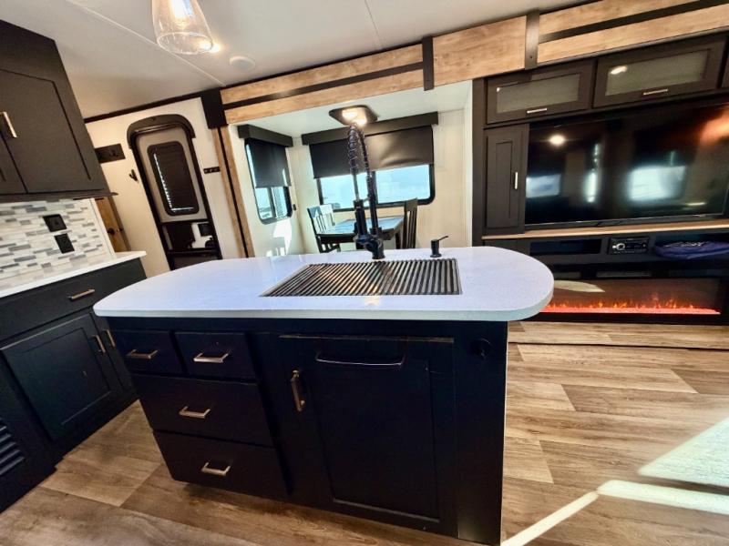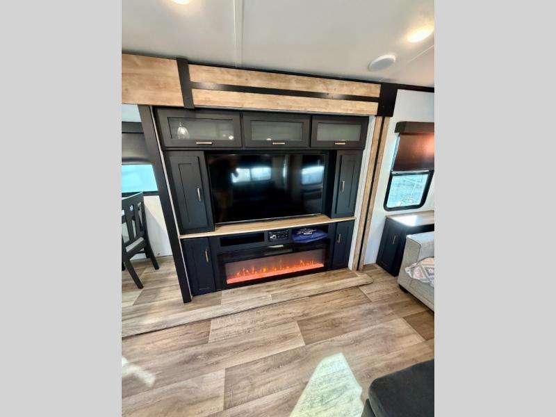 A spacious rear living area is created by two opposing slide outs giving everyone plenty of floor space to move from the sofa sleeper to the double entry bathroom and front private bedroom. You can relax on the theater seats while watching the 50" HDTV with fireplace below, and dine at the booth dinette. The kitchen island is a great place to wash the veggies and fruit, and prepare meals. The cook will have full amenities including more counter space near the microwave. And there is an outside kitchen with a flip-out stove and more. The slide out king bed gives you more space in the front bedroom, and you will find plenty of storage and a place for your best friend in the built-in pet kennel. You may choose to change the 10 cu. ft. refrigerator to an 8 cu. ft. option and/or replace the dinette that comes standard with a table and chairs option.