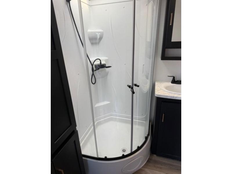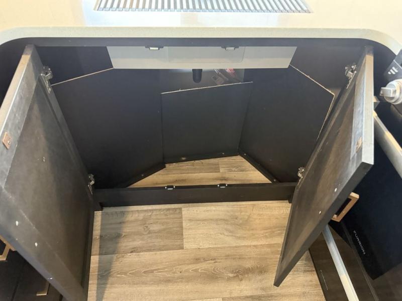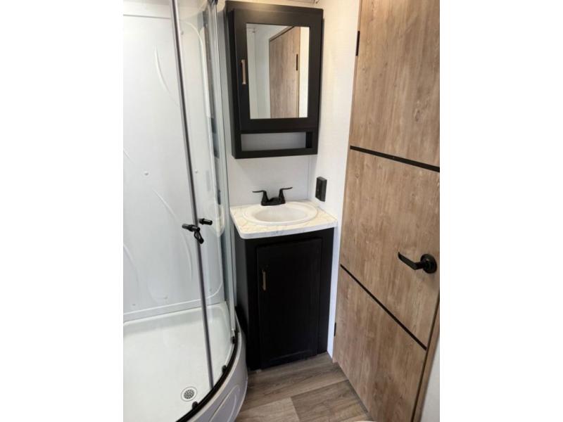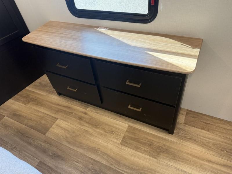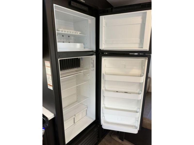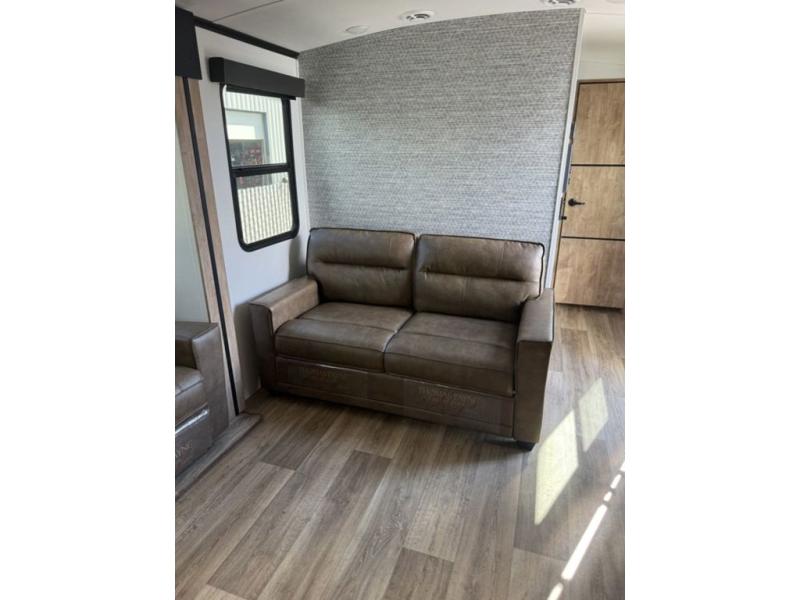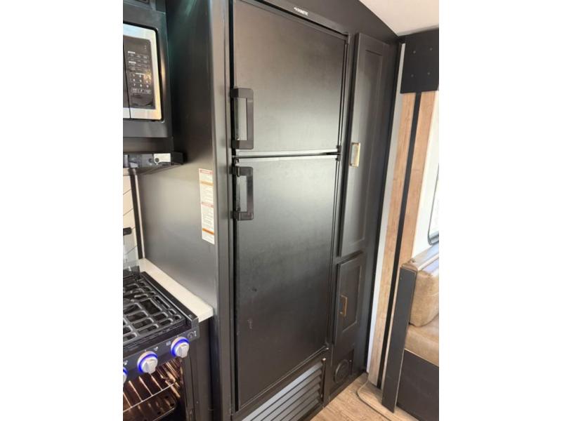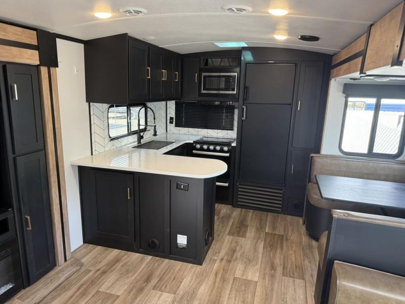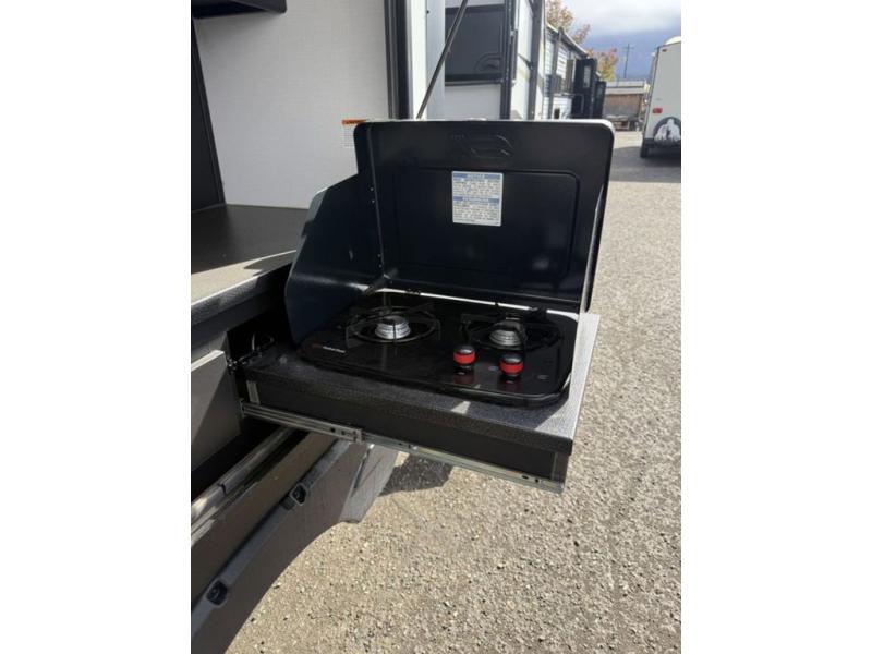 Get ready for fun in the great outdoors with this travel trailer at your favorite campsite! You can hike, visit with other RVers, and enjoy a spacious middle living area and rear kitchen to relax in after making a meal. There is a sleeper sofa and theater seating as well as a booth dinette or choose the table and chairs option if you prefer that type of seating. The 50" TV provides inside entertainment and the fireplace is cozy and inviting. The kitchen offers a U-shaped counter for more prep space, full kitchen amenities including a 10 cu. ft. refrigerator and pantry for all your food. The cook will have the choice of making meals using the outside kitchen that offers a flip-out stove and outside refrigerator to hold more beverages. There is a double entry bathroom for convenience, a king bed slide for extra floor space in the front bedroom, and lots of clothing storage. You might even like to add the washer/dryer option if you plan to stay awhile.
