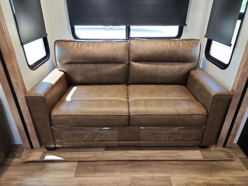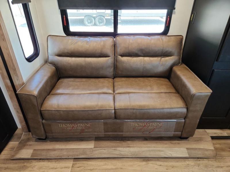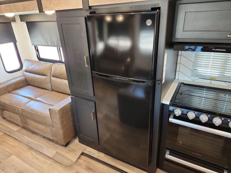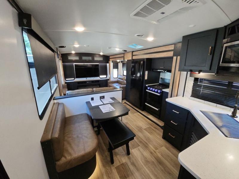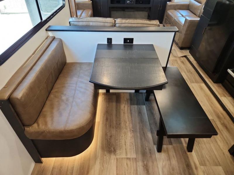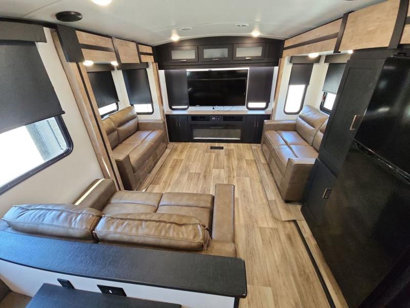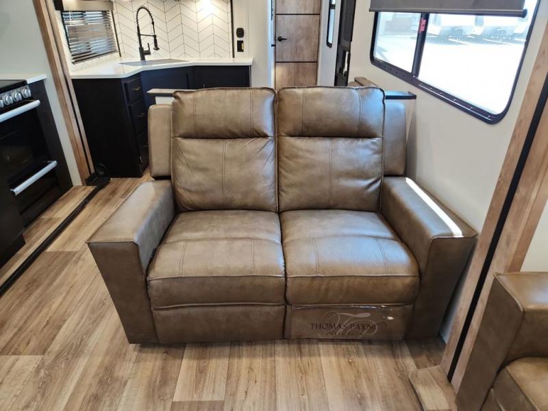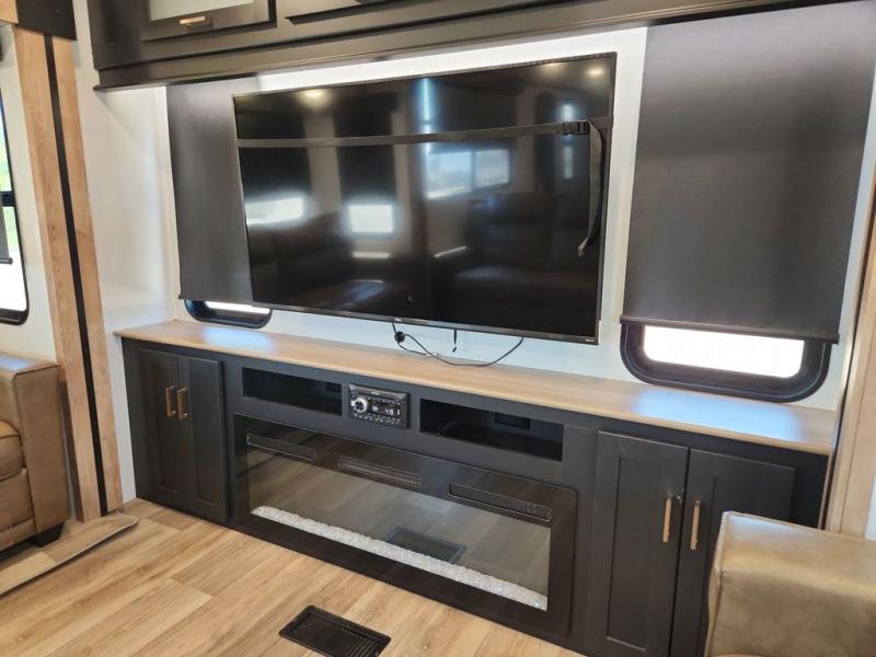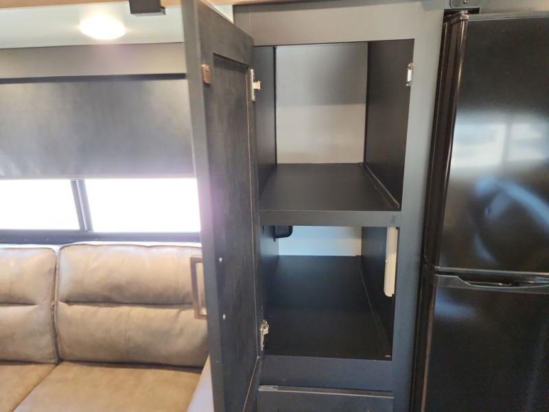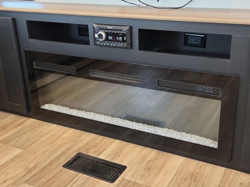 With a rear entertainment center including a 55" HDTV with fireplace below, and dual sofa sleeper slides, you will enjoy a spacious living area to visit with friends while you sit on the theater seats. The middle kitchen offers full amenities including a pantry and 10 cu. ft. refrigerator to store lots of food to feed everyone. The bench dinette seating allows you to dine or work in this area. Everyone will appreciate easy access to the double entry bathroom, especially you when it's nighttime and you are sleeping on the king bed slide out. Your family pet will have their own space, and you will find plenty of storage choices, plus you can add the washer/dryer option if you like.