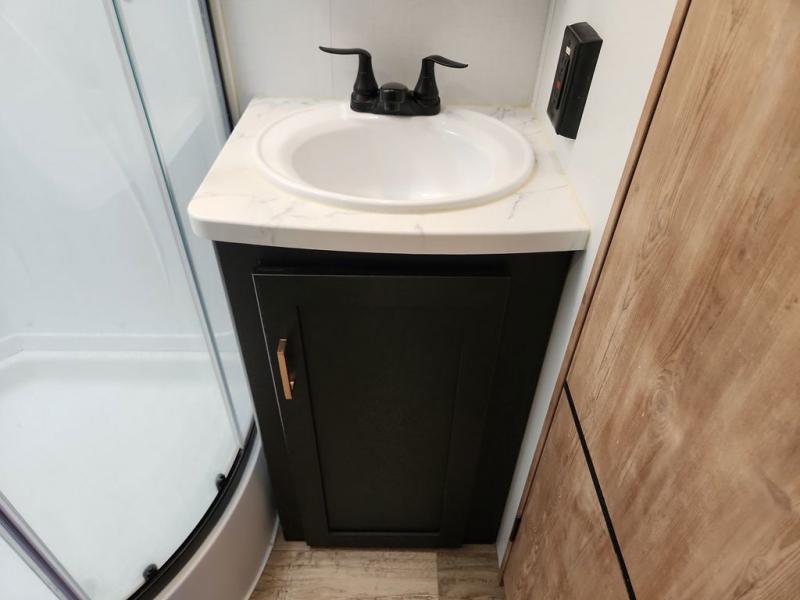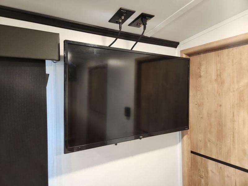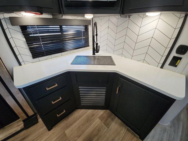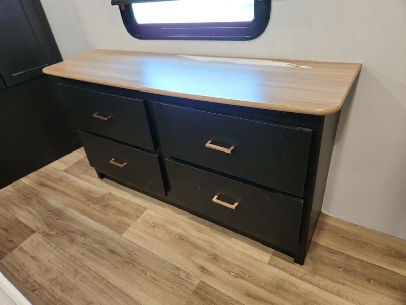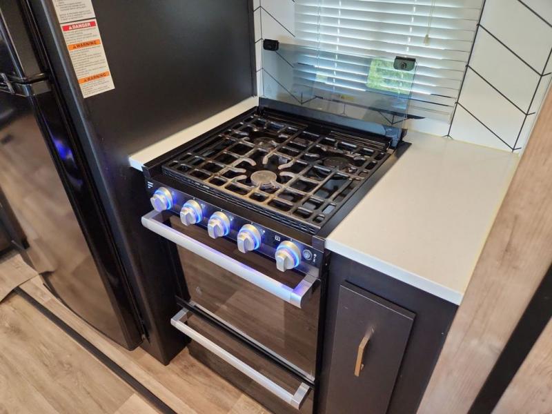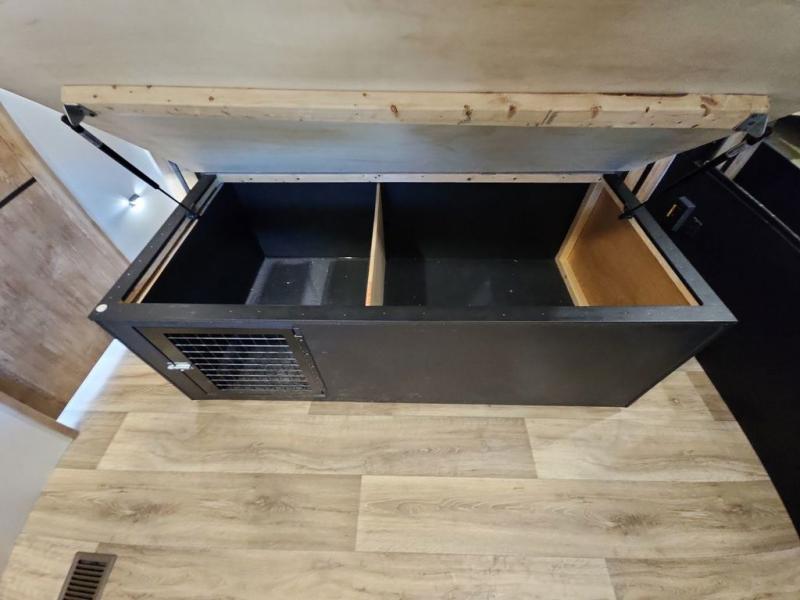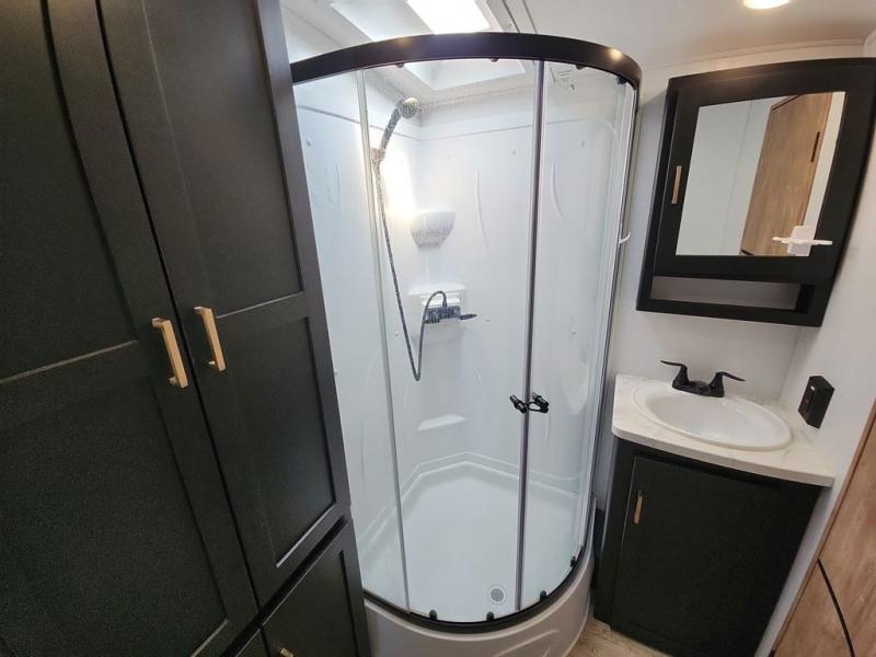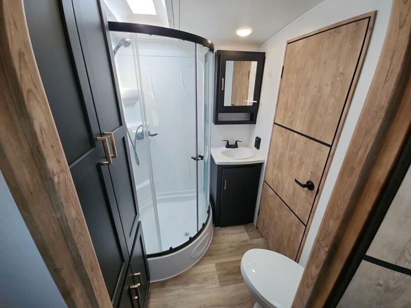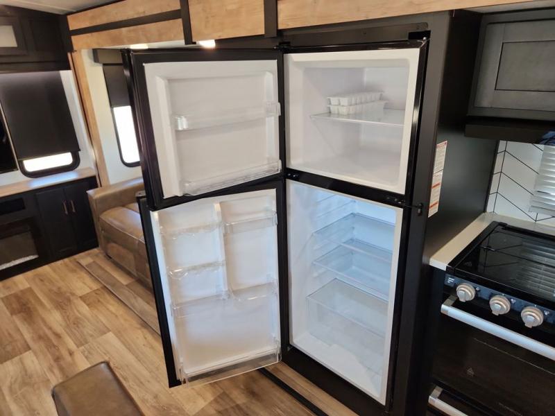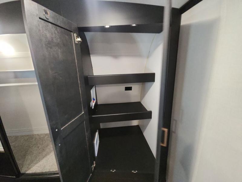 With a rear entertainment center including a 55" HDTV with fireplace below, and dual sofa sleeper slides, you will enjoy a spacious living area to visit with friends while you sit on the theater seats. The middle kitchen offers full amenities including a pantry and 10 cu. ft. refrigerator to store lots of food to feed everyone. The bench dinette seating allows you to dine or work in this area. Everyone will appreciate easy access to the double entry bathroom, especially you when it's nighttime and you are sleeping on the king bed slide out. Your family pet will have their own space, and you will find plenty of storage choices, plus you can add the washer/dryer option if you like.