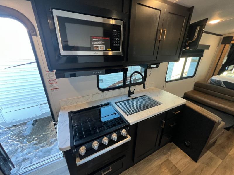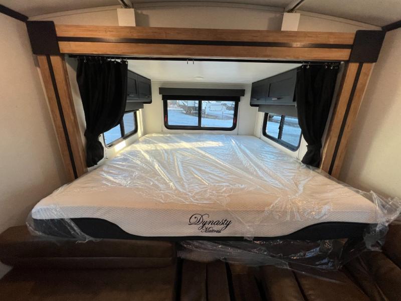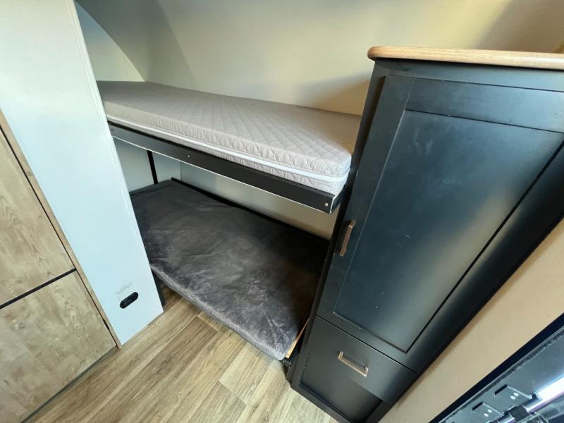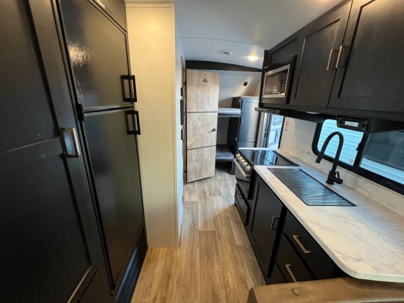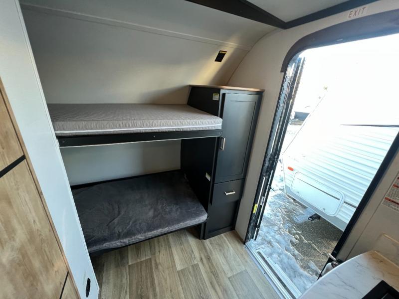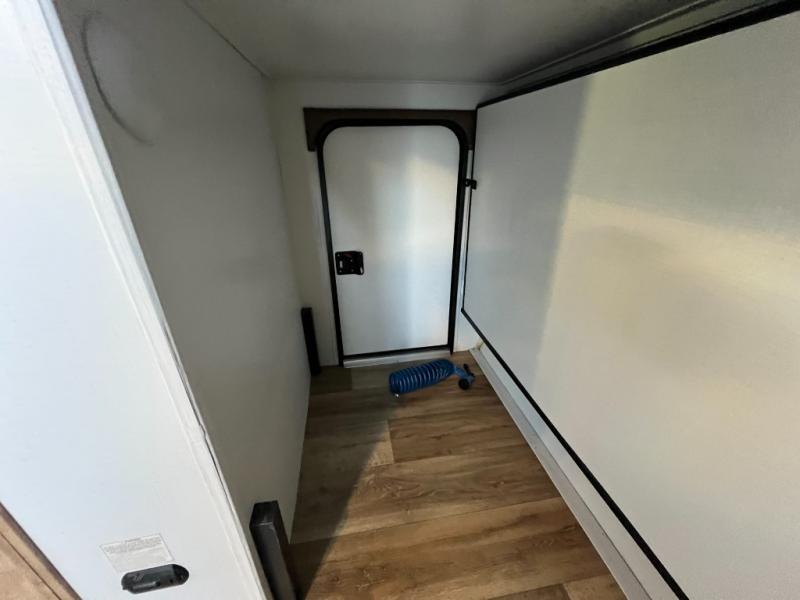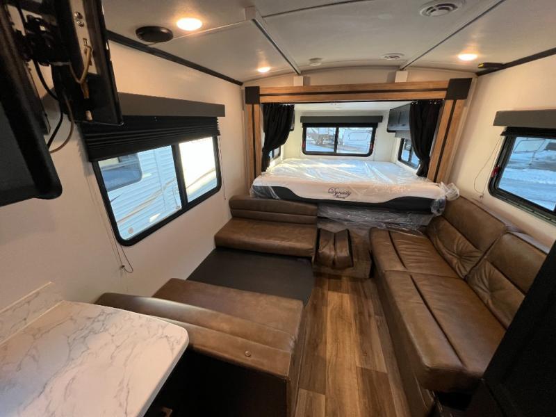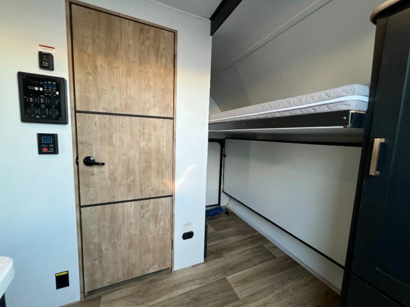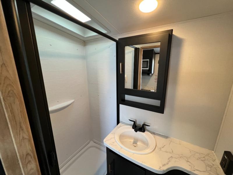 Looking to sleep like a king after hiking, biking or relaxing around the campsite? This trailer provides a rear slide king bed giving you more interior floor space and a comfortable place to sleep each night. Your friends can sleep on the front flip-down bunk beds and/or the sofa sleeper and booth dinette. The cook will have full kitchen amenities to whip up meals including a 10 cu. ft. refrigerator unless you would prefer the 8 cu. ft. option. There is an LCD TV to watch while sitting on the furniture while you take turns getting cleaned up in the full bathroom which also includes linen storage.