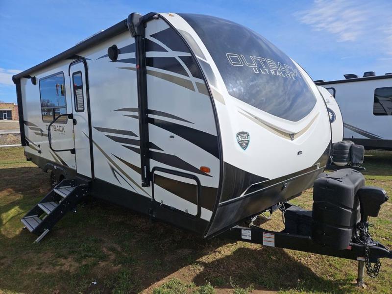 With any Outback Ultra Lite travel trailer or toy hauler by Keystone, you begin with a BAL Norco huck bolted "Z" channel frame, and there is a pinch rolled laminated gel-coated fiberglass exterior, a leaf spring suspension system, large panoramic black framed tinted safety glass windows, plus a power tongue jack and LCI power stabilizing jacks for easy setup. The interior offers pre-drilled and screwed hand-glazed modern cabinetry, extra tall slide height for maximum space, in-floor heating ducts, a Dream dinette with max-store for more storage space, and an On Demand hot water heater to mention a few highlights. Make your lightweight towing decision today, choose a comfortable and stylish Outback Ultra Lite today!