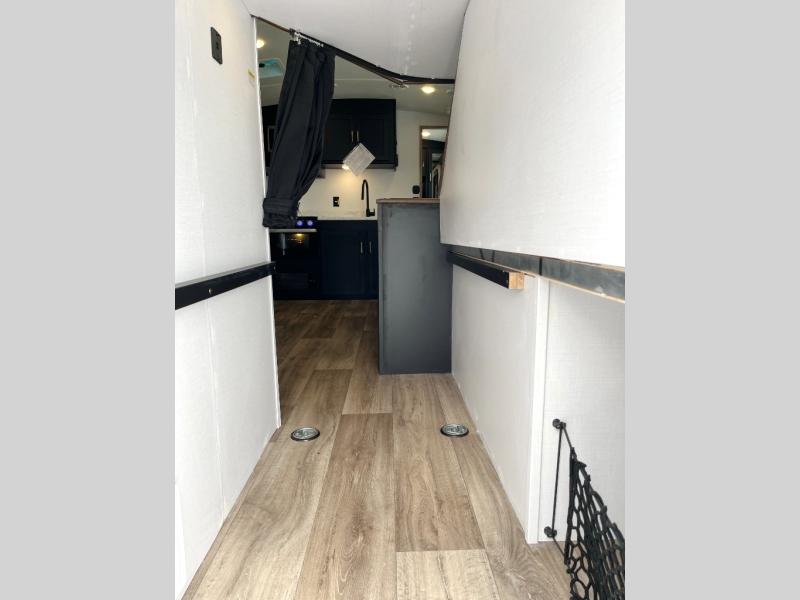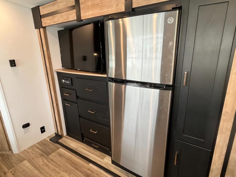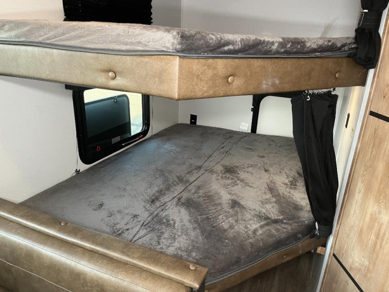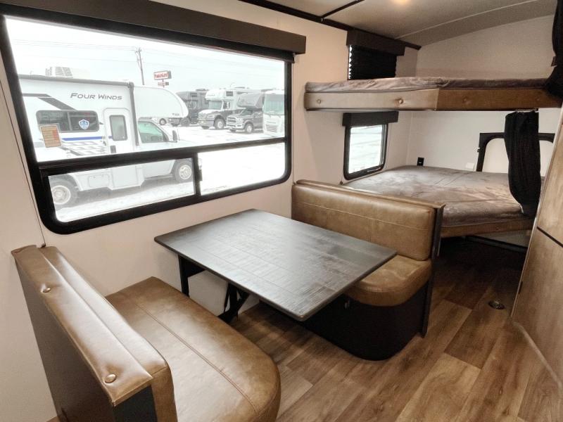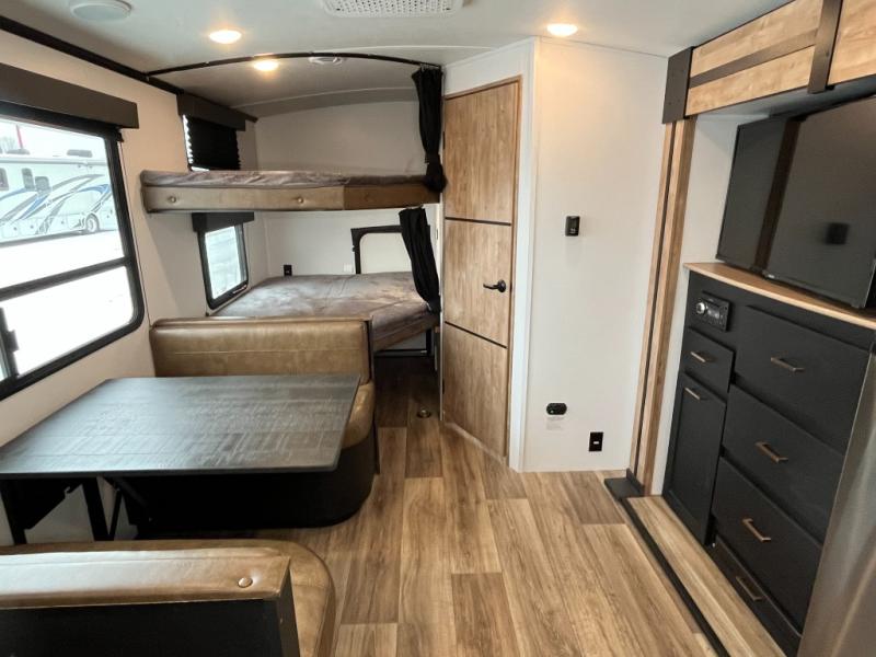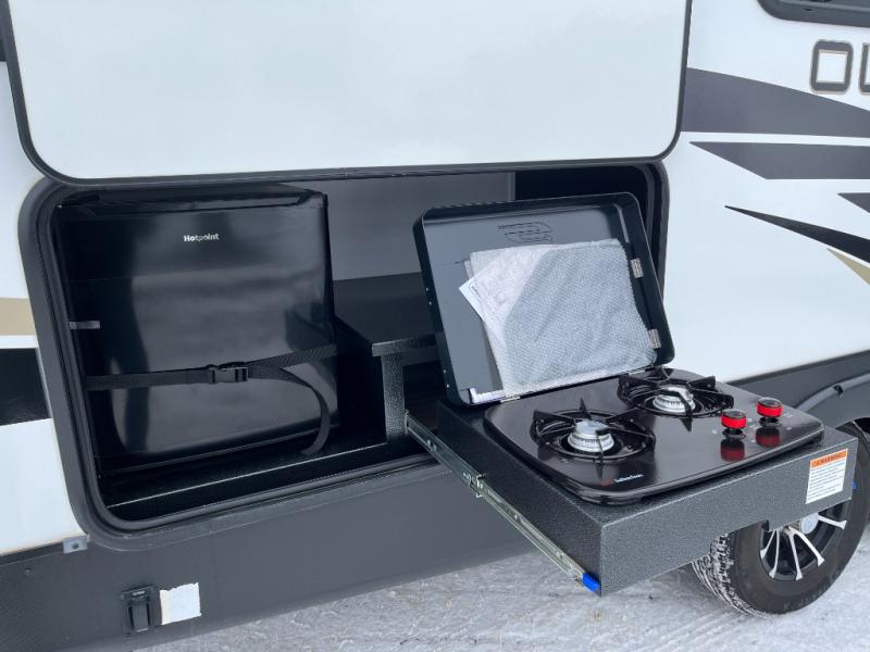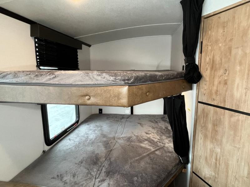 Why not enjoy double-the-fun when you camp next time! There is a set of double-size bunks in the rear corner with storage underneath. You can easily pack bikes or cargo through the rear exterior bike/cargo door for them to safely travel inside. The booth dinette offers a great place to dine and visit while the cook utilizes all the kitchen appliances and you watch the 40" TV. There are handy pull-out dog dishes, shoe storage and a counter extension for more space to dry the dishes and such. The rear corner full bathroom will keep everyone refreshed, the outside kitchen gives the cook more choices when making meals, plus the front bedroom allows you to sleep like a queen, and your pet to have their own space.