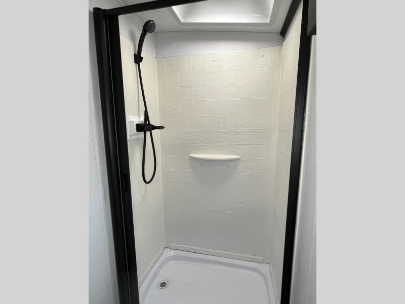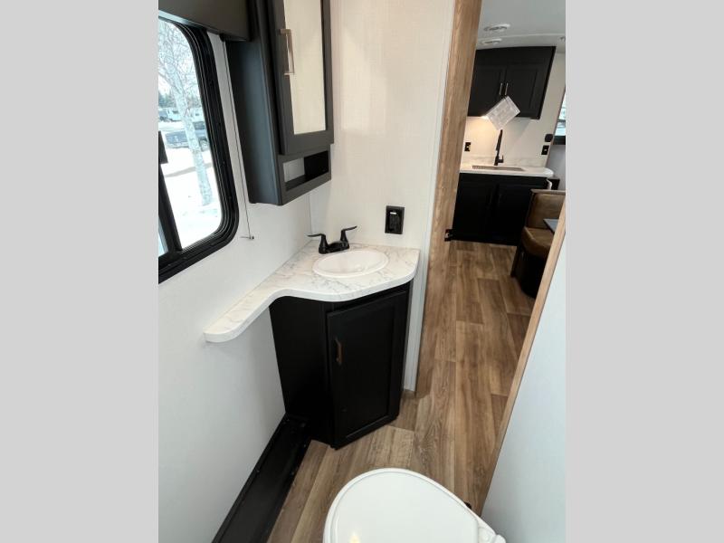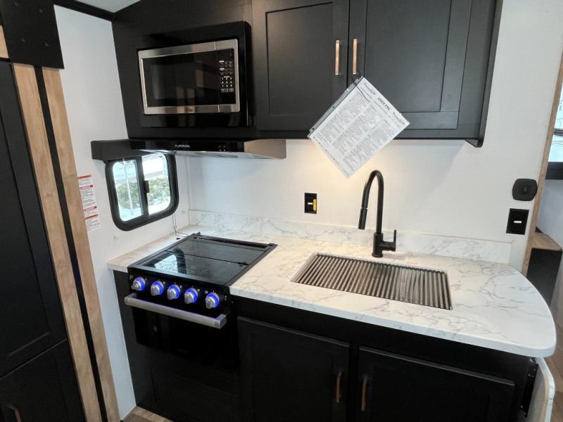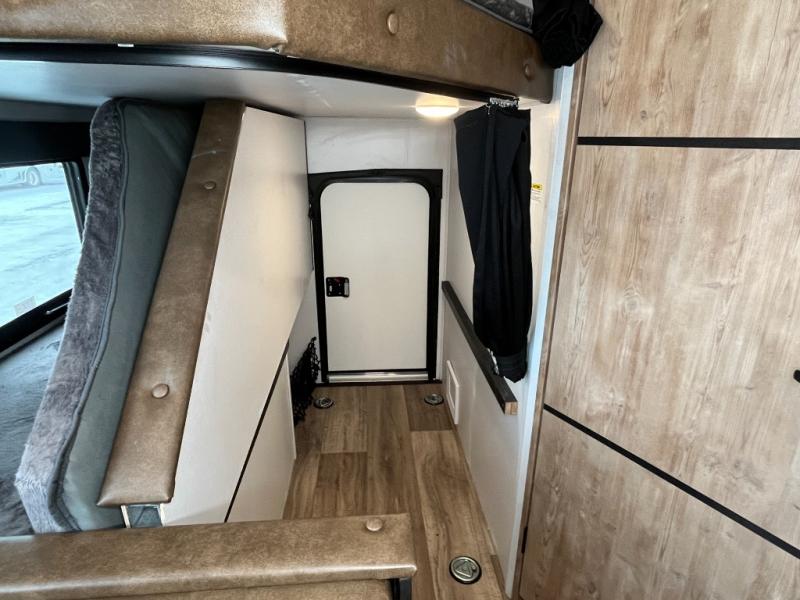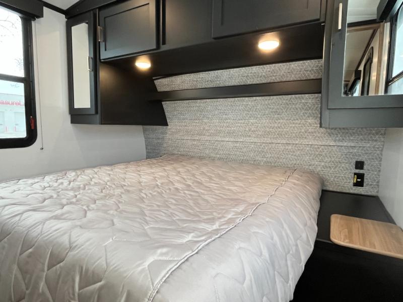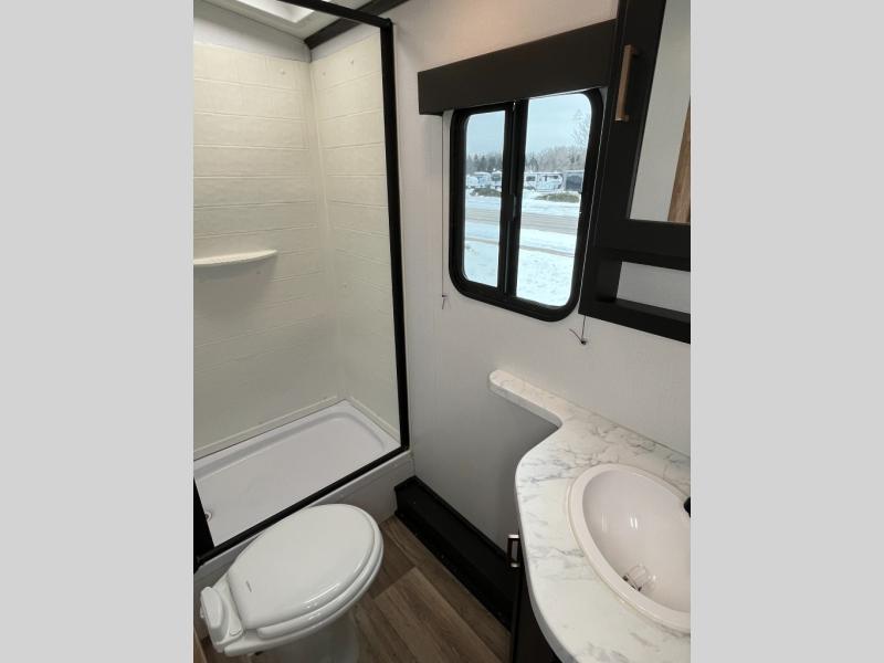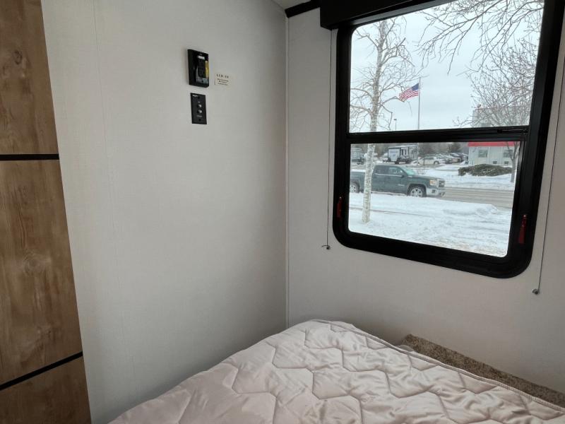 Why not enjoy double-the-fun when you camp next time! There is a set of double-size bunks in the rear corner with storage underneath. You can easily pack bikes or cargo through the rear exterior bike/cargo door for them to safely travel inside. The booth dinette offers a great place to dine and visit while the cook utilizes all the kitchen appliances and you watch the 40" TV. There are handy pull-out dog dishes, shoe storage and a counter extension for more space to dry the dishes and such. The rear corner full bathroom will keep everyone refreshed, the outside kitchen gives the cook more choices when making meals, plus the front bedroom allows you to sleep like a queen, and your pet to have their own space.