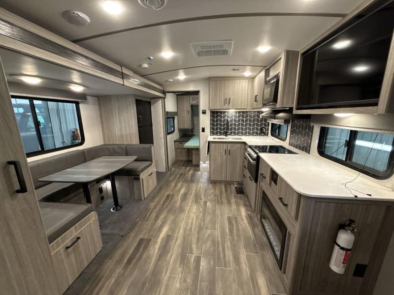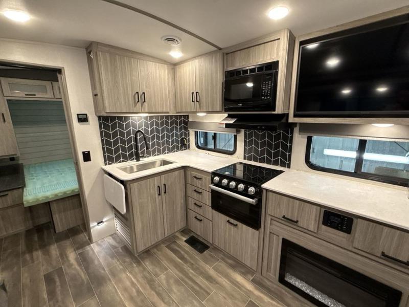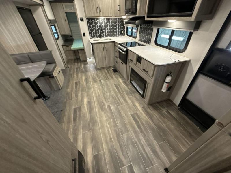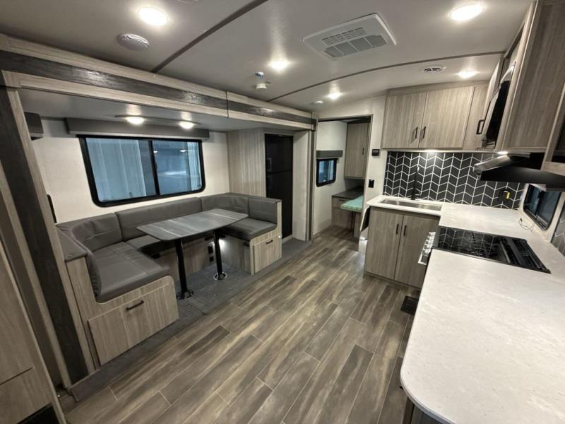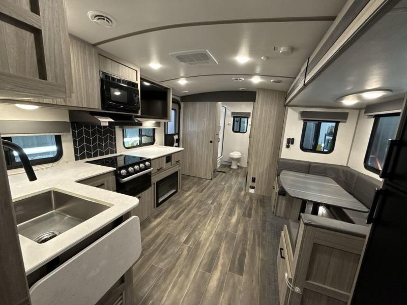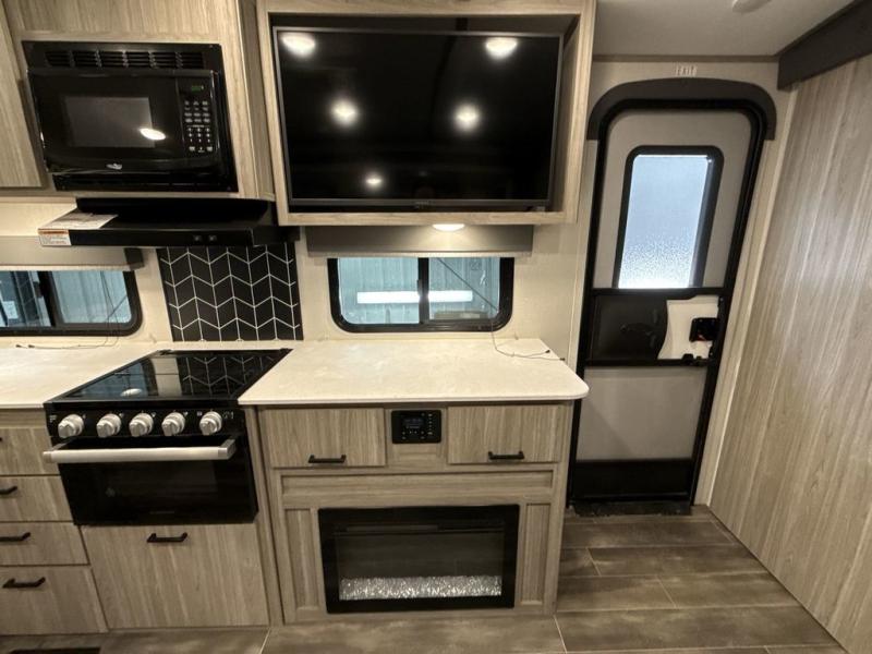 You won't even feel like you're camping in the woods with this travel trailer! It features a front private bedroom with a queen bed to lay your head on at night and wardrobes/nightstands on either side of it for your items. Prepare your best home cooked meals with the three burner cooktop and flip-up countertop then enjoy them at the U-shaped dinette with the refrigerator right next to it so you don't have to go far for a drink refill. The dinette is also across from the entertainment center with a fireplace for a cozy evening indoors, plus you can switch out the dinette for an optional theater dinette. The full rear bathroom has a dual sink vanity for two to get ready at once and an area prepped to add an optional washer and dryer for clean clothes the whole trip!