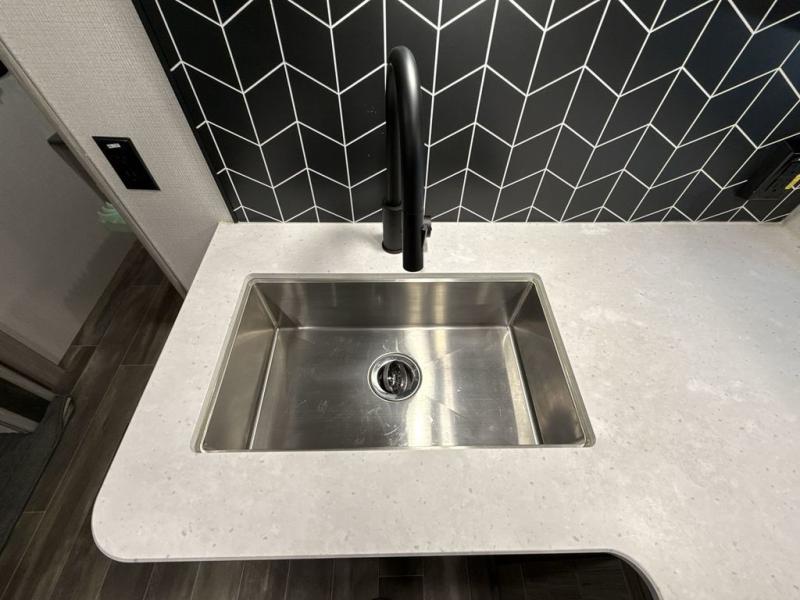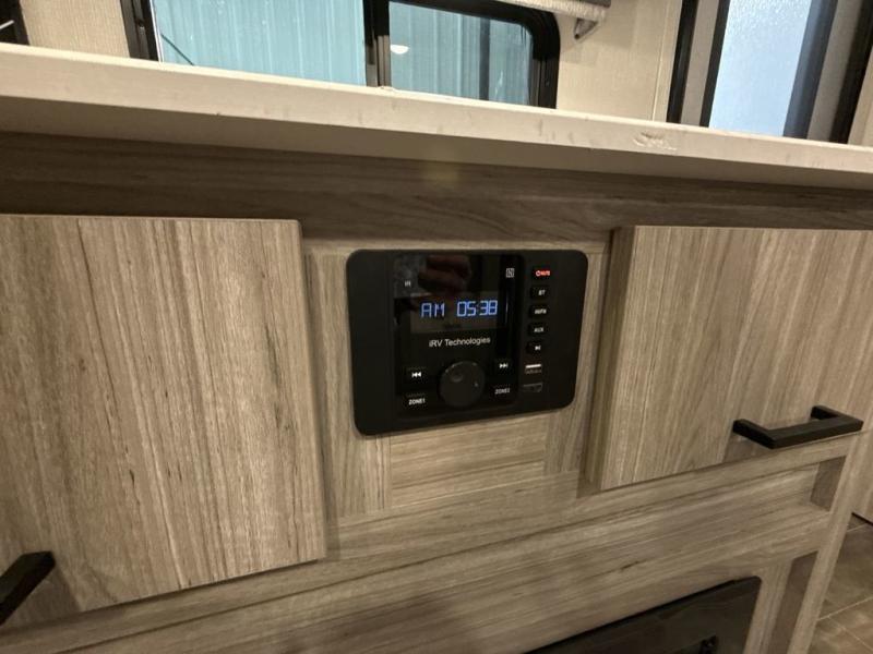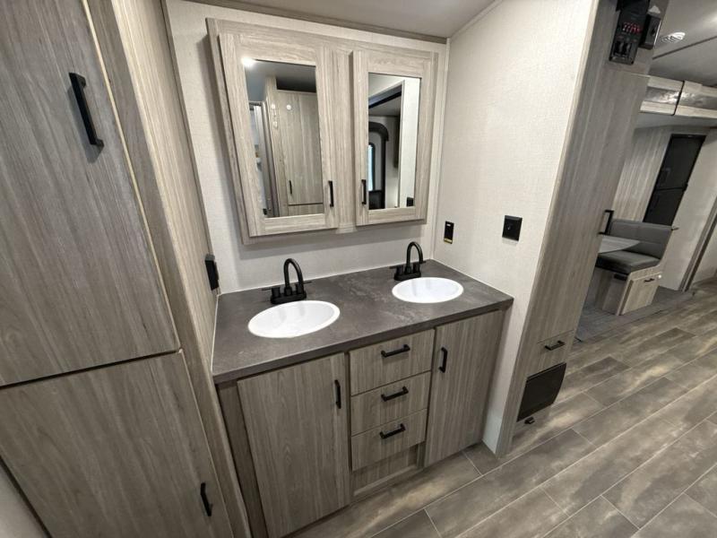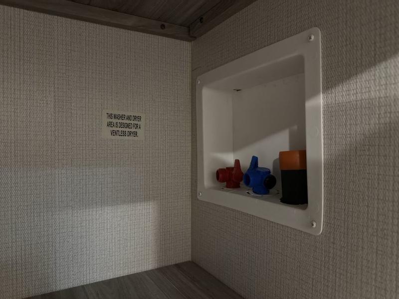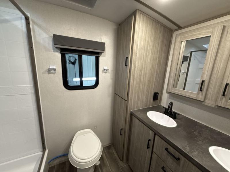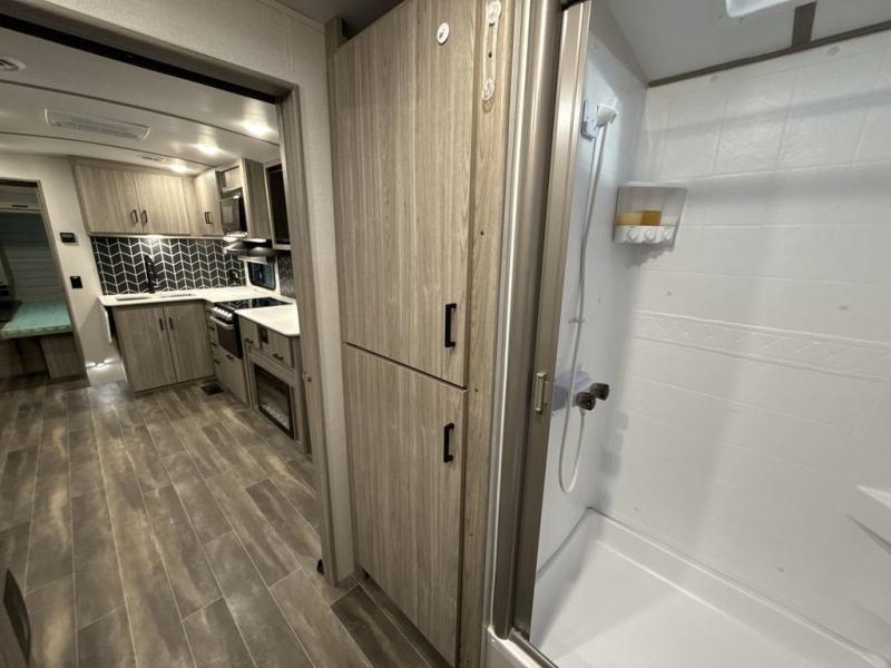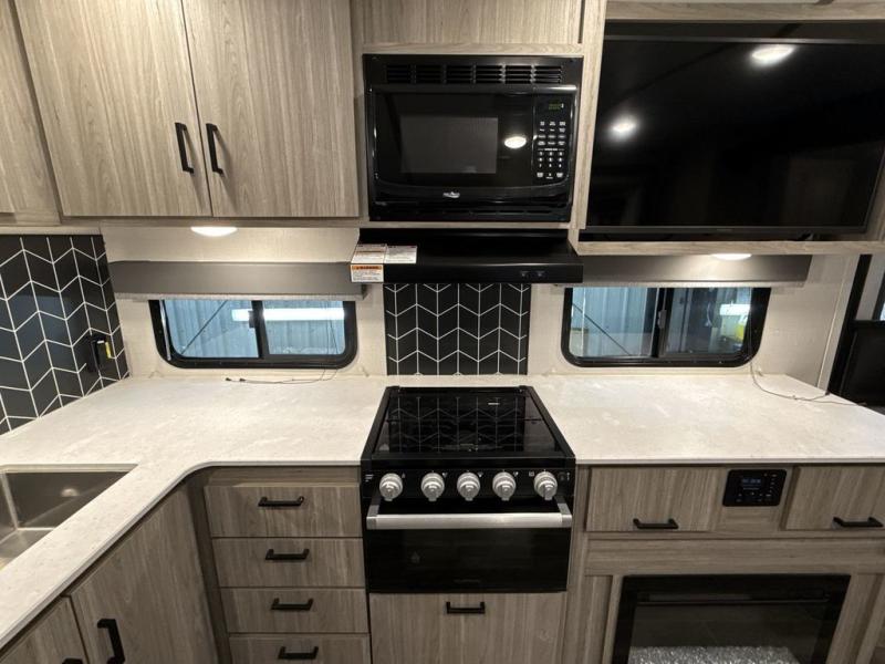 You won't even feel like you're camping in the woods with this travel trailer! It features a front private bedroom with a queen bed to lay your head on at night and wardrobes/nightstands on either side of it for your items. Prepare your best home cooked meals with the three burner cooktop and flip-up countertop then enjoy them at the U-shaped dinette with the refrigerator right next to it so you don't have to go far for a drink refill. The dinette is also across from the entertainment center with a fireplace for a cozy evening indoors, plus you can switch out the dinette for an optional theater dinette. The full rear bathroom has a dual sink vanity for two to get ready at once and an area prepped to add an optional washer and dryer for clean clothes the whole trip!