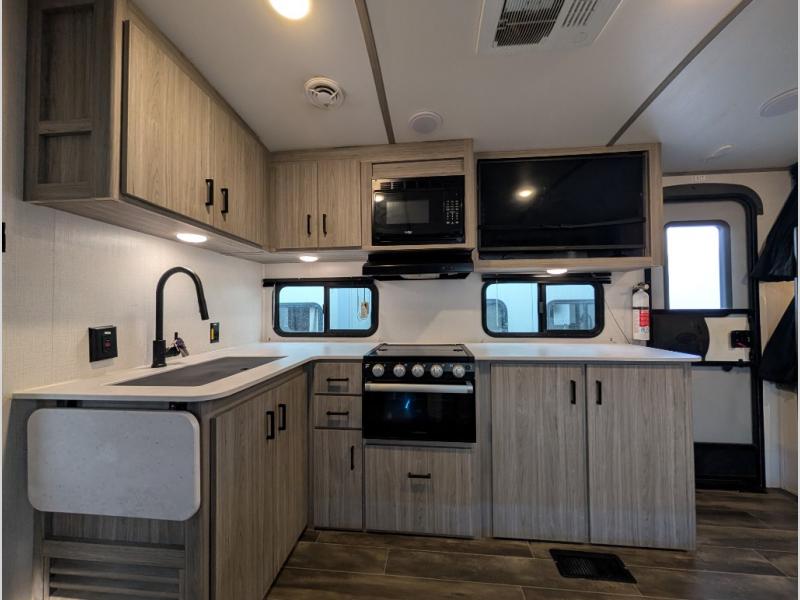 The whole family can comfortably camp in this travel trailer! The kiddos can sleep on the set of 51" x 74" double bunk beds with the flip up bunk for added storage space and a ladder to safely reach the top. They are conveniently next to the rear corner bathroom too for easy access at night. You will have your own privacy with the front private bedroom which has a queen bed with wardrobes and nightstands on either side to set a glass of water. The chef will enjoy preparing their best meals with the three burner cooktop and flip-up countertop, but love cooking at the outside kitchen even more with a pull-out cooktop and refrigerator. Enjoy your meals at the U-shaped dinette or switch it out for the optional theater dinette instead!