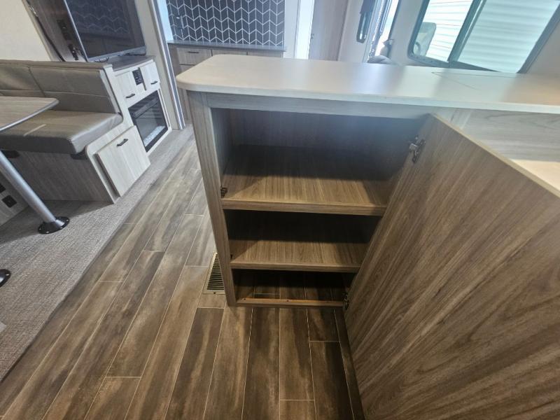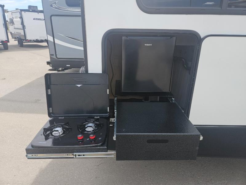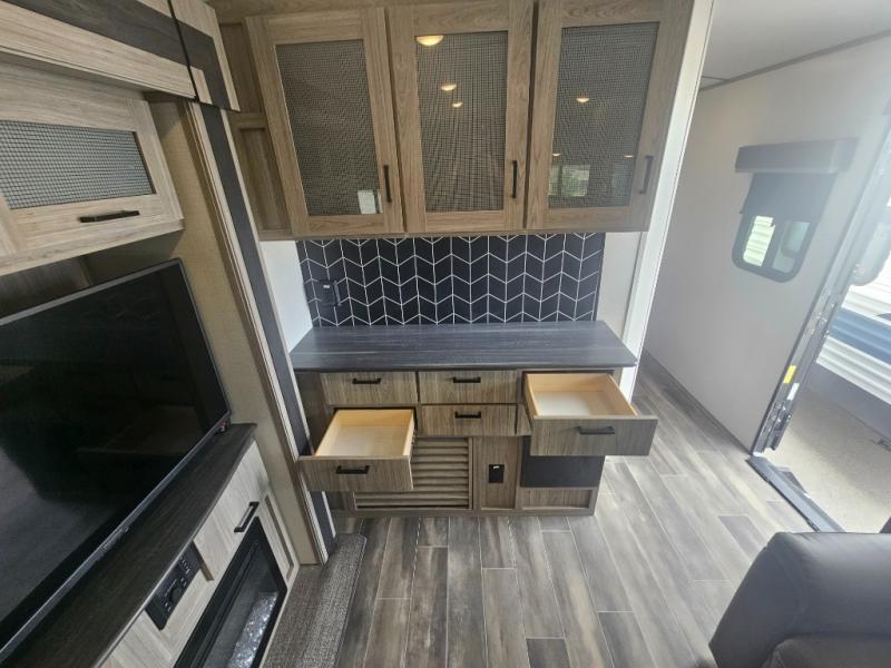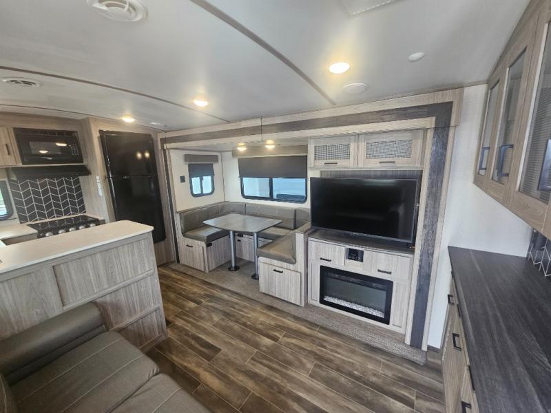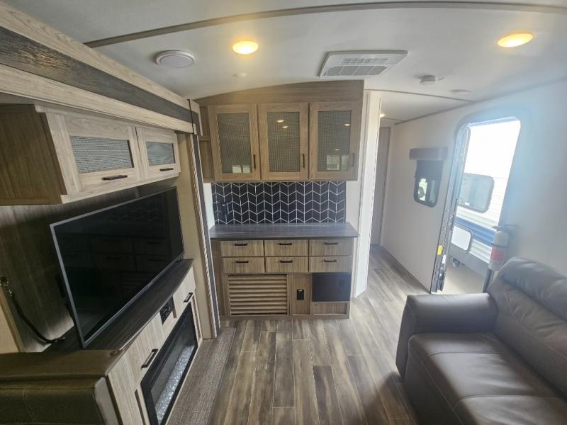 This travel trailer is decked out in comforts! The rear kitchen has everything you need to prepare your best home cooked meals including a raised countertop with trash can storage. Enjoy your meals at the U-shaped dinette or switch it out for the optional free standing dinette. Relax in the theater seats or optional tri-fold sofa sleeper across from the entertainment center with storage, a TV, and a fireplace for a cozy evening indoors. Get a good night's rest on the queen bed in the front private bedroom and keep your clothes looking their best with the closet and wardrobes on either side of the bed. You even have an outside kitchen to grill some juicy burgers on the pull-out cooktop while watching the others play a game of cornhole!