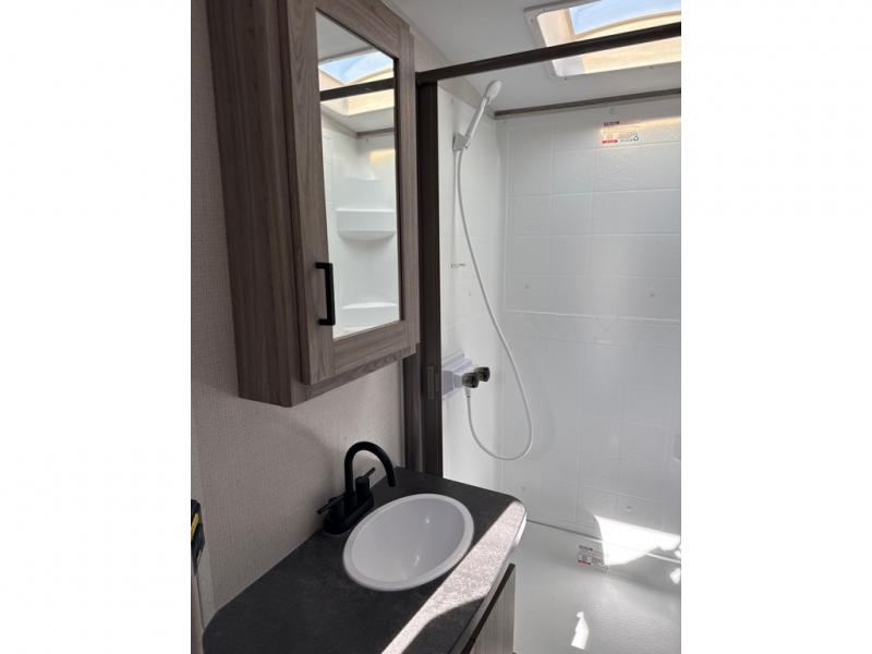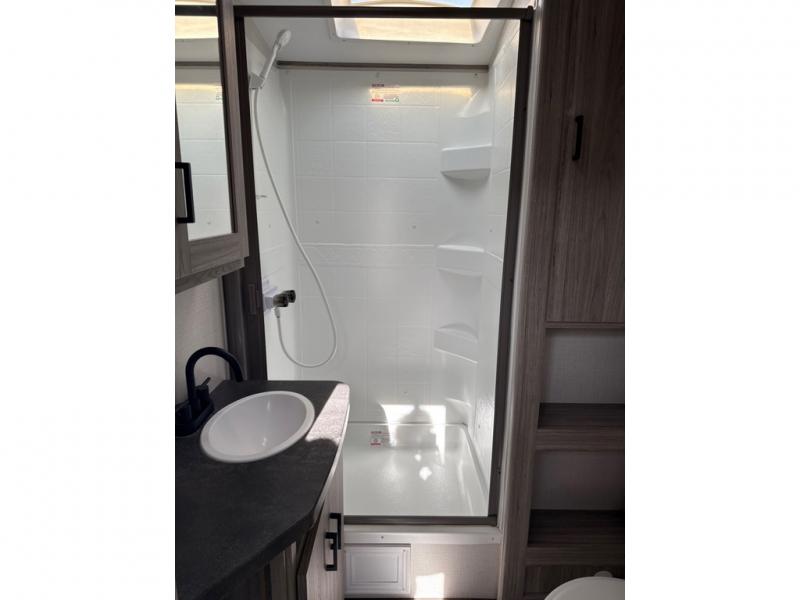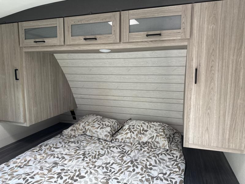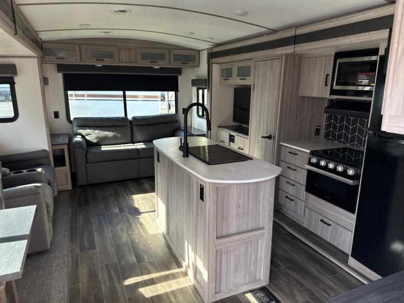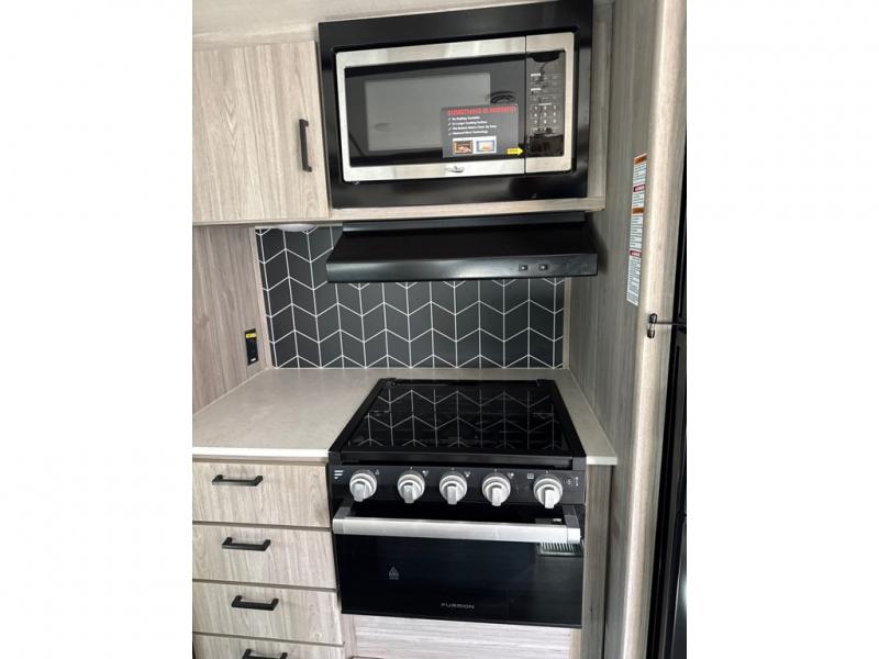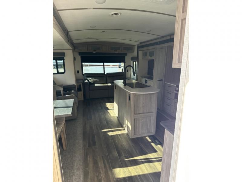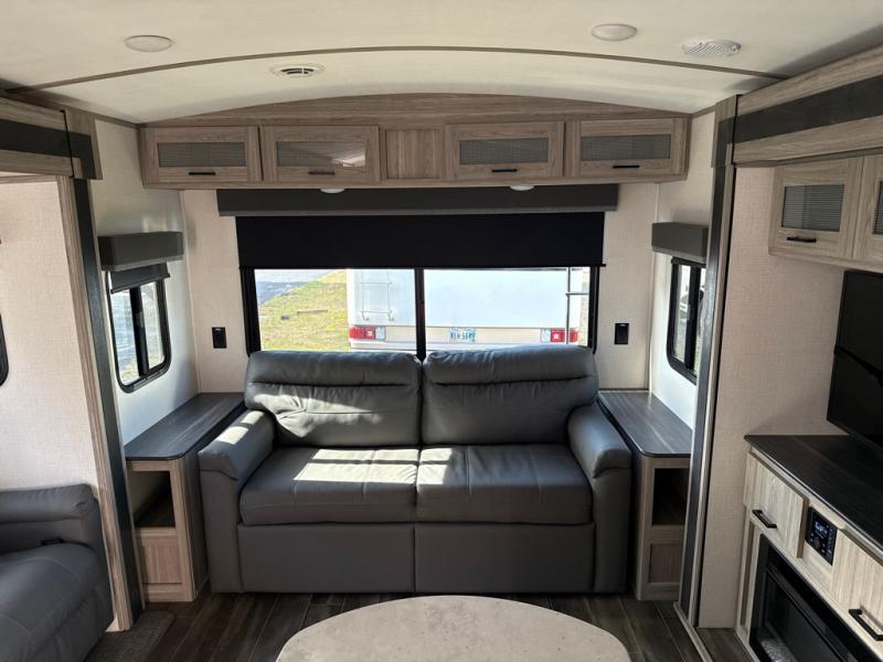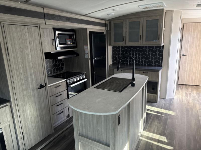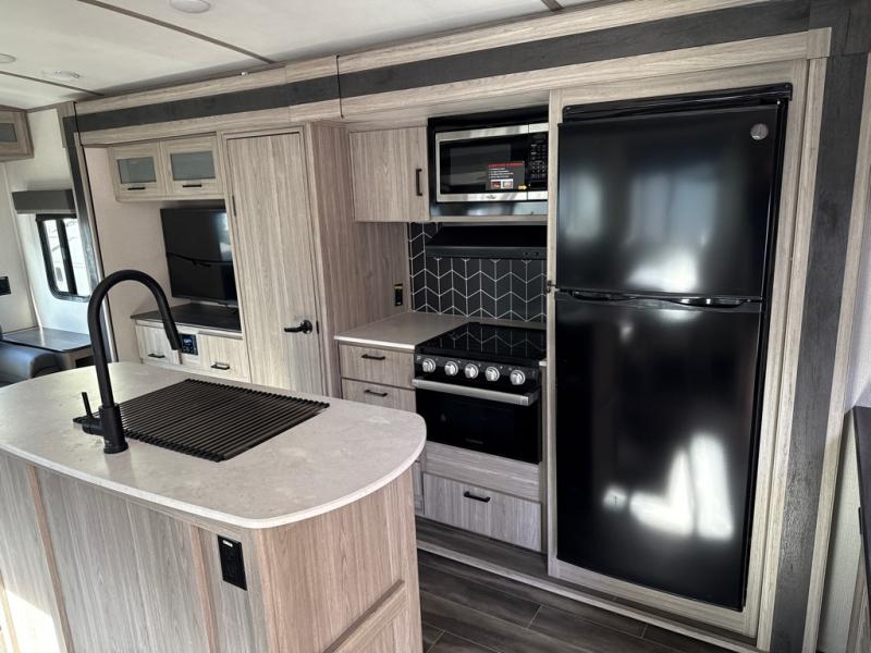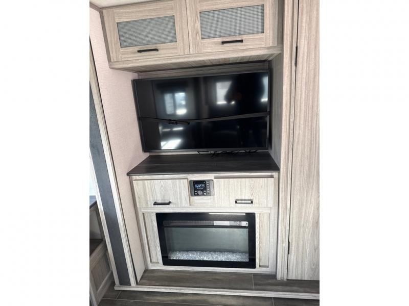 Pack your bags and hitch up this travel trailer for a fun weekend getaway! The rear living area has a tri-fold sofa sleeper with end tables to set your bag of popcorn that was popped in the microwave and theater seating across from the entertainment center with a TV and a fireplace. The kitchen island will make meal prepping easier and you can enjoy your meals at the booth dinette or switch it out for the optional free standing dinette. Freshen up in the full bathroom with the shower that has a skylight above for more natural lighting. Head to the front private bedroom when you're ready to wind down your nights and get a good night's rest on the queen bed with nightstands and wardrobes on either side of it!