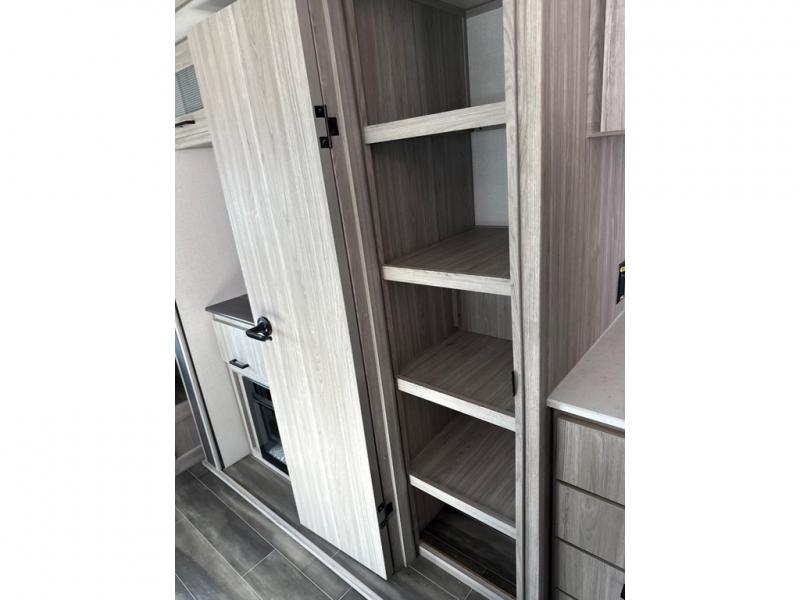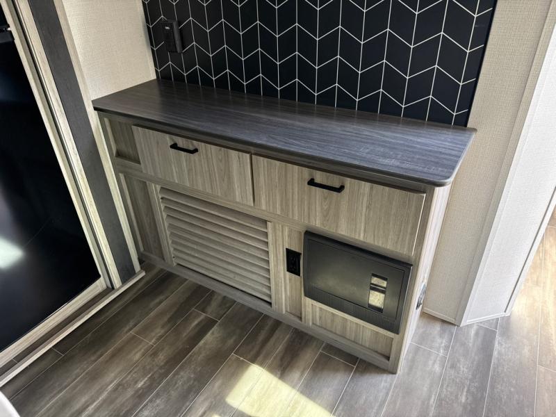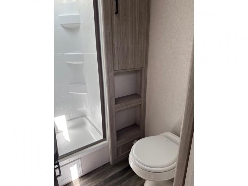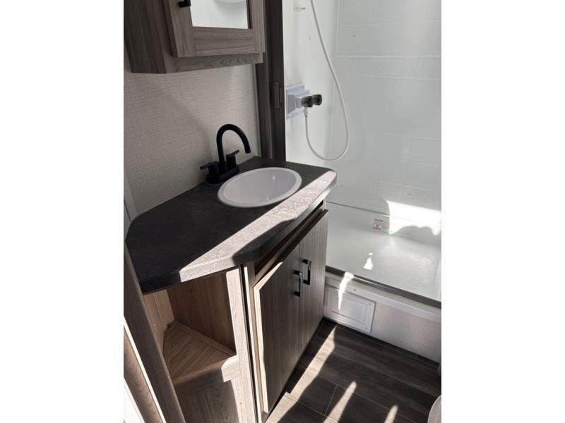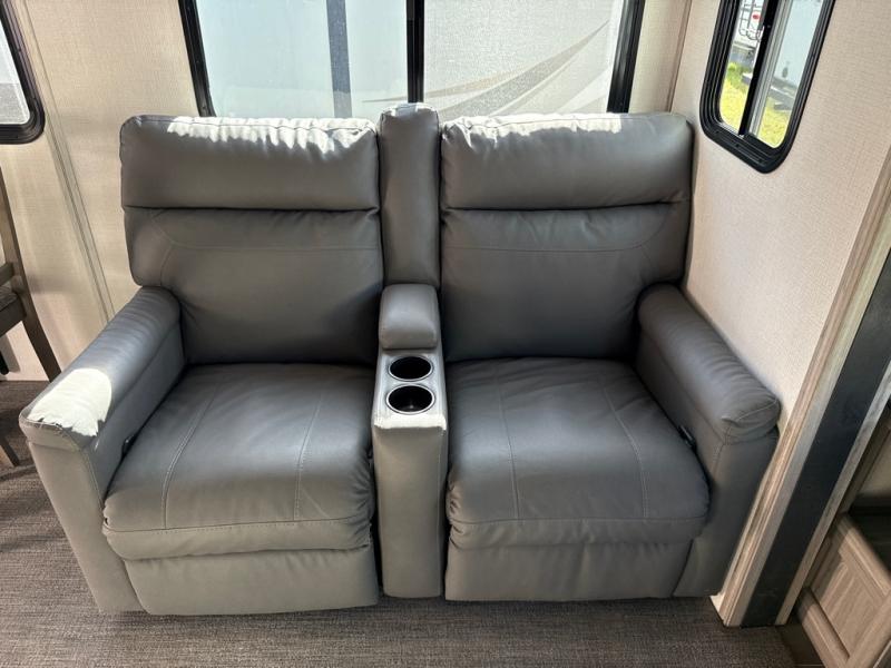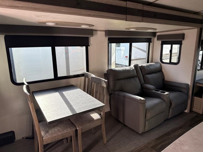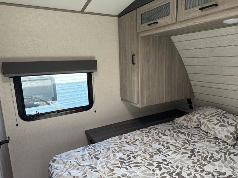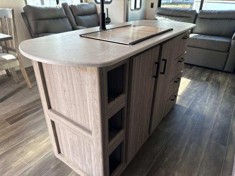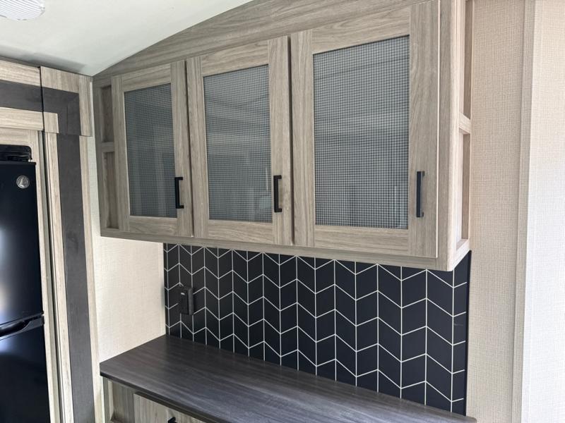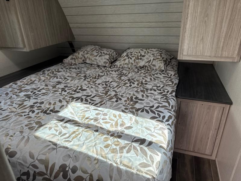 Pack your bags and hitch up this travel trailer for a fun weekend getaway! The rear living area has a tri-fold sofa sleeper with end tables to set your bag of popcorn that was popped in the microwave and theater seating across from the entertainment center with a TV and a fireplace. The kitchen island will make meal prepping easier and you can enjoy your meals at the booth dinette or switch it out for the optional free standing dinette. Freshen up in the full bathroom with the shower that has a skylight above for more natural lighting. Head to the front private bedroom when you're ready to wind down your nights and get a good night's rest on the queen bed with nightstands and wardrobes on either side of it!