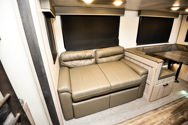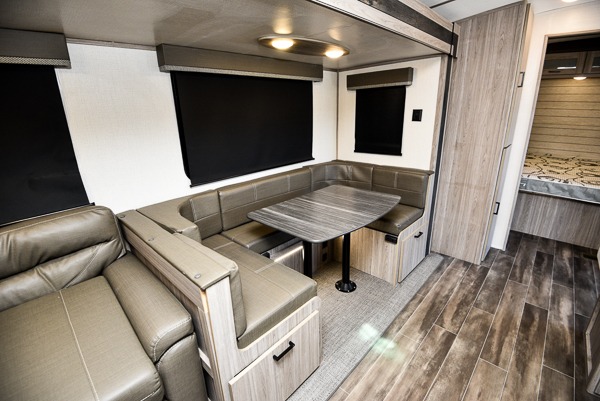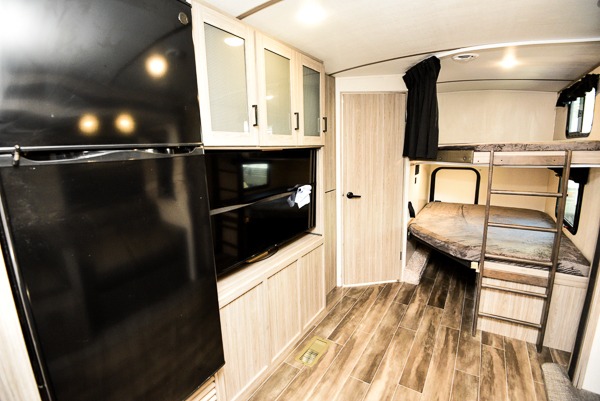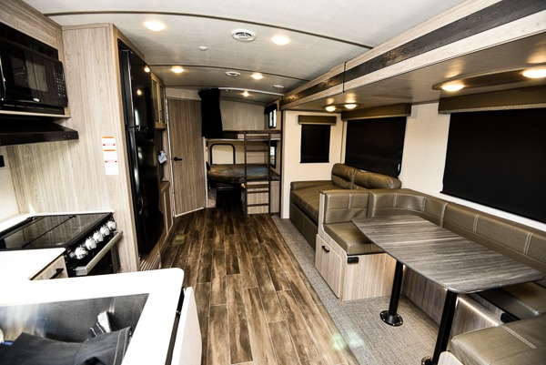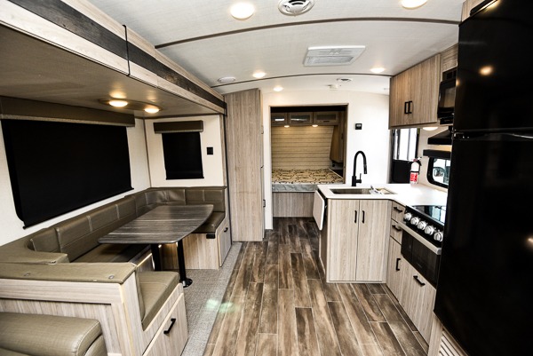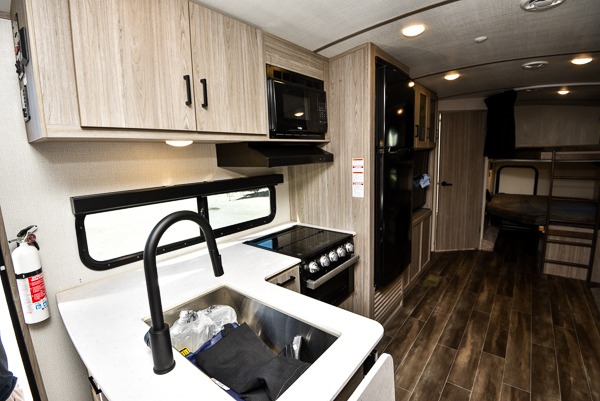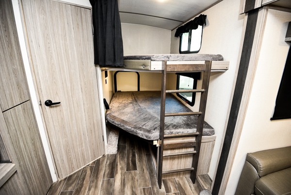 With dual entry doors, you can easily enter and exit this travel trailer! One of the entrances even leads directly into the rear corner bathroom so you can get back to having fun outdoors fast. The set of 51" x 74" bunk beds has a flip-up bottom bunk for storage space and a ladder to safely reach the top. The tri-fold sofa sleeper and U-shaped dinette slide opens up the living/kitchen area and they can be switched out for the optional pivot furniture which can flip back and forth for a dinette or sofa position. Create delicious home cooked meals with the three burner cooktop and flip-up countertop or head to the outside kitchen to breathe in some fresh air while cooking dinner. The exterior also has front pass-through storage, a rear exterior storage area, a cargo door, and a 21' power awning to protect you rain or shine!