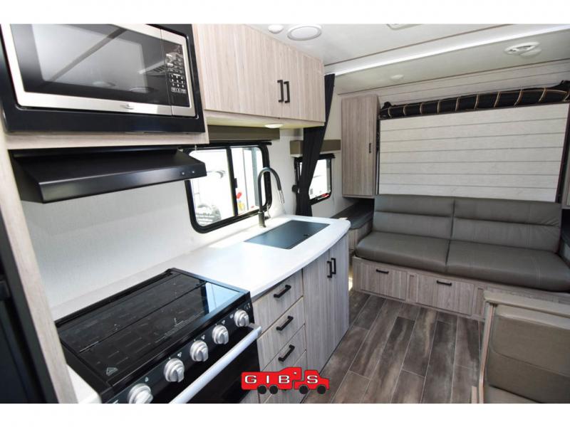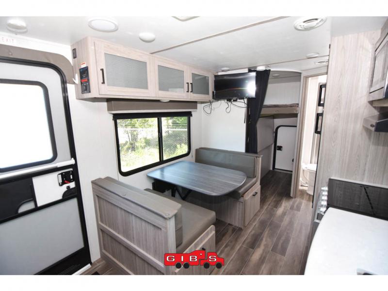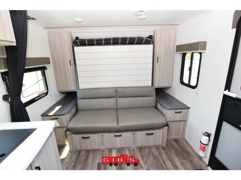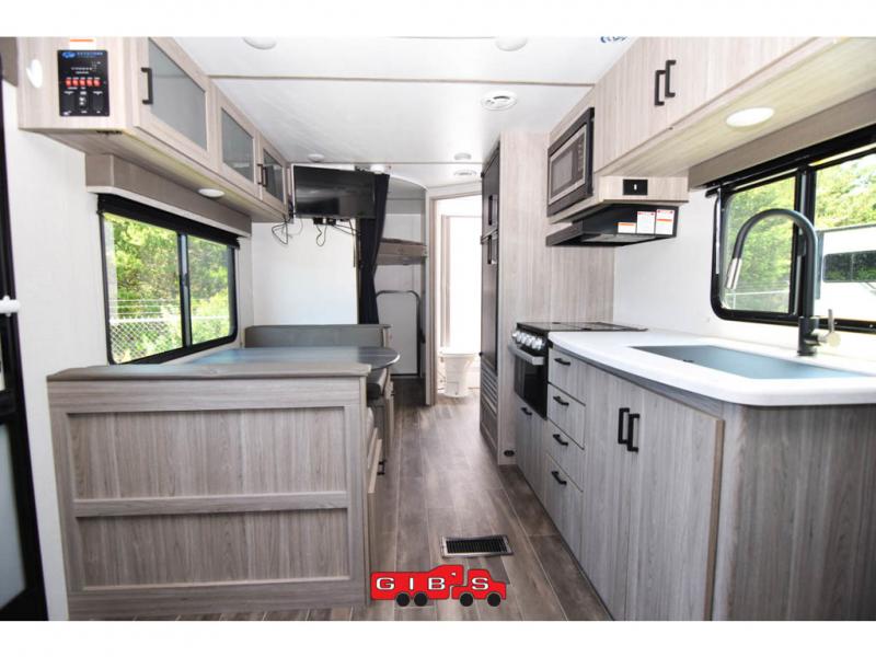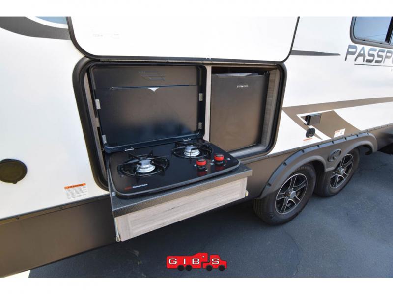 This Passport SL travel trailer has a functional interior that allows you to have lots of sleeping space without taking up too much interior space! The 51" x 74" double size bunks can accommodate travel gear when you use the exterior rear cargo door with the flip up bunk. The Murphy bed can be pushed out of the way to reveal a sofa for afternoon lounging, and the booth dinette can also transform from a dining area into a sleeping area. Outside, you'll enjoy cooking some burgers at the outdoor kitchen while you stay protected underneath the 15' awning, and the pass-through storage is going to allow you to bring some extra equipment.