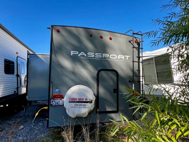 You will be able to take trip after trip with this Passport travel trailer! The interior has excellent amenities with its pantry with sliding doors, its privacy curtain in front of the Murphy bed, its U-shaped dinette that can provide an additional sleeping space, and its double size bunks that flip up so that you can store gear. When you're outside sitting around the campfire, you can grab some extra roasting sticks from the exterior pass-through storage compartment, and the outdoor kitchen will allow you to prepare something more detailed than s'mores.
