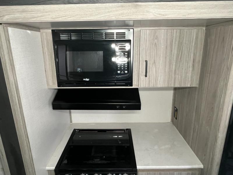You can take many different kinds of trips with this Passport SL travel trailer! Once you get to the campsite and set up the 19' awning, you can remove your travel gear from the exterior pass-through storage to create your own little retreat. On the interior, the front private bedroom provides you with a queen-size bed, nightstands, and bedside wardrobes so that you can easily get changed every morning and night. The large slide out in the main living area will add to the amount of living space on the interior without adding to the overall width of the trailer. As the night comes to a close, you can heat up a bag of popcorn in the microwave before sitting down in the theater seating which could be switched out for the optional tri-fold sofa sleeper.