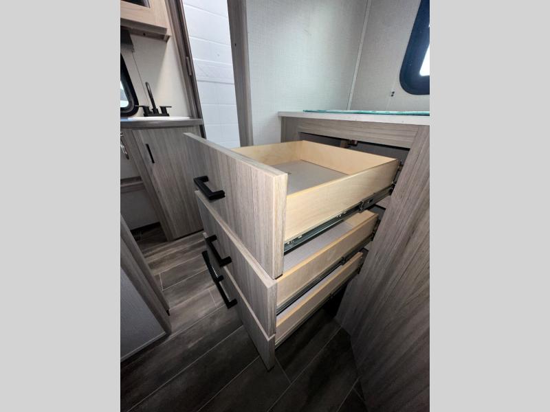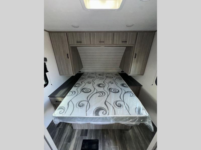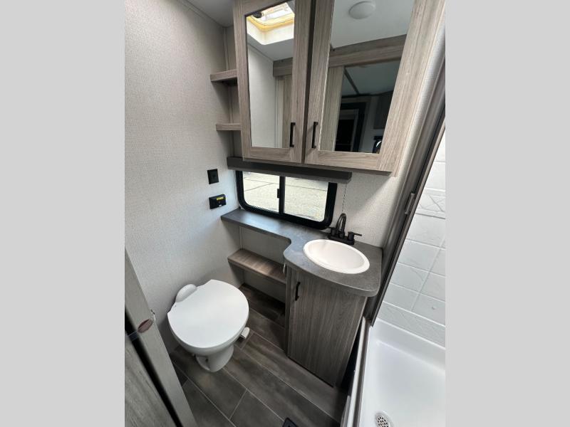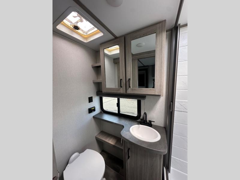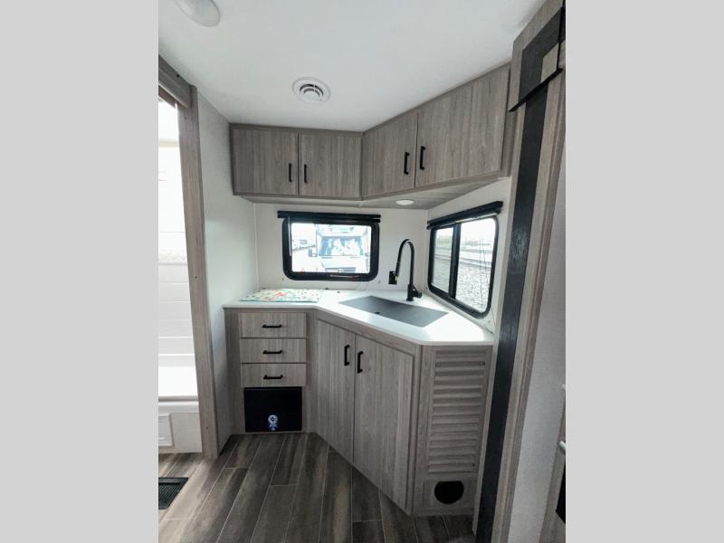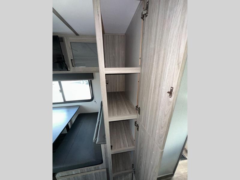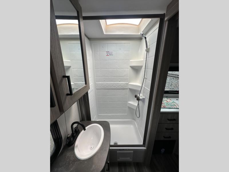 The Passport SL travel trailers by Keystone RV come in a compact design with travel-friendly lengths that are lightweight and easy to tow behind many smaller crossover SUVs. You will find several residential-style features such as durable Armstrong vinyl flooring, upgraded window treatments and valances, and bathroom countertops. The exterior shower with hot and cold water is very useful as you get cleaned up before entering the RV, wash your pets, or even rinse a few dishes outside. The Passport also now contains a HyperDeck flooring system which is a high-performance, water-resistant RV floor that comes as a breakthrough design from the Keystone Innovation Lab. This flooring is more resilient, stronger, and lighter than traditional laminated wood construction.