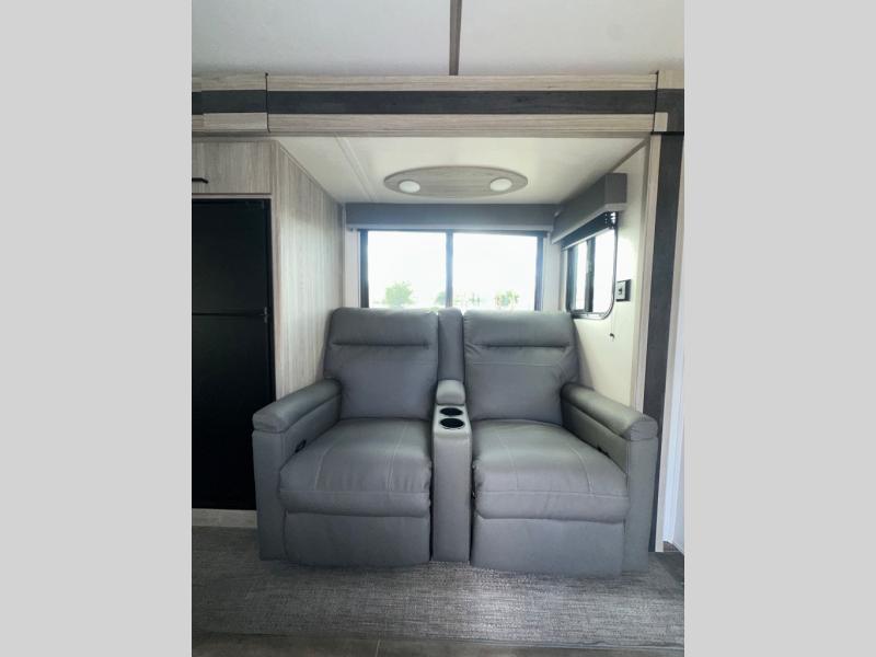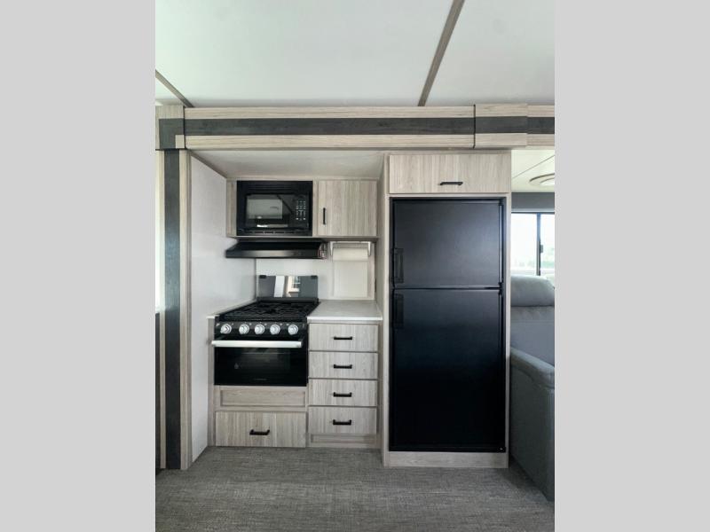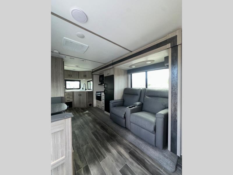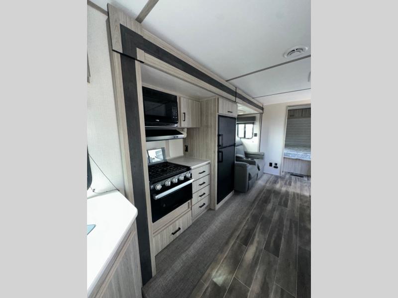 You can take many different kinds of trips with this Passport SL travel trailer! Once you get to the campsite and set up the 19' awning, you can remove your travel gear from the exterior pass-through storage to create your own little retreat. On the interior, the front private bedroom provides you with a queen-size bed, nightstands, and bedside wardrobes so that you can easily get changed every morning and night. The large slide out in the main living area will add to the amount of living space on the interior without adding to the overall width of the trailer. As the night comes to a close, you can heat up a bag of popcorn in the microwave before sitting down in the theater seating which could be switched out for the optional tri-fold sofa sleeper.