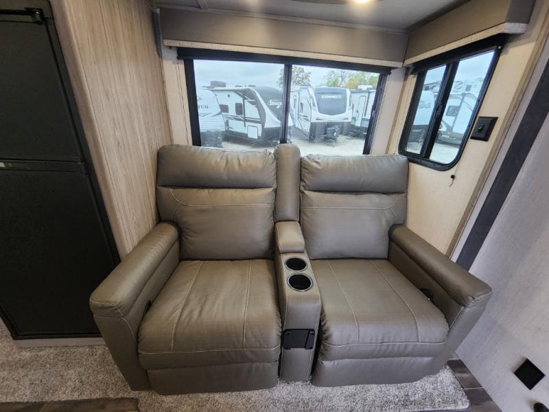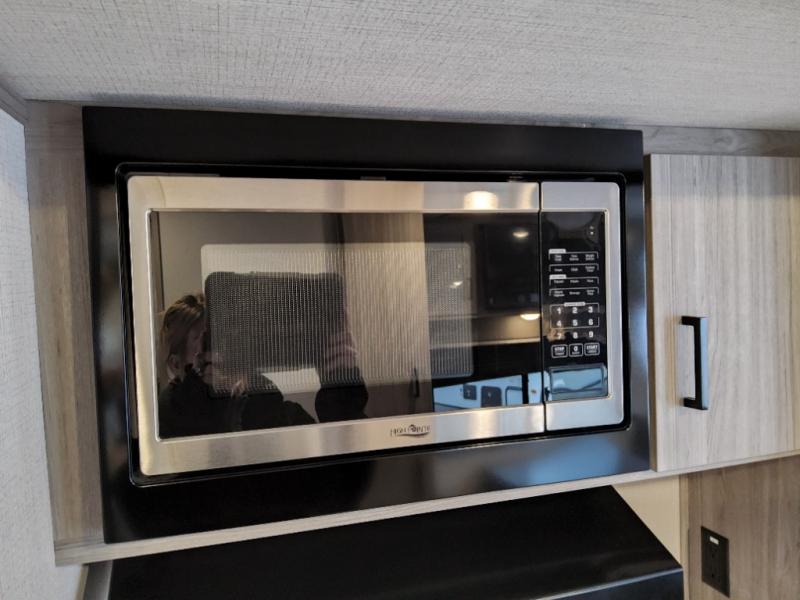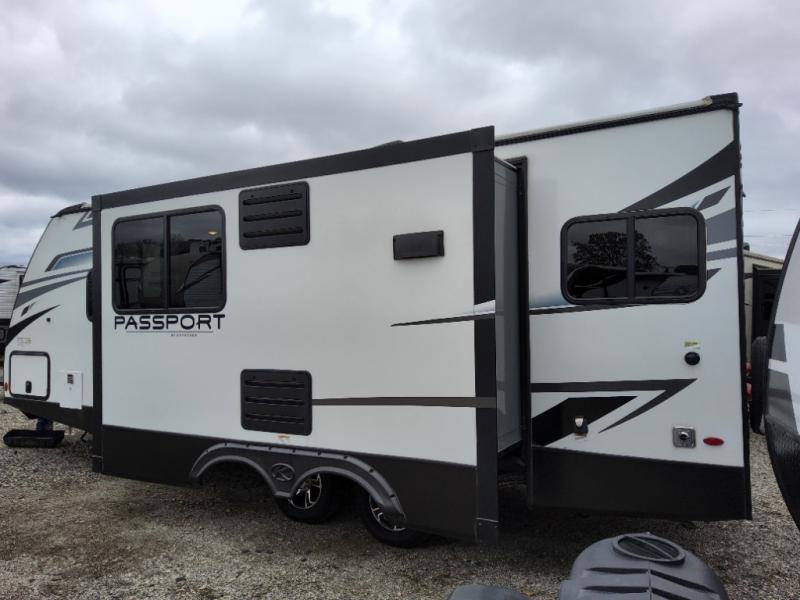 You can take many different kinds of trips with this Passport SL travel trailer! Once you get to the campsite and set up the 19' awning, you can remove your travel gear from the exterior pass-through storage to create your own little retreat. On the interior, the front private bedroom provides you with a queen-size bed, nightstands, and bedside wardrobes so that you can easily get changed every morning and night. The large slide out in the main living area will add to the amount of living space on the interior without adding to the overall width of the trailer. As the night comes to a close, you can heat up a bag of popcorn in the microwave before sitting down in the theater seating which could be switched out for the optional tri-fold sofa sleeper.